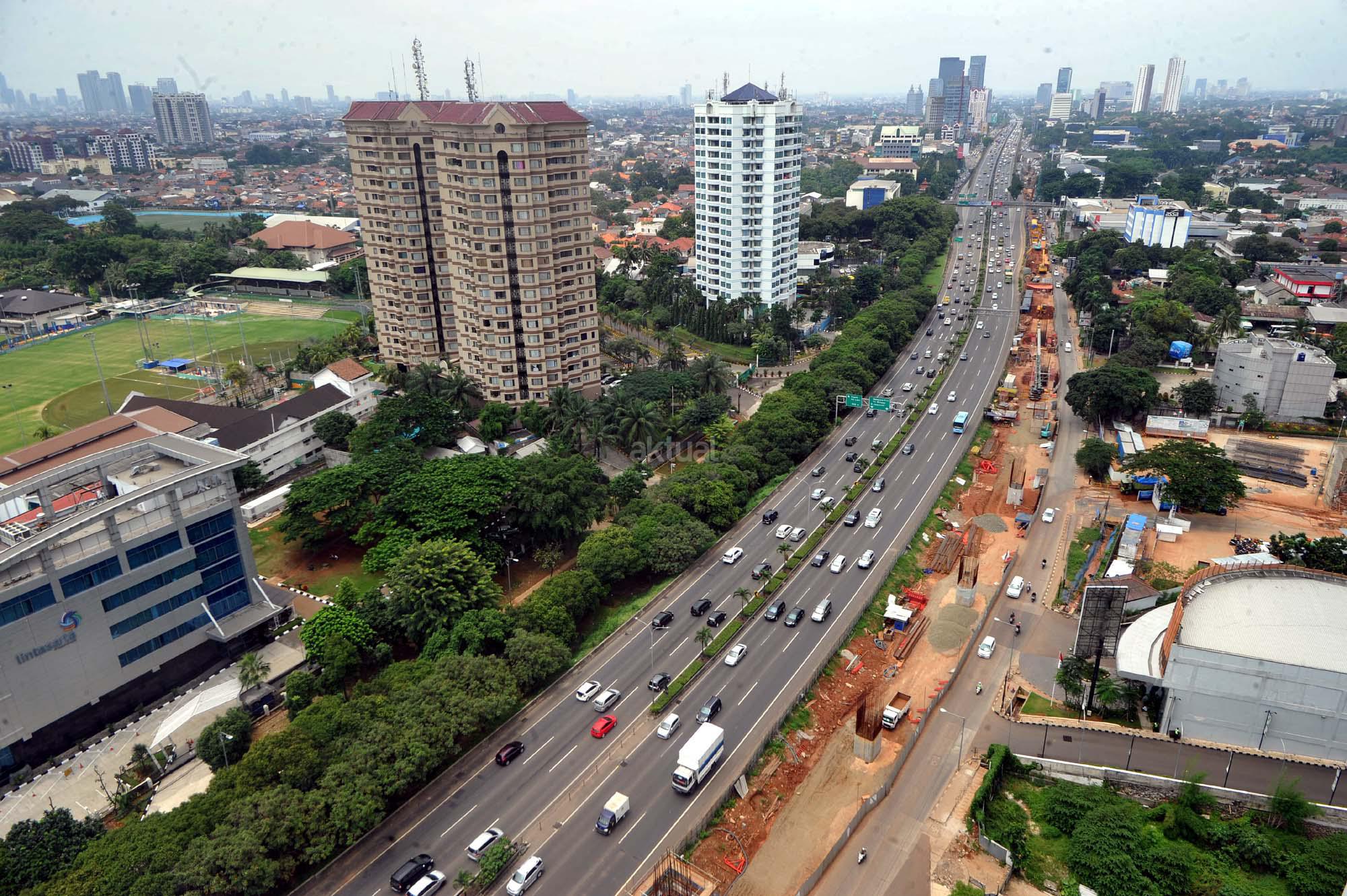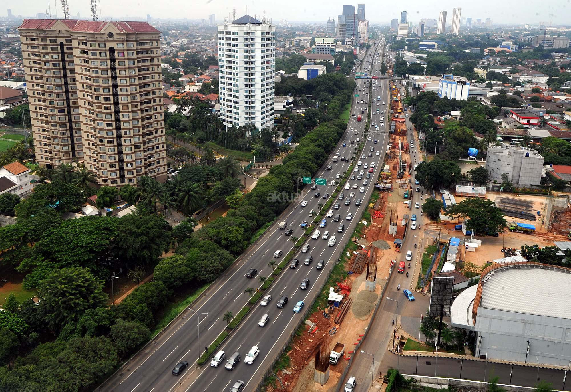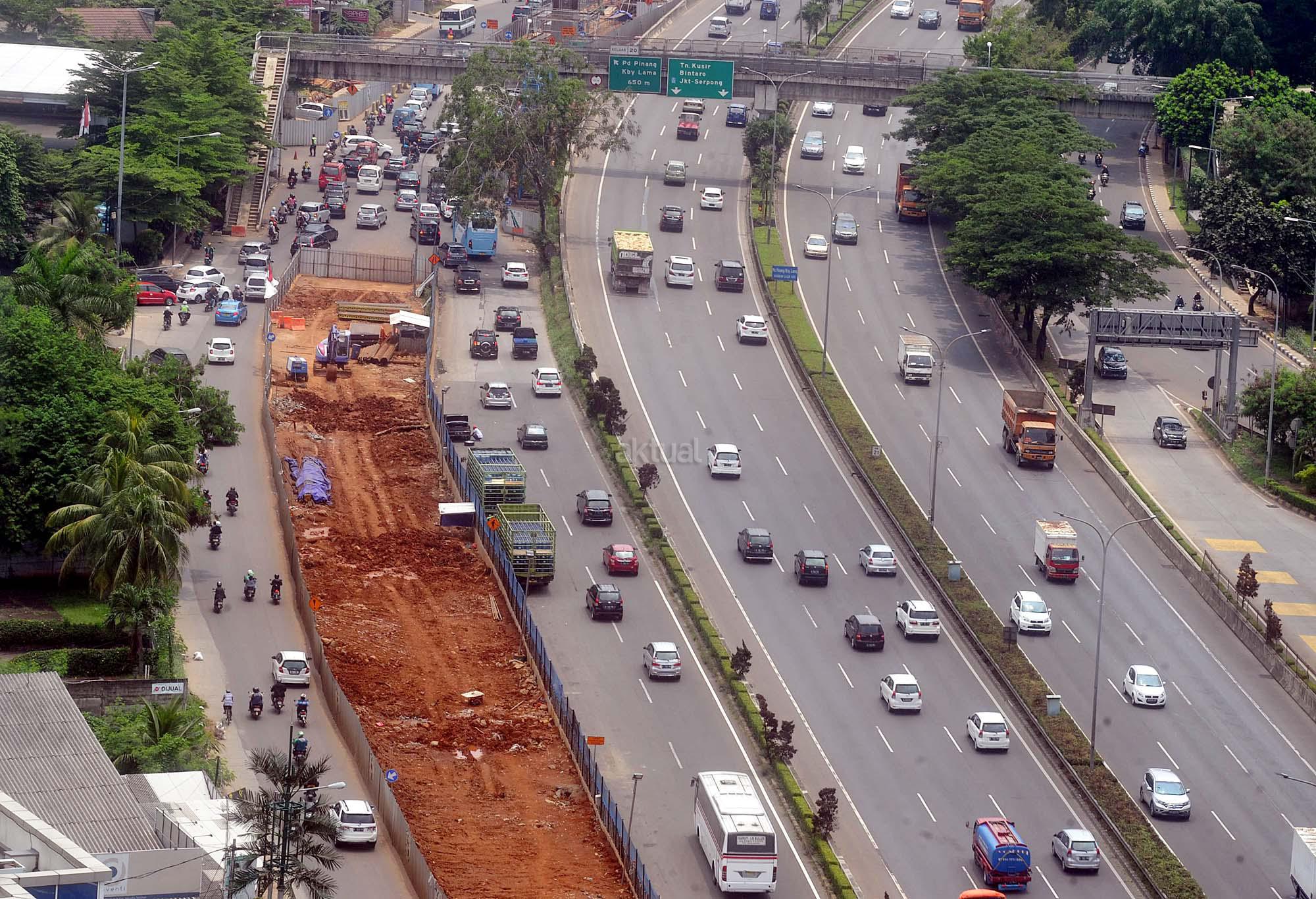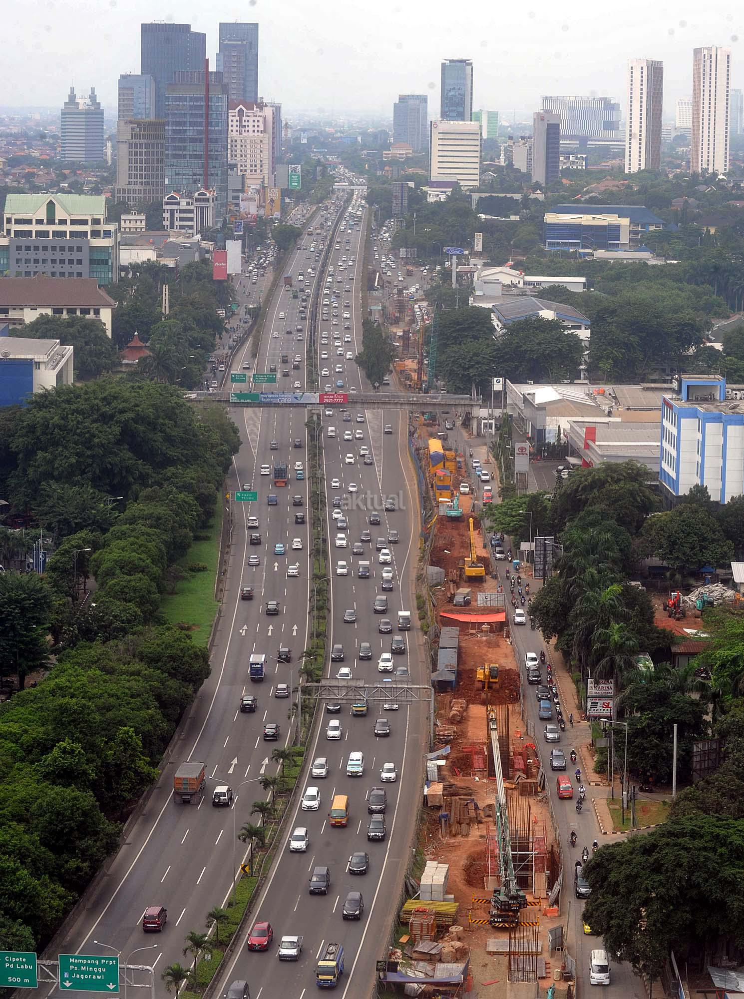 Kendaraan melewati kawasan pembangunan infrastruktur jalur layang Mass Rapid Transit (MRT) di Jalan TB Simatupang, Jakarta Selatan, Minggu (27/3). Gubernur DKI Jakarta Basuki Tjahaja Purnama memprediksi pengoperasian Mass Rapid Transit (MRT) akan molor dari jadwal yang telah ditargetkan. Hingga saat ini pembangunan MRT masih terkendala pembebasan lahan di Jalan Raya Fatmawati, Jakarta Selatan.