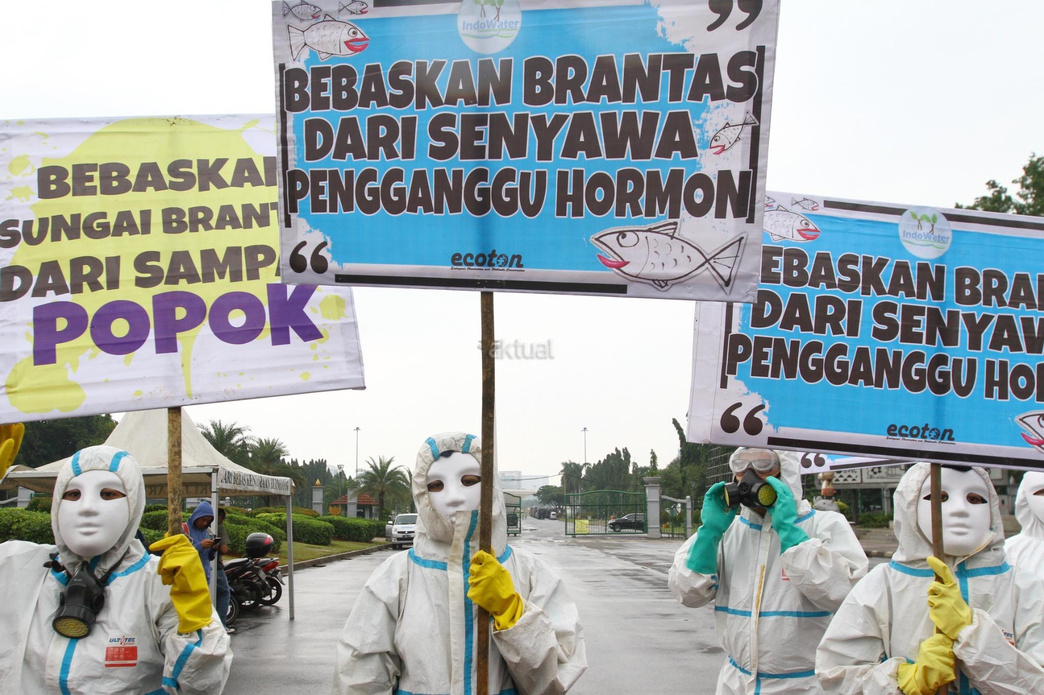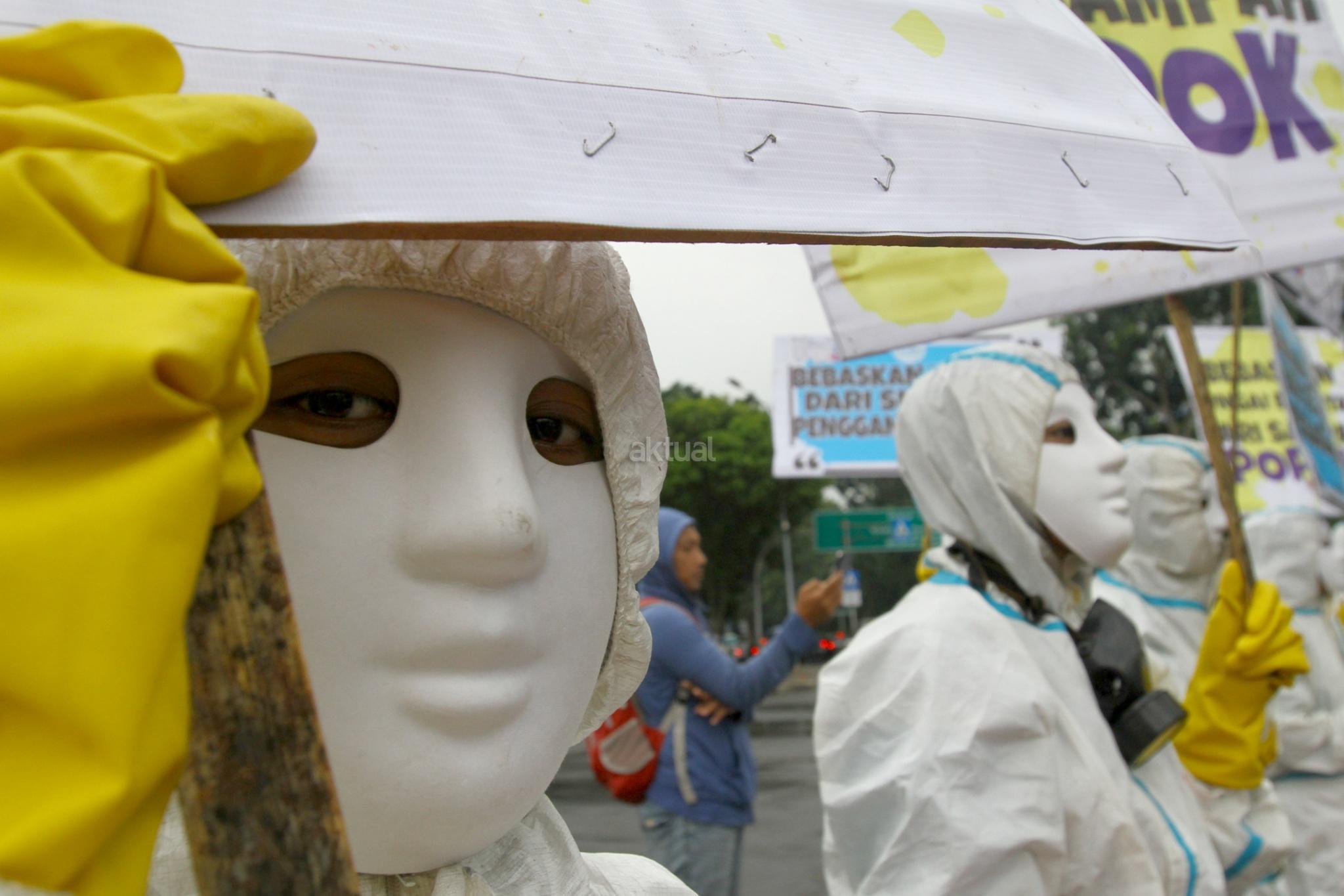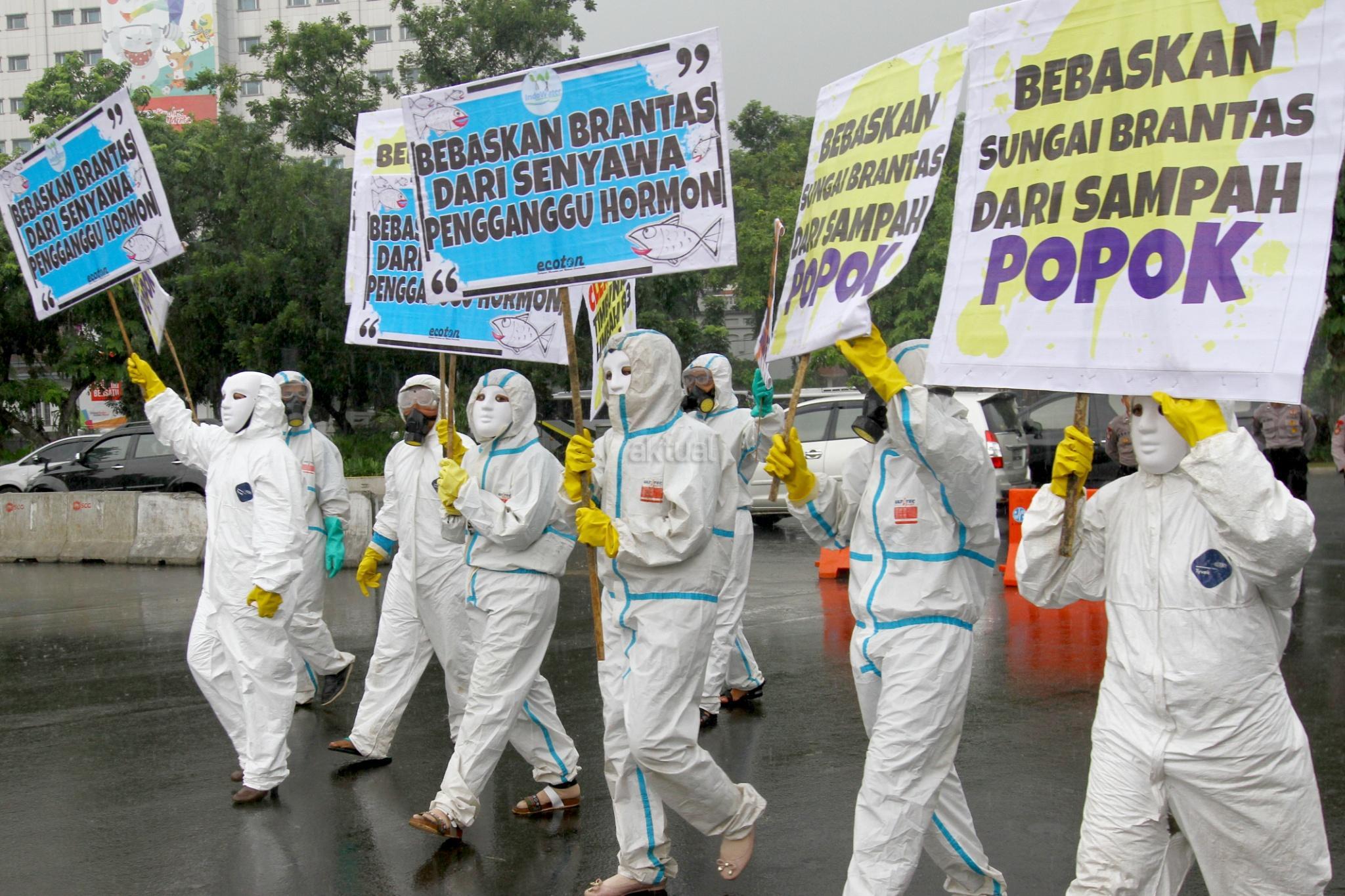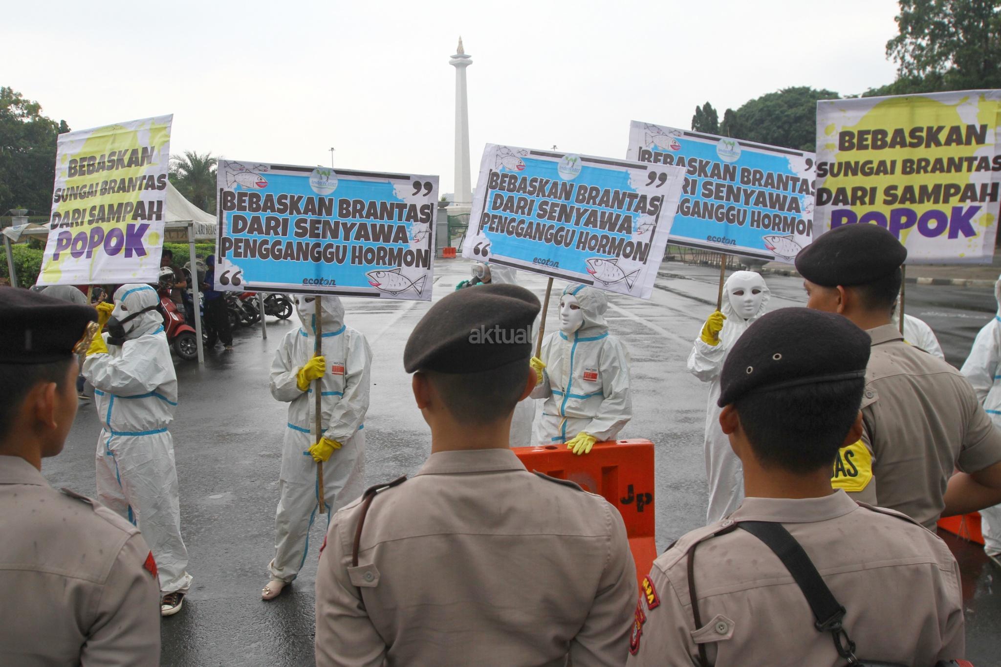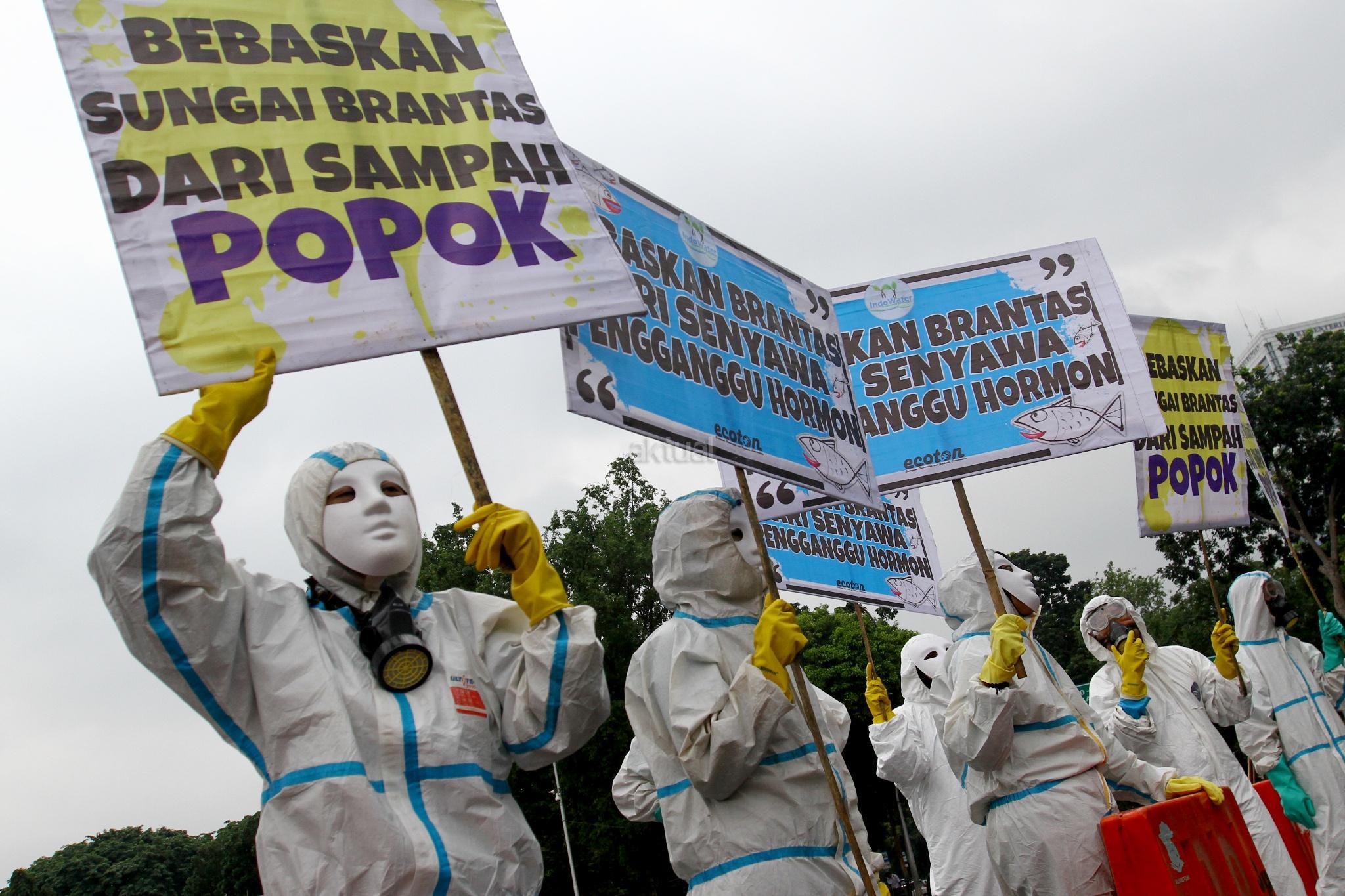 Aktivis pecinta lingkungan Lembaga Kajian Ekologi dan Konservasi Lahan Basah atau Ecological Observation and Wetlands Conservation (Ecoton) berunjuk rasa dan mendeklarasikan revolusi popok di depan Istana Merdeka, Jakarta, Kamis (18/1). Ecoton prihatin terhadap perilaku masyarakat yang asal membuang popok bekas di sepanjang Sungai Brantas selama 15 tahun terakhir. Dan meminta pemerintah pusat untuk menangani masalah popok di Sungai Brantas yang melintasi 15 kota dan kabupaten di Jawa Timur. AKTUAL/Tino Oktaviano
