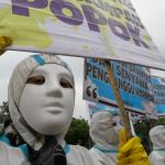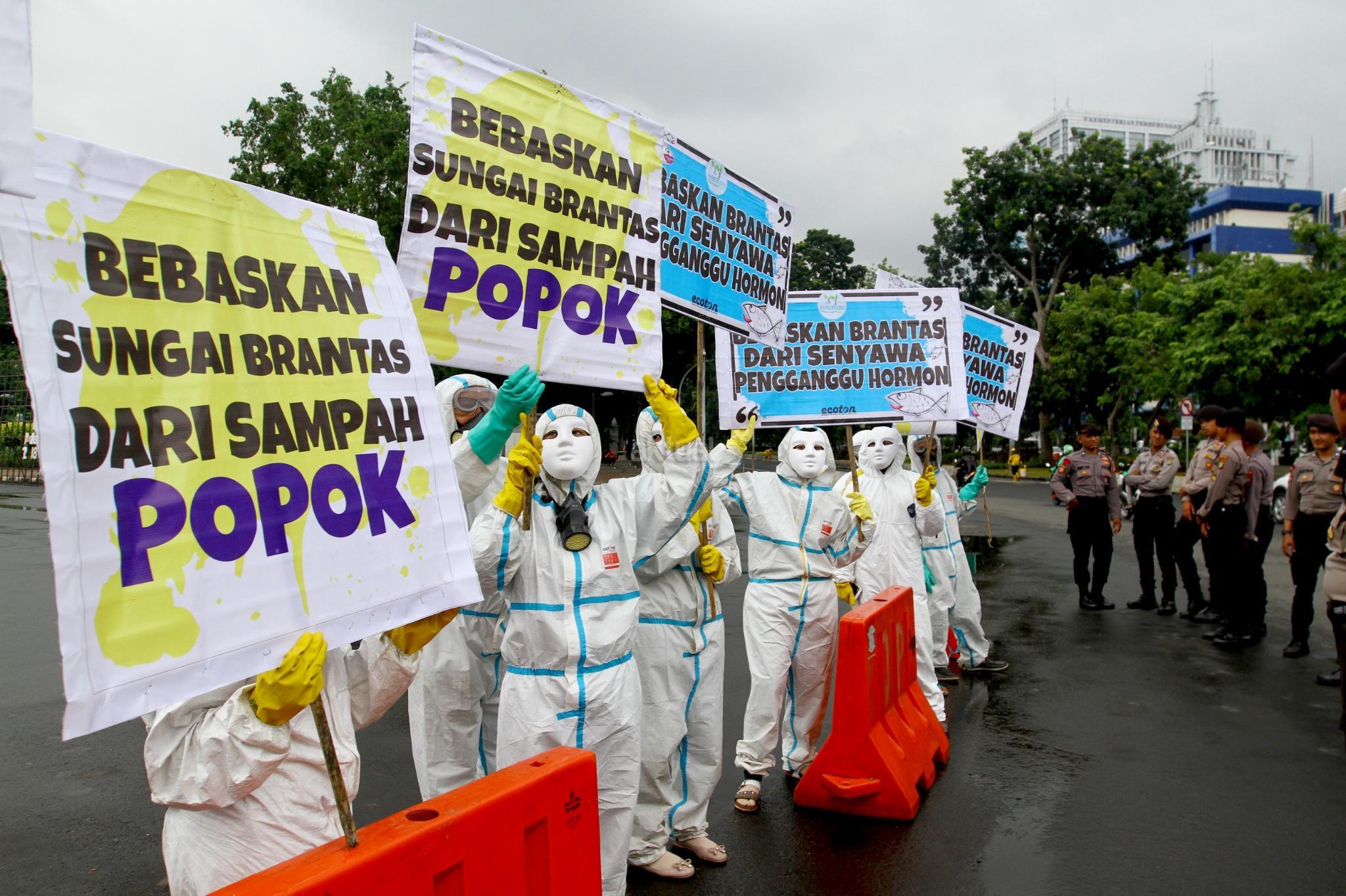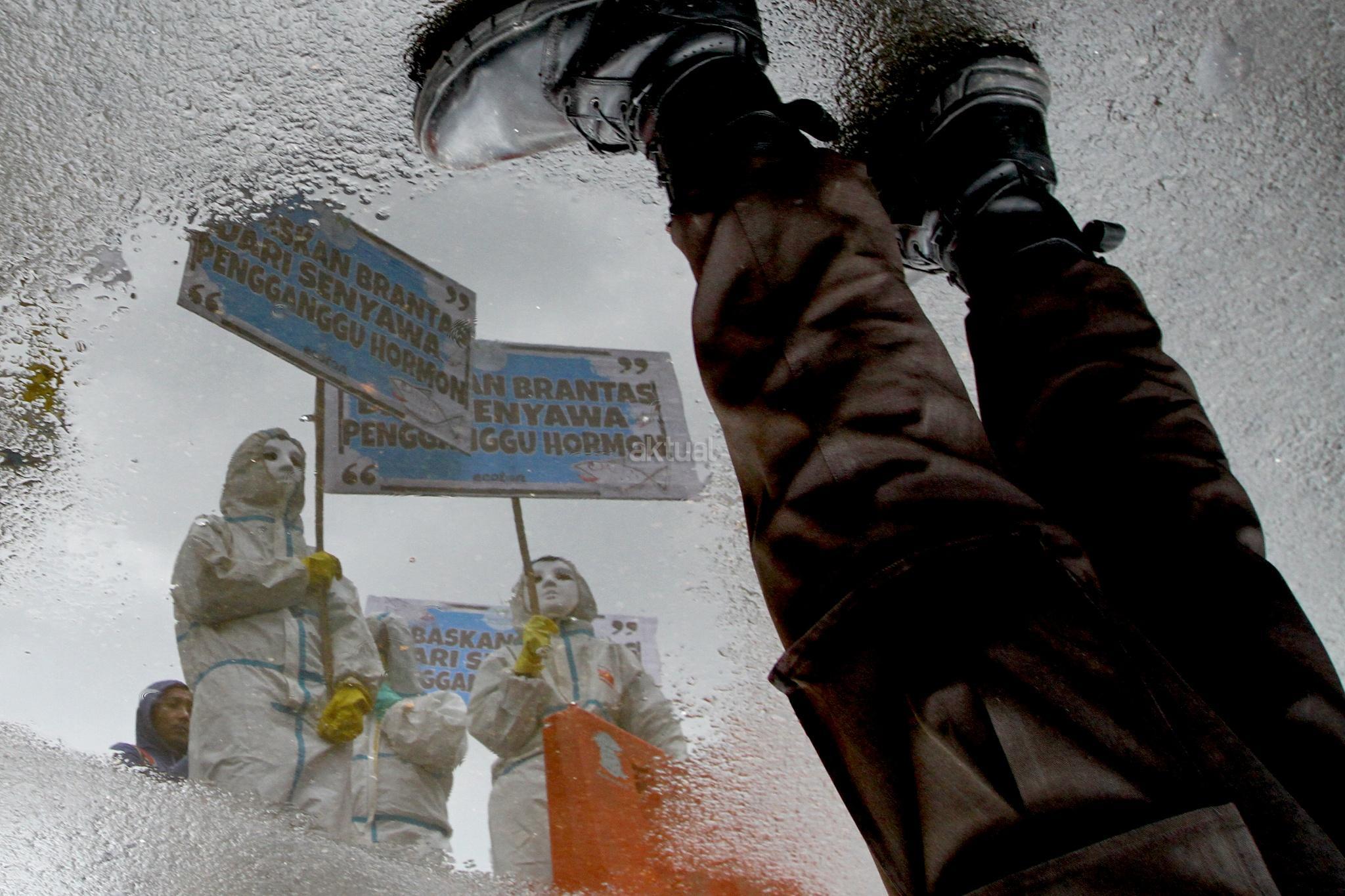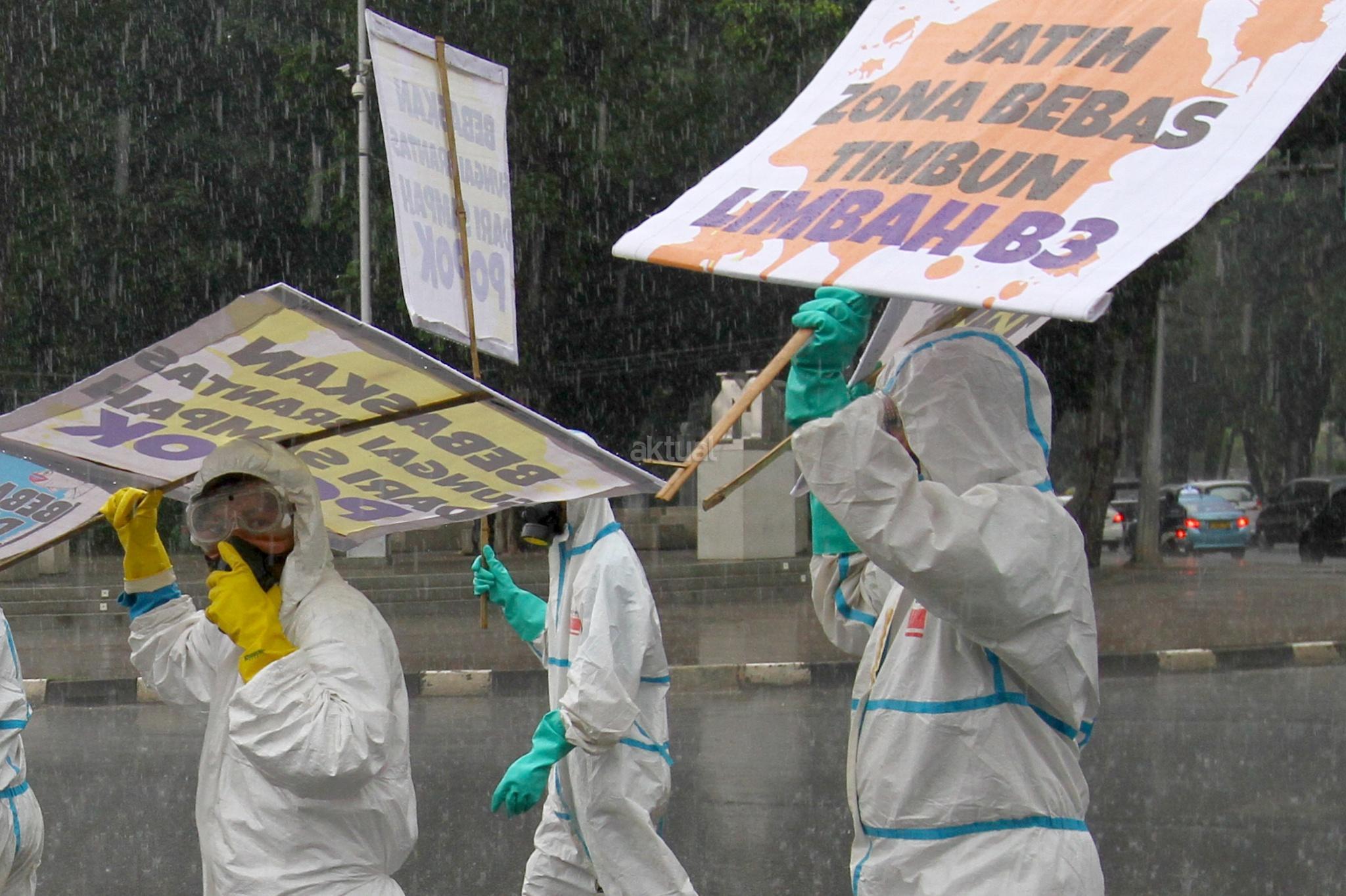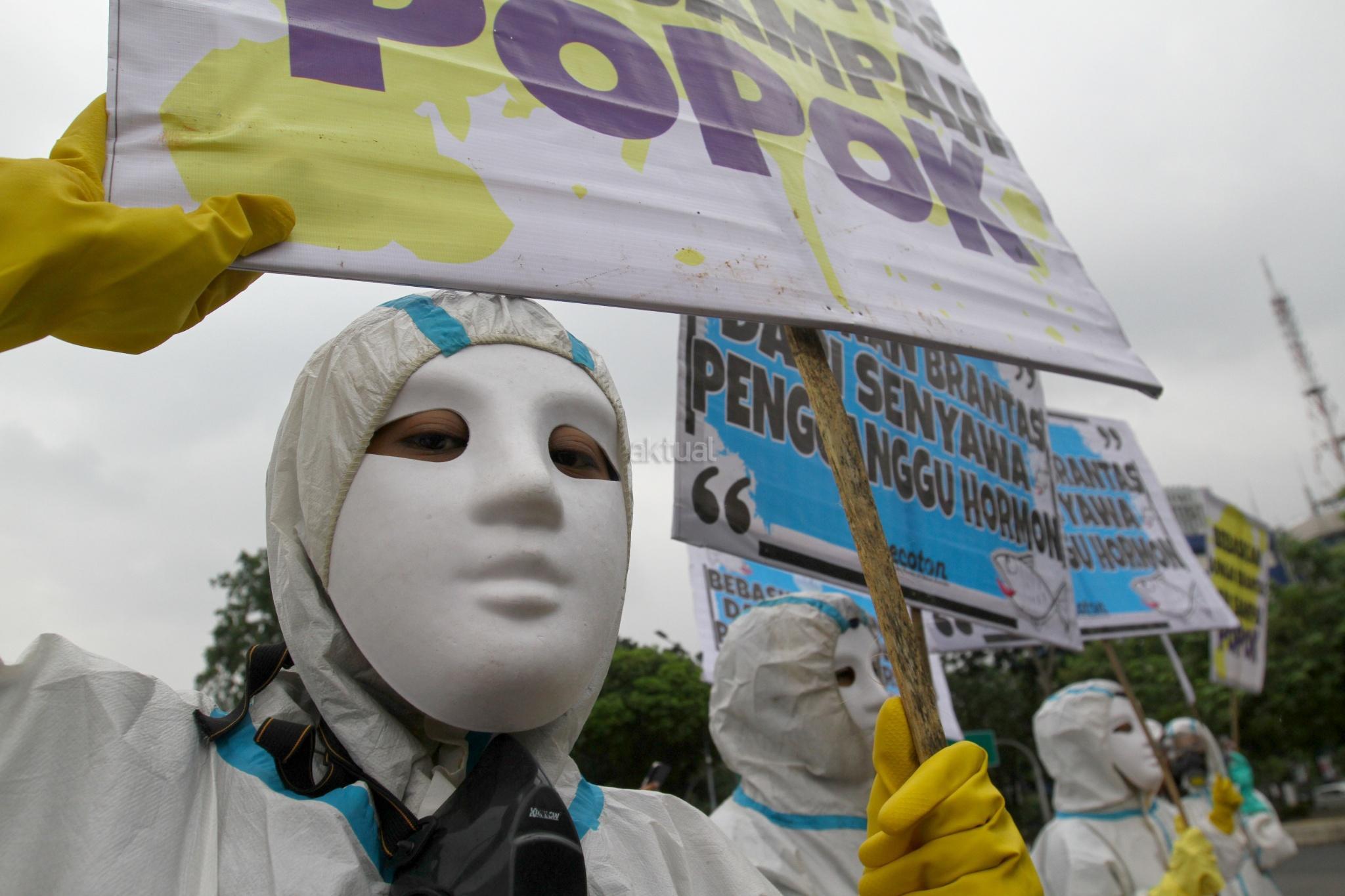 Aktivis pecinta lingkungan Lembaga Kajian Ekologi dan Konservasi Lahan Basah atau Ecological Observation and Wetlands Conservation (Ecoton) berunjuk rasa dan mendeklarasikan revolusi popok di depan Istana Merdeka, Jakarta, Kamis (18/1). Ecoton prihatin terhadap perilaku masyarakat yang asal membuang popok bekas di sepanjang Sungai Brantas selama 15 tahun terakhir. Dan meminta pemerintah pusat untuk menangani masalah popok di Sungai Brantas yang melintasi 15 kota dan kabupaten di Jawa Timur. AKTUAL/Tino Oktaviano