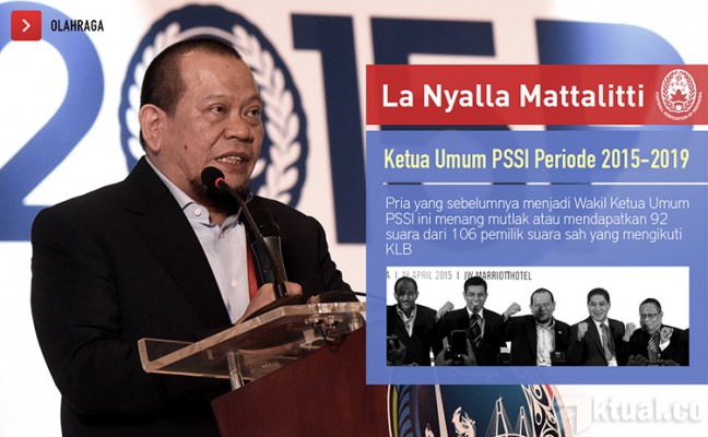 Surabaya, Aktual.co — La Nyalla Mattalitti akhirnya terpilih menjadi Ketua Umum PSSI periode 2015-2019 pada Kongres Luar Biasa (KLB) di Hotel JW Marriot, Surabaya, Jawa Timur, Sabtu (18/4). Pria yang sebelumnya menjadi Wakil Ketua Umum PSSI ini menang mutlak atau mendapatkan 92 suara dari 106 pemilik suara sah yang mengikuti KLB. Sedangkan sisa suaranya yaitu 14 direbut oleh Syarif Bastaman.