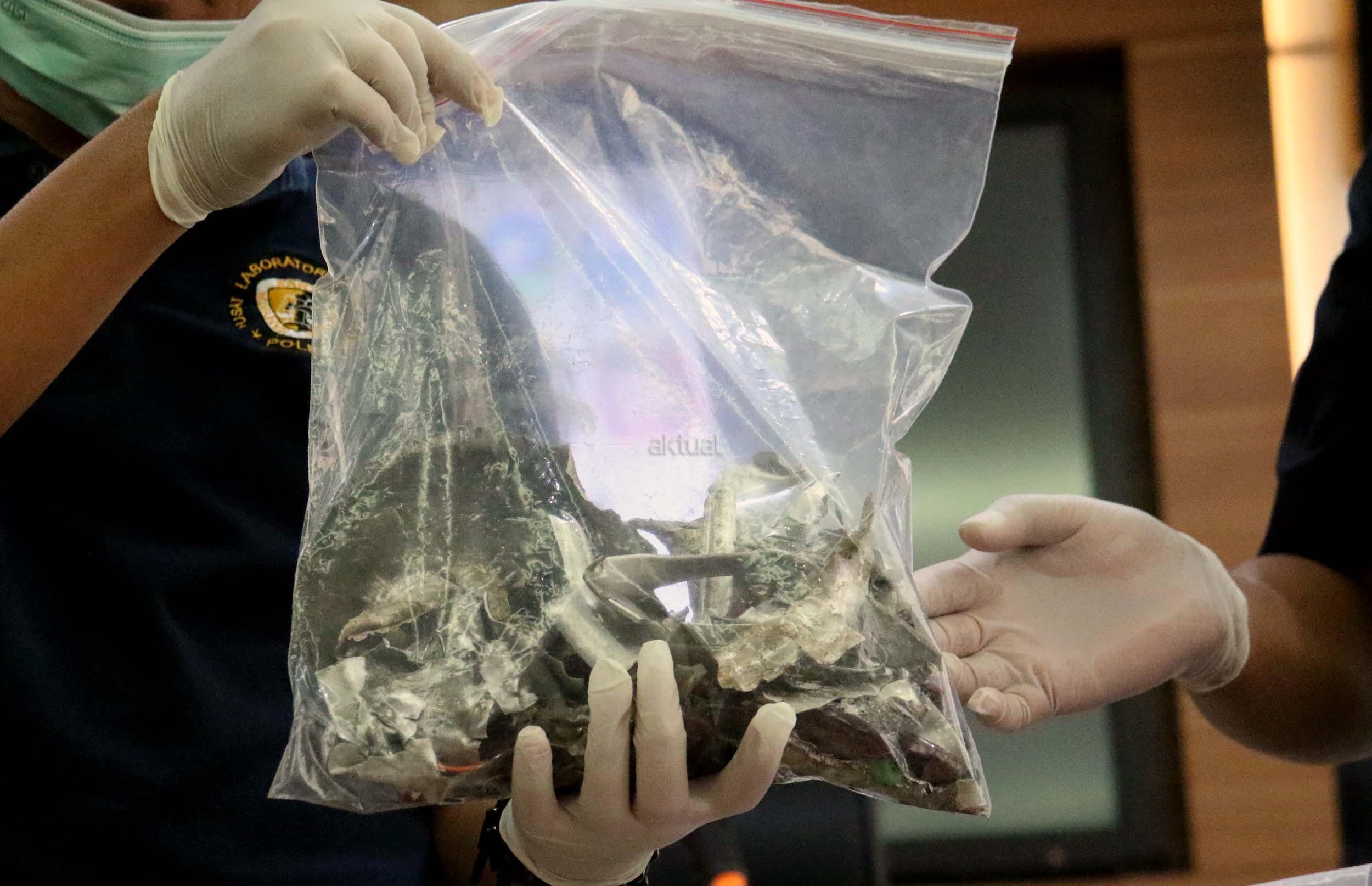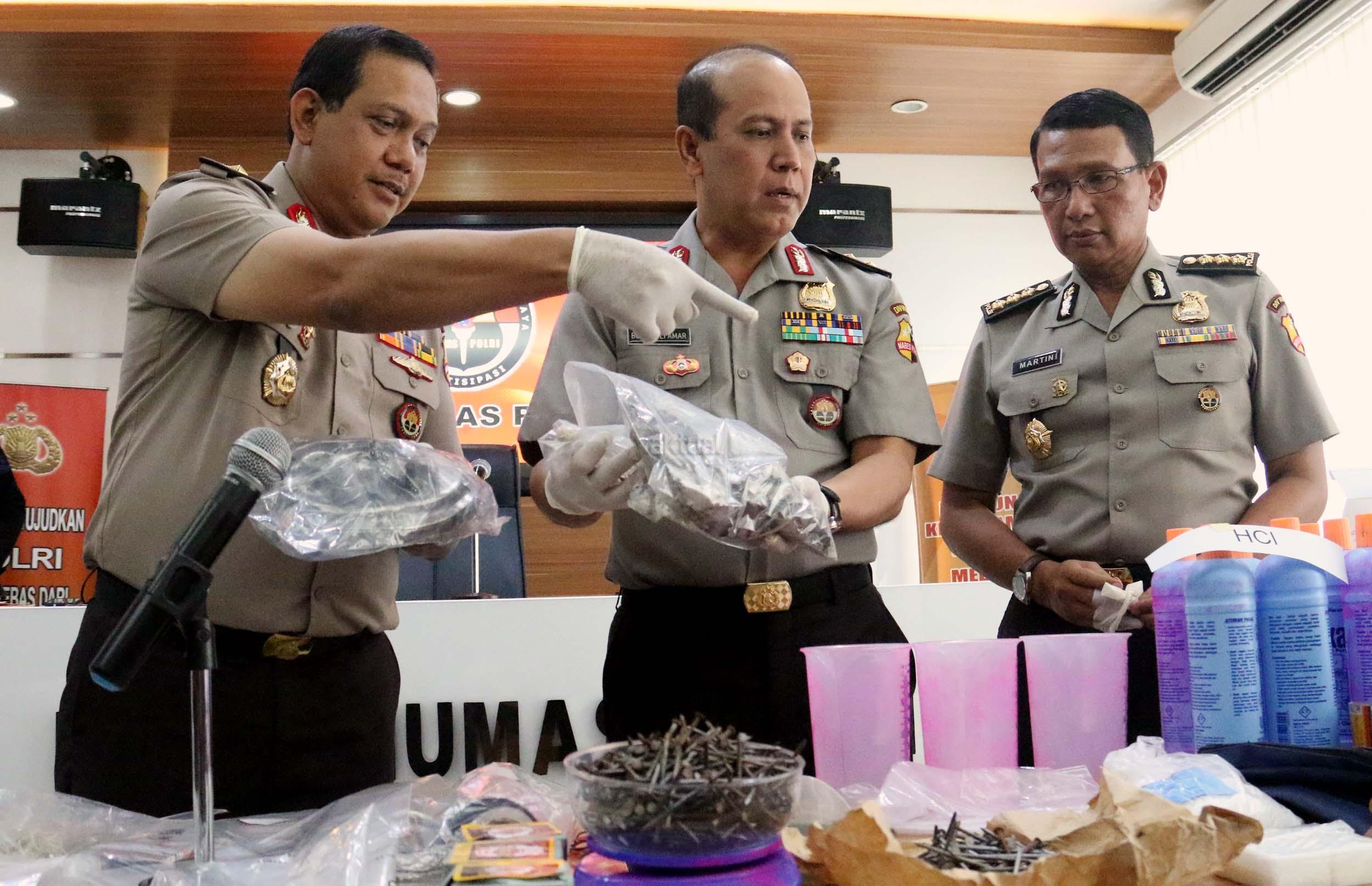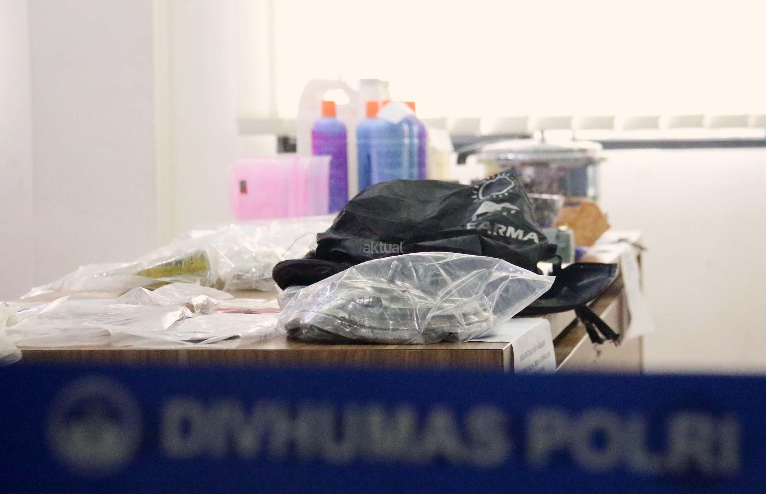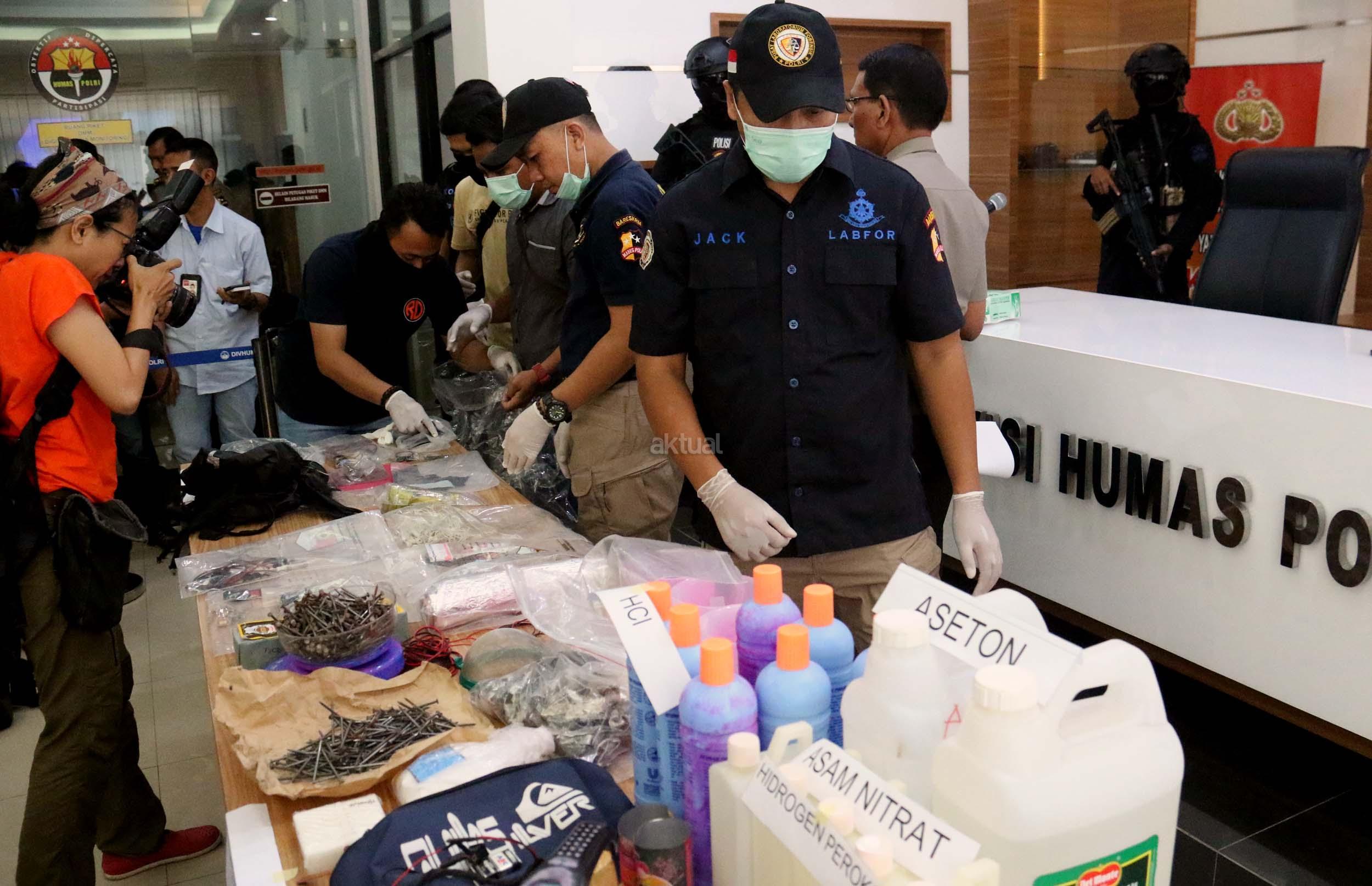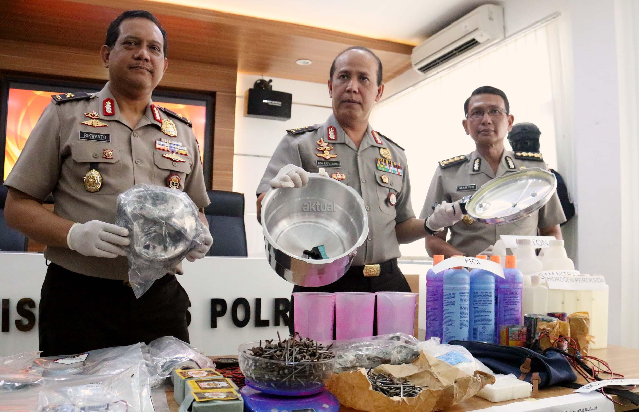 Dari tangan Abu Muslim, polisi menyita beberapa barang bukti di antaranya adalah panci, paku, kabel, parafin, korek api kayu, baterai, kaleng, solatip, saringan, botol pembersih keramik, Asam Nitrat, HCL, Aseton, dan Hidrogen Peroksida. AKTUAL/Munzir