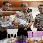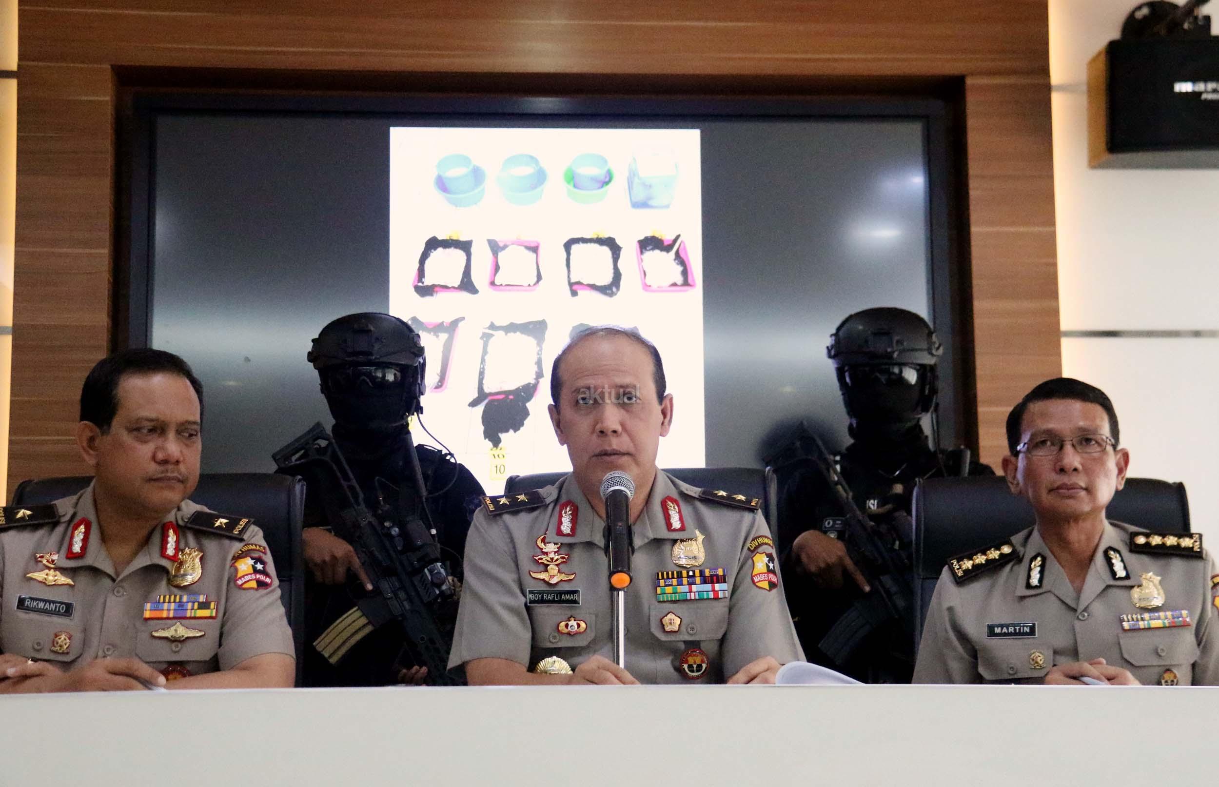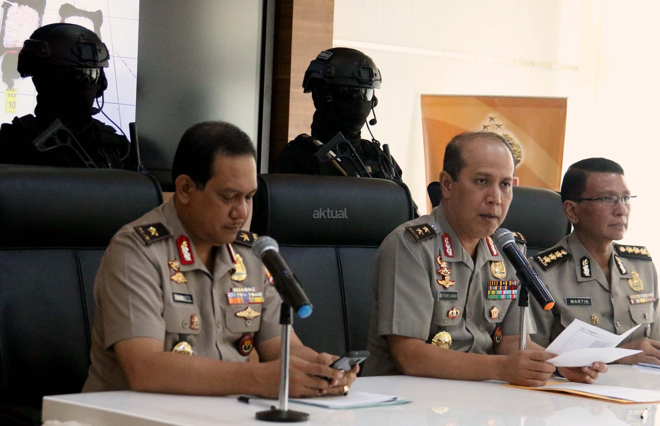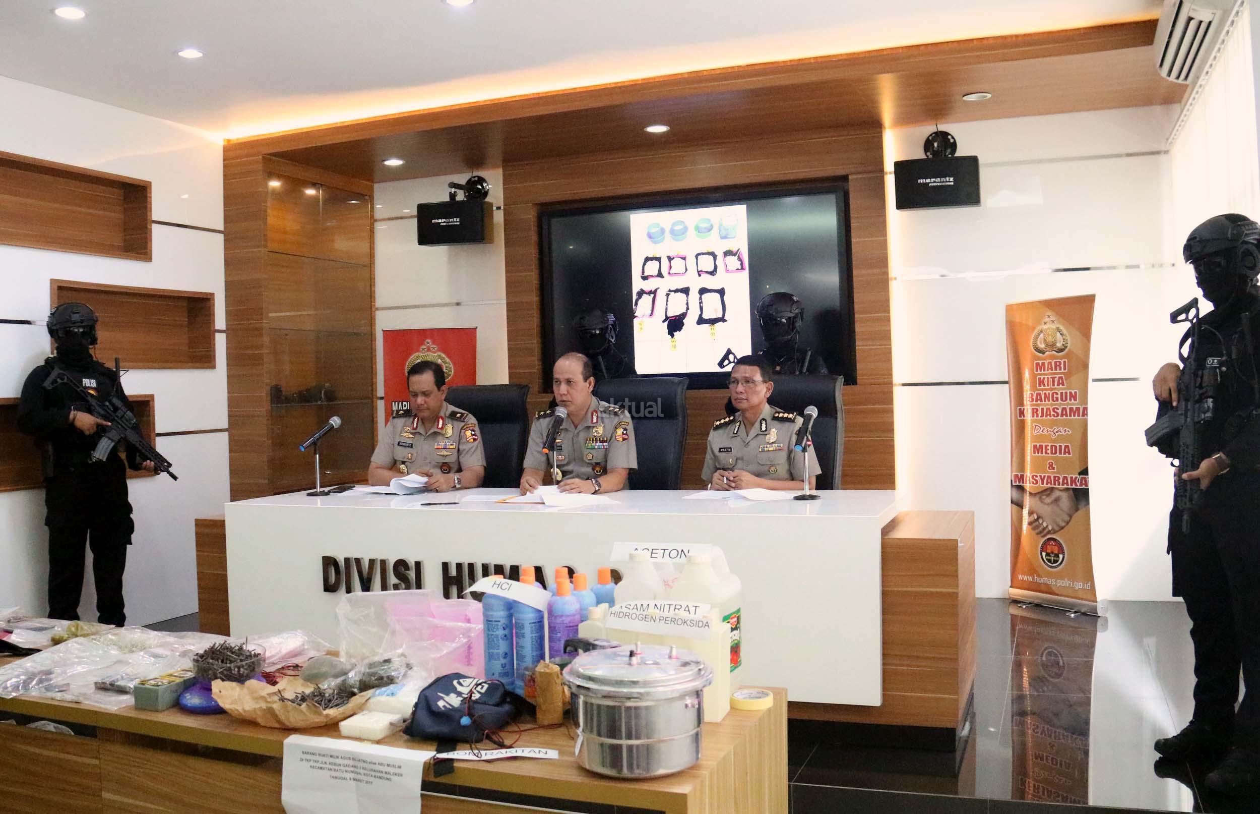 Dalam jumpa persnya polisi berhasil menangkap salah satu tersangka bom panci yang ditangkap di Bandung, Agus Sujatno alias Abu Muslim, berprofesi sebagai teknisi listrik. Dia diduga berperan mulai dari pendanaan hingga perakit bom. AKTUAL/Munzir