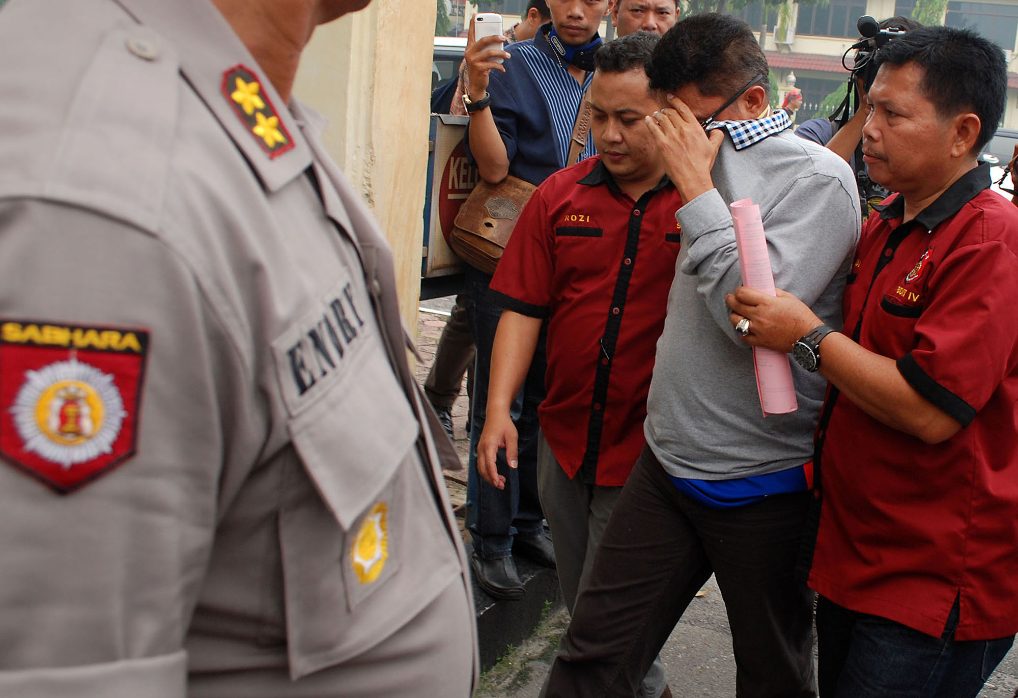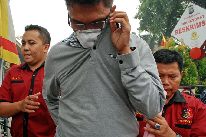 Direktur PT Langgam Inti Hibrindo, Frans Katihokang (tengah) diapit petugas Ditreskrimsus Polda Riau saat akan diserahkan ke Mapolda Riau, Pekanbaru, Riau, Kamis (17/9). Frans Katihokang ditetapkan sebagai tersangka perorangan terkait dengan adanya terjadinya kebakaran di areal HGU PT LIH di Desa Pangkalan Gondai Kecamatan Langgam, Kabupaten Pelalawan, Riau. ANTARA FOTO/Rony Muharrman/foc/15.