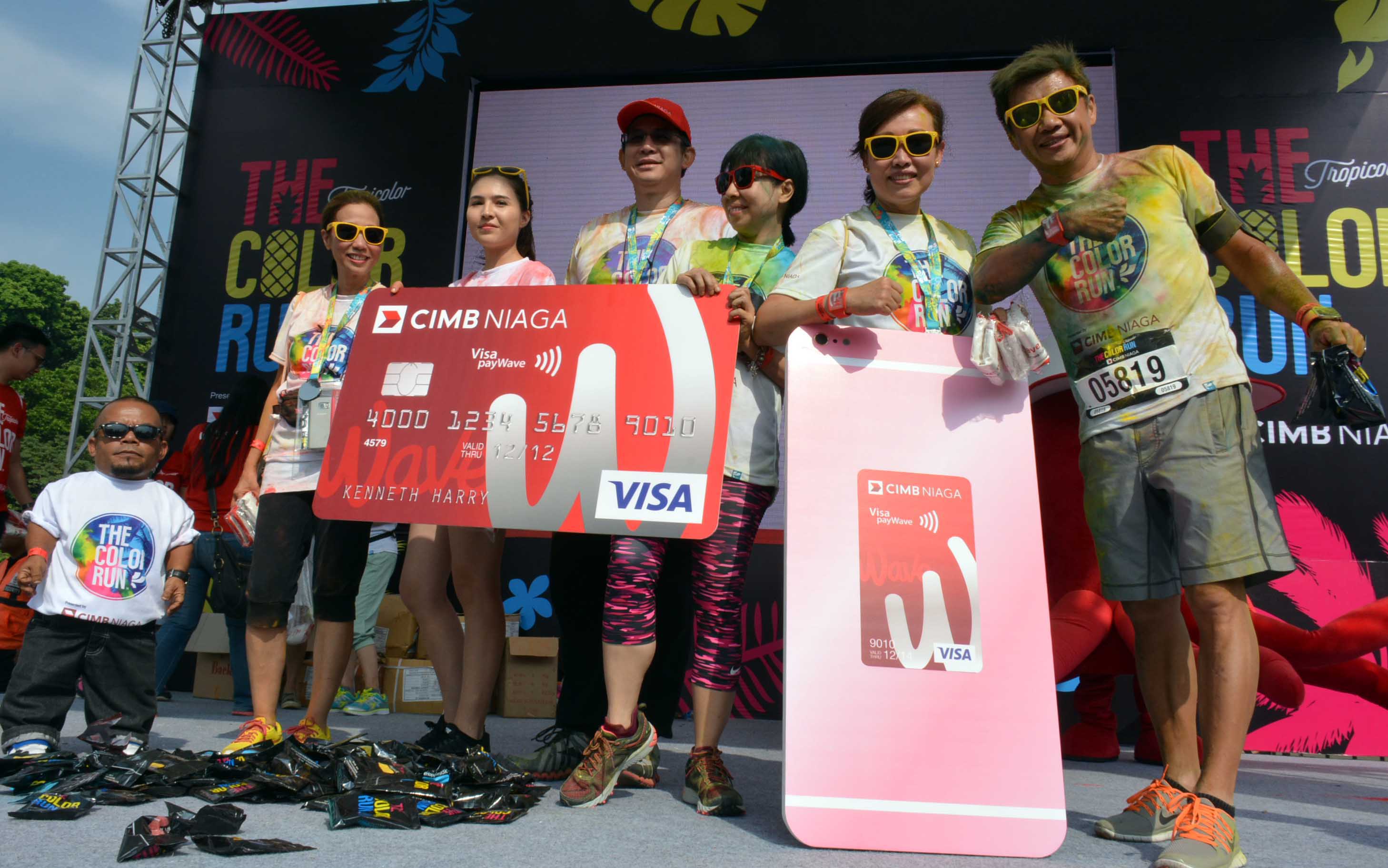 dari kiri ke kanan) Pemain sinetron, Ucok Baba, Direktur SDM CIMB Niaga, Hedy Maria Helena, Lapian, Olivia Jensen, Direktur Bussines Banking CIMB Niaga ,Frans Rahardja Alimhamzah, Presiden Direktur PT Visa Worldwide Indonesia,Ellyana Fuad,Direktur Perbankan Konsumer Konsumer CIMB Niaga, Lani Darmawan serta Executive Vice President ,Head of Retail Banking Product CIMB Niaga ,Budiman Tanjung saat peluncuran kartu kredit Wave n Go disela perhelatan The Color Run presented by CIMB Niaga di Parkir Timur Senayan, Jakarta, Minggu (7/8) Sebagai upaya untuk berinovasi dari Hati, CIMB Niaga meluncurkan Wave n Go, kartu kredit pertama di Indonesia dengan design unik berbentuk stiker yang dilengkapi teknologi pembayaraan contactless atau nirsentuh.Kartu kredit ini terbilang prkatis karena dapat ditempelkan di benda benda dengan permukaan datar yang sering dibawa seperti handphone dan dompet.Selain dalam bentuk stiker ,kartu kredit itu juga tersedia dalam format kartu plastik seperti bentuk kartu kredit pada umumnya.