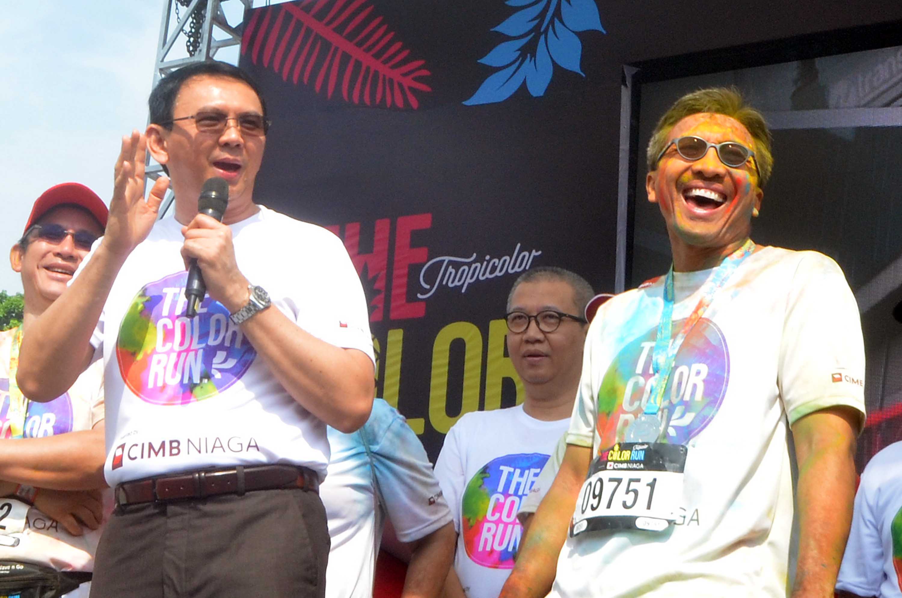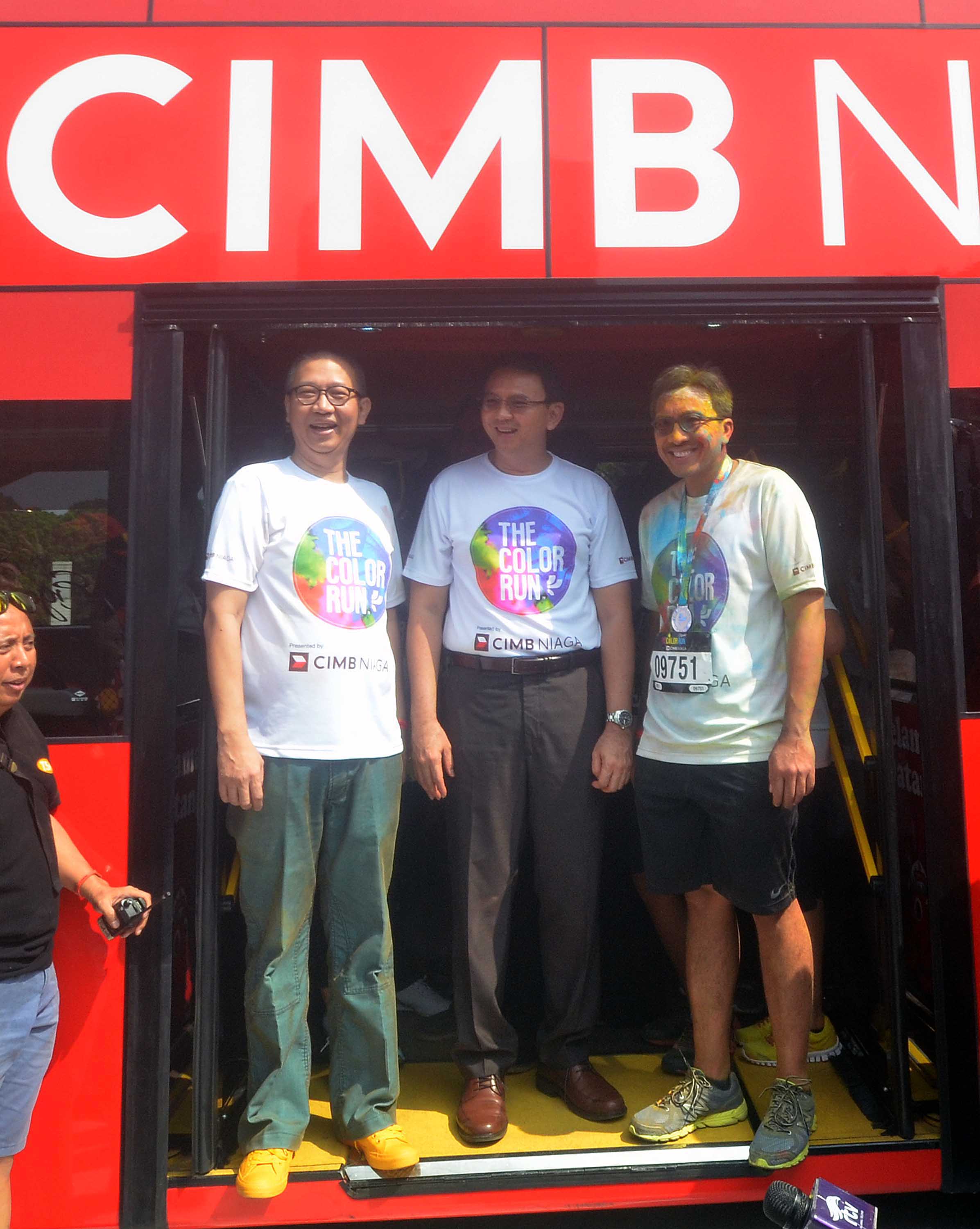 Gubernur DKI Jakarta, Basuki Tjahaja Purnama (kiri) bersama Presiden Direktur PT Bank CIMB Niaga Tbk, Tigor M Siahaaan saat rangkaian kegiatan serah terima bus tingkat pariwisata disela serah terimanya saat berlangsungnya ” The Color Run presented by CIMB Niaga di Parkir Timur Senayan ,Jakarta, Minggu (7/8).Bus Tingkat asal Jerman itu berkapasitas 76 seat, dengan rincian 59 seat di lantai atas dan 17 seat di lantai bawah. Beroperasinya bus wisata ini, diharapkan dapat menambah jumlah armada TransJakarta yang dapat dimanfaatkan masyarakat untuk berwisata ke tempat tempat bersejarah sertaa lebih mengenal dan mencintai budaya Indonesia.