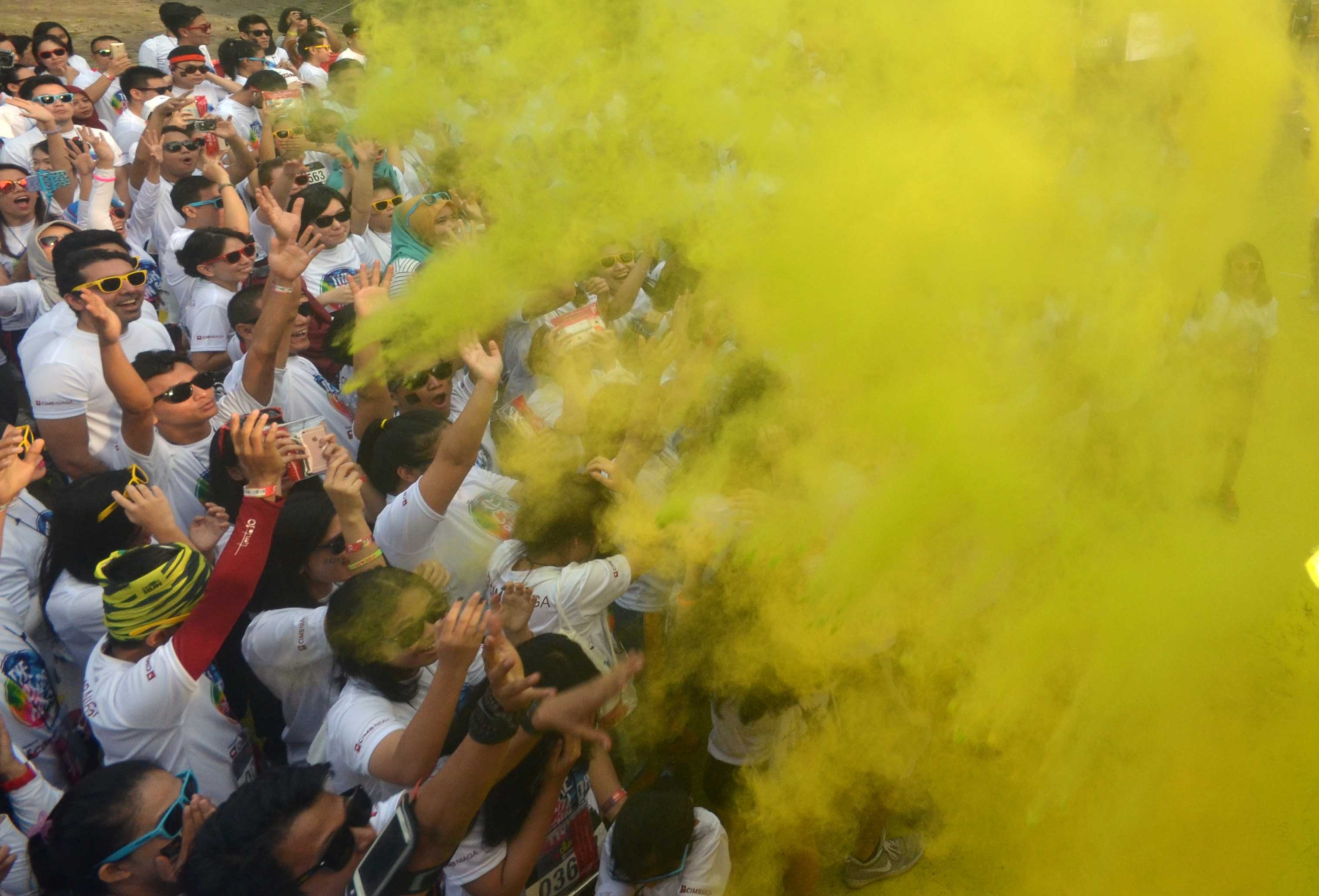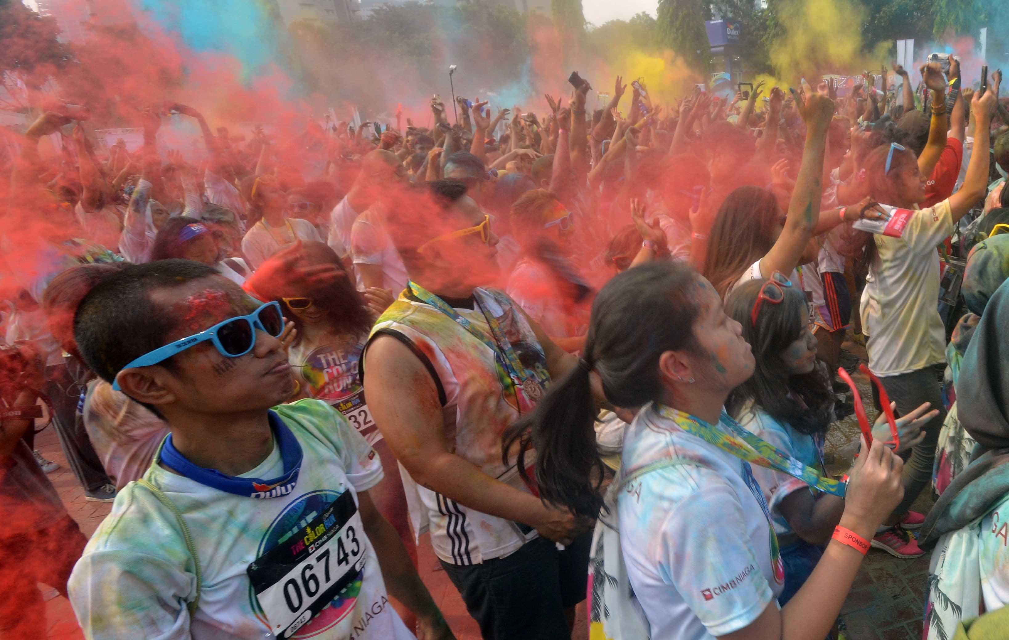 Pelari santai berkumpul di depan garis start dalam perhelatan The Color Run presented by CIMB Niaga di Parkir Timur Senayan, Jakarta, Minggu (7/8).Semua pelari santai dari berbagai kalangan berbaur memadatai trek lari sepanjang 5 km dan melewati 5 zona warna yaitu merah,hijau,biru,orange dan kuning.Lari santai tahun ini adalah bagian dari World Tropical Tour dengan bubuk warna warna tropis yang lebih vibrant yang ditaburkan sejak saat berlari melalui tiap zona warna dan dilantai festival setelah mencapai garis finish.