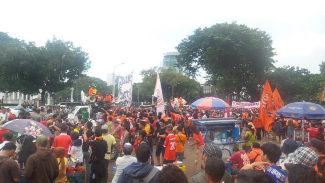 Jakarta, Aktual.co — Ribuan Jak Mania, suporter Persija ‘menyemut’ di depan Istana Negara Jakarta, Selasa (5/5) siang. Mereka hendak mengadukan ‘nasib’ sepakbola Indonesia kepada Presiden Jokowi.