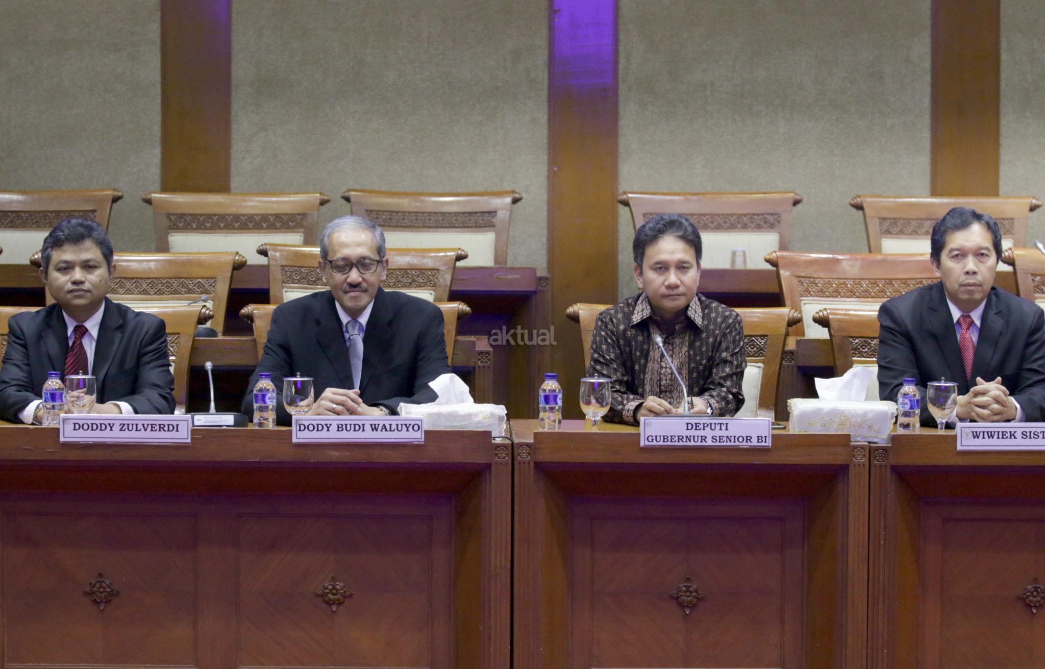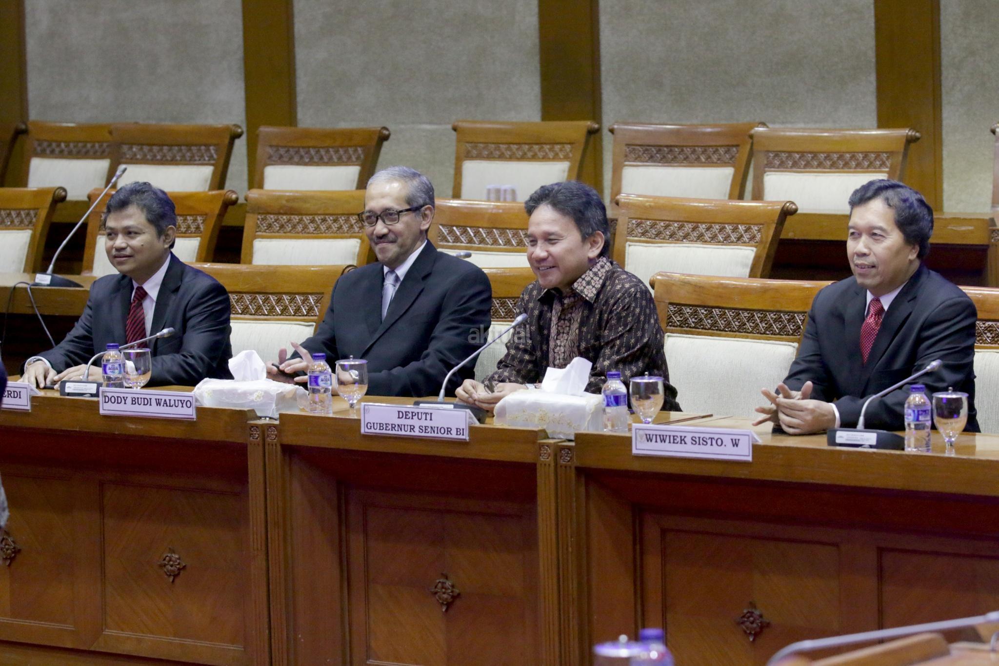 Tiga calon Deputi Gubernur Bank Indonesia (BI) Doddy Zulverdi (kiri), Dody Budi Waluyo (dua kiri) dan Wiwiek Sisto Widayat (kanan) didampingi Deputi Gubernur Senior BI Mirza Adityaswara (dua kanan) menjalani uji kepatutan dan kelayakan (fit and proper test) dengan Komisi XI DPR, di Kompleks Parlemen, Senayan, Jakarta, Selasa (27/3/2018). Dalam tes tersebut ketiga calon memaparkan visi misi dan pandangan terkait perekonomian Indonesia. AKTUAL/Tino Oktaviano