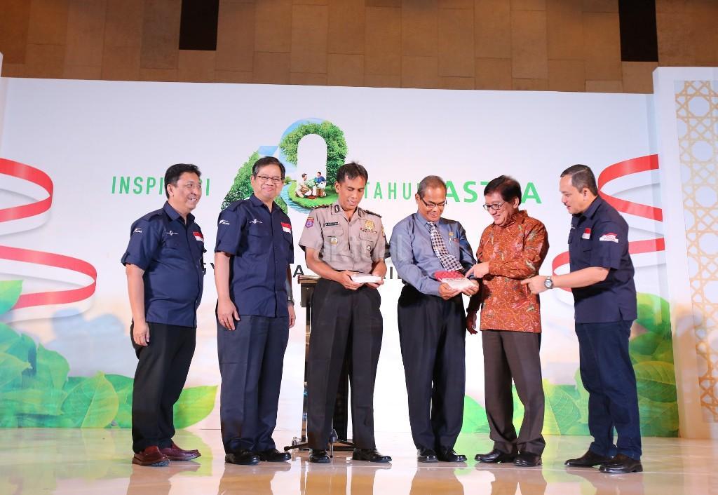 Kepala Biro Pembangunan Daerah Istimewa Yogyakarta (DIY) Tri Mulyono (ketiga kanan) dan Direktur Pengamanan Objek Vital Kombes Pol Istiyono (ketiga kiri) menerima Buku Astra on Becoming Pride of the Nation dari Direktur Independen PT Astra International Tbk Paulus Bambang Widjanarko (kedua kanan) didampingi Chief of Corporate Human Capital Development Astra International Aloysius Budi Santoso (kedua kiri), Head of Environment & Social Responsibility Astra International Riza Deliansyah (kanan) dan Ketua Koordinator Grup Astra Wilayah Yogyakarta Uberlin Tangkas (kiri) pada pembukaan rangkaian Inspirasi 60 Tahun Astra di Yogyakarta tanggal 28-30 April 2017 (28/4). AKTUAL/Eko S Hilman