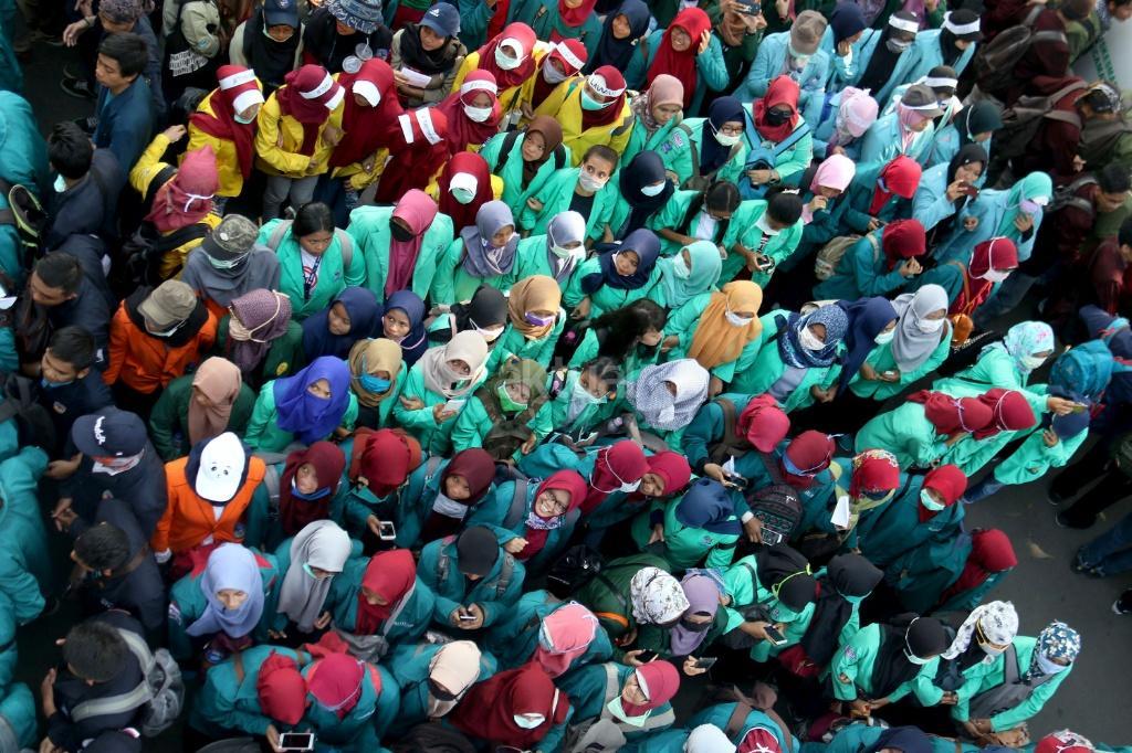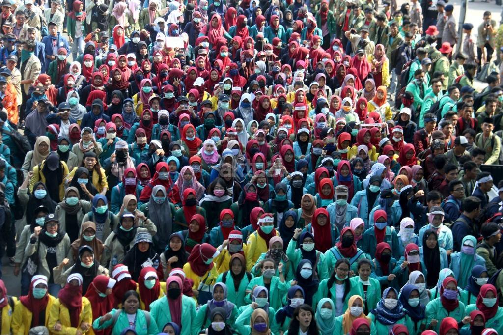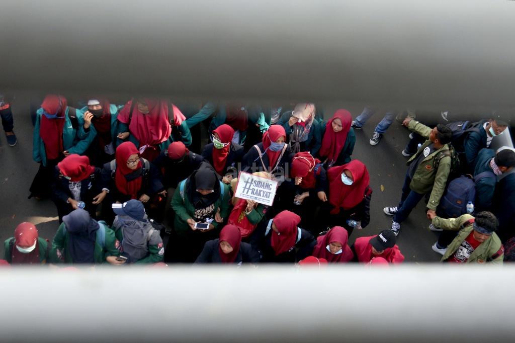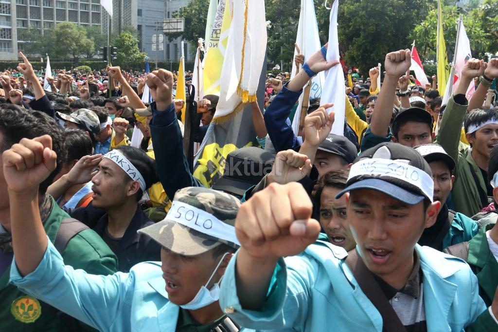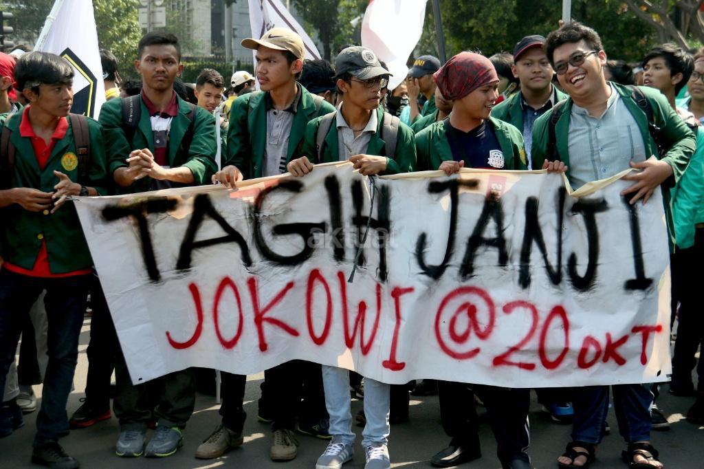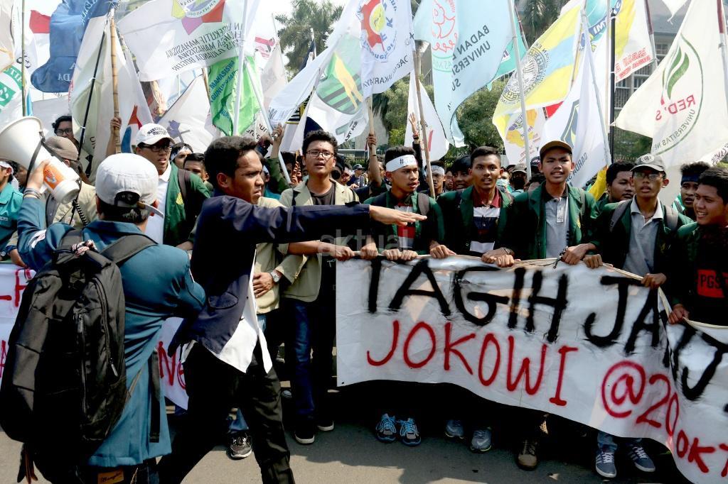 Ribuan mahasiswa dari berbagai Universitas yang tergabung dalam Badan Eksekutif Mahasiswa (BEM) Seluruh Indonesia melakukan aksi long march menuju Istana Merdeka, Jakarta, Jumat (20/10/2017). Dalam aksinya para mahasiswa menagih janji Jokowi dan segera dilaksanakan sidang rakyat untuk Jokowi – JK. AKTUAL/Munzir