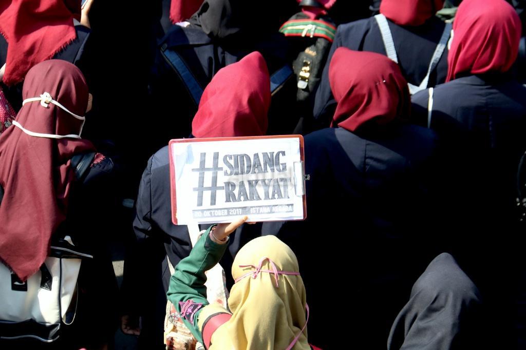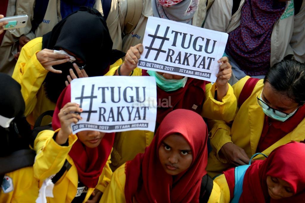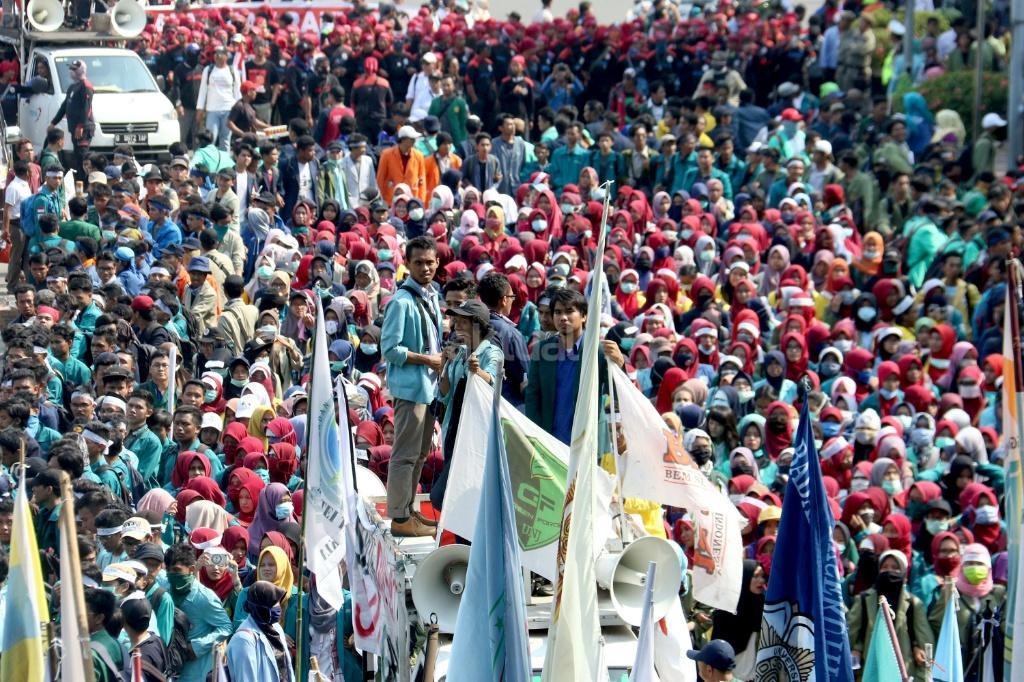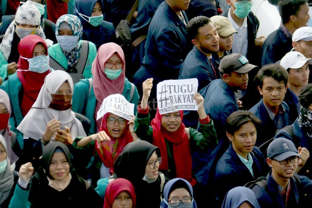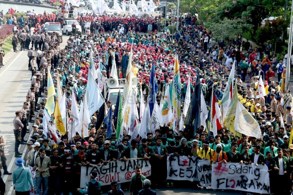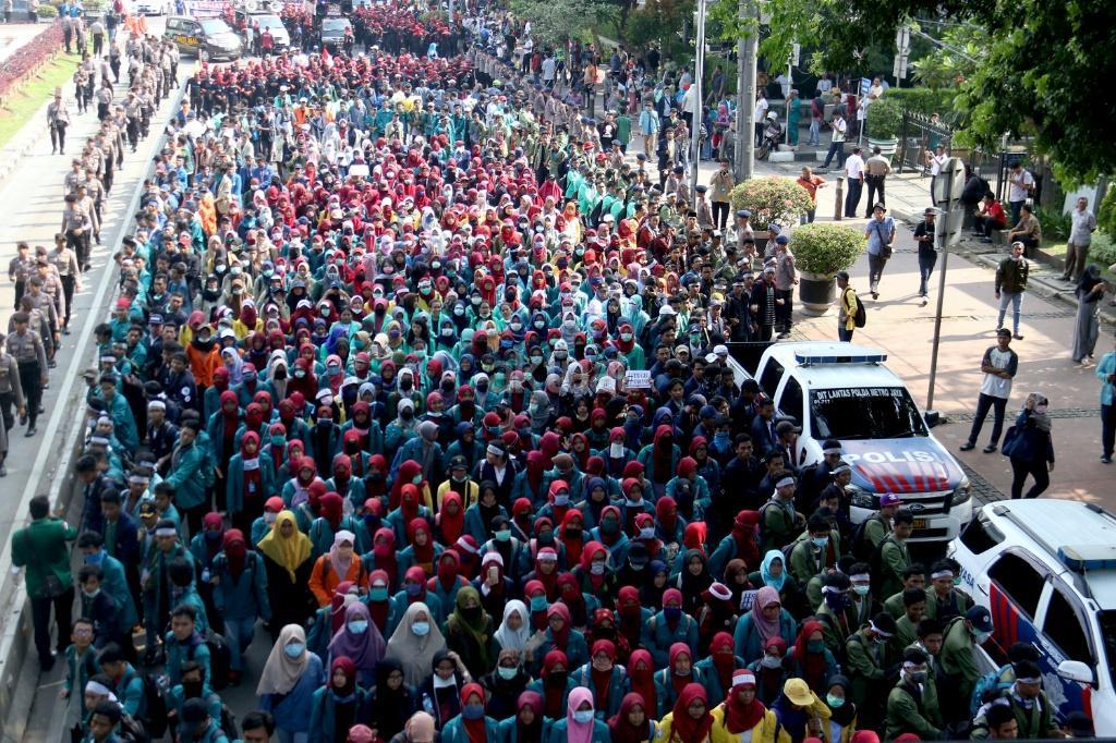 Ribuan mahasiswa dari berbagai Universitas yang tergabung dalam Badan Eksekutif Mahasiswa (BEM) Seluruh Indonesia melakukan aksi long march menuju Istana Merdeka, Jakarta, Jumat (20/10/2017). Dalam aksinya para mahasiswa menagih janji Jokowi dan segera dilaksanakan sidang rakyat untuk Jokowi – JK. AKTUAL/Munzir