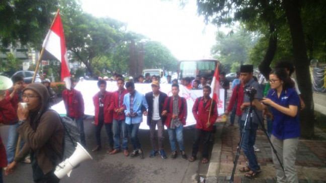 Selain menyampaikan orasi-orasi, para mahasiswa juga menggelar spanduk Tritura mahasiswa :1. Lantik komjen budi gunawan 2. Audit KPK dan ke 3. Lawan kepentingan asing, menentukan pejabat negara.