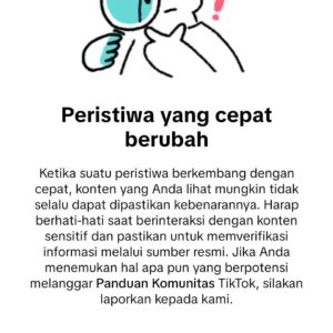 Ketika suatu peristiwa berkembang dengan cepat, konten yang Anda lihat mungkin tidak selalu dapat dipastikan kebenarannya. Harap berhati-hati saat berinteraksi dengan konten sensitif dan pastikan untuk memverifikasi informasi melalui sumber resmi. Jika Anda menemukan hal apa pun yang berpotensi melanggar Panduan Komunitas TikTok, silakan laporkan kepada kami,” tulis TikTok.