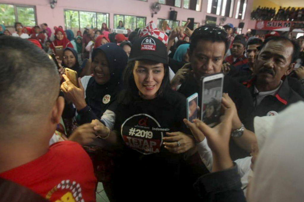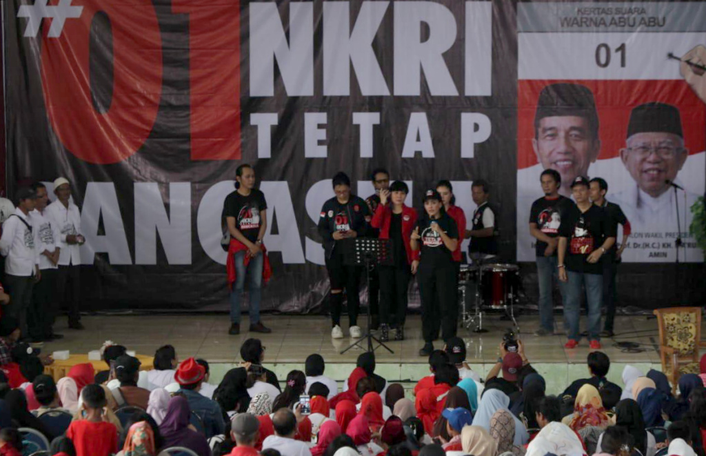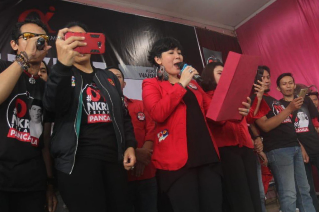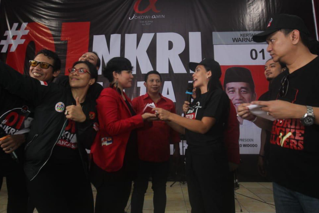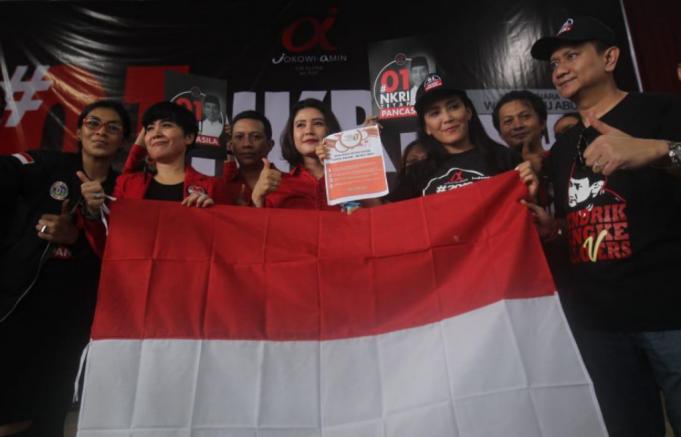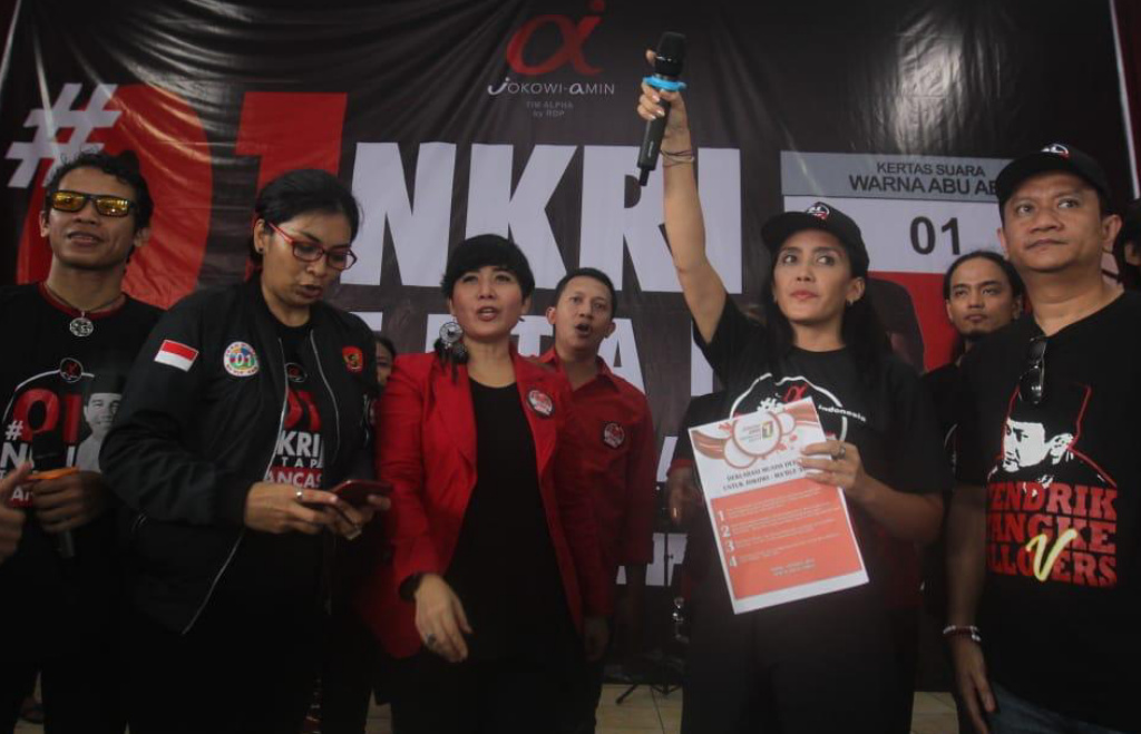 Ketua Umum relawan pemenangan paslon 01 Tim Alpha Rieke Diah Pitaloka bersama para musisi, komunitas Vespa dan buruh pelabuhan saat meluncurkan dan mendeklarasikan Gerakan Nasional #01NKRITetapPANCASILA di Balai Samina, Depok, Jawa Barat, Minggu (10/3/2019). AKTUAL/Tino Oktaviano