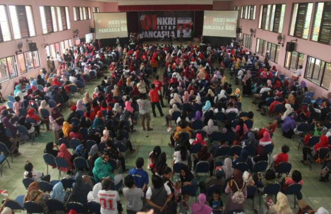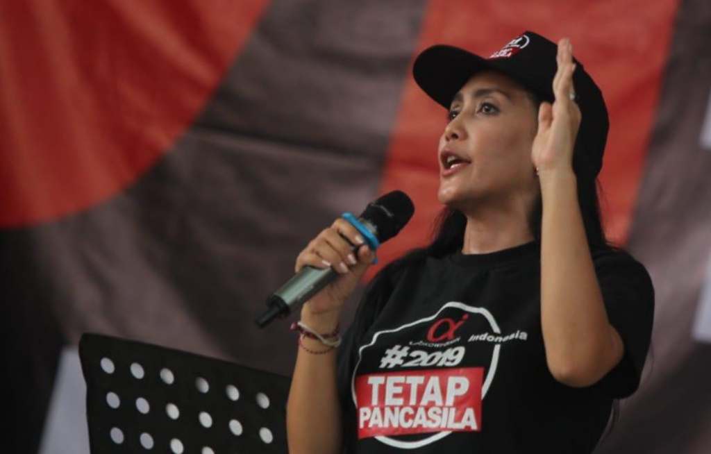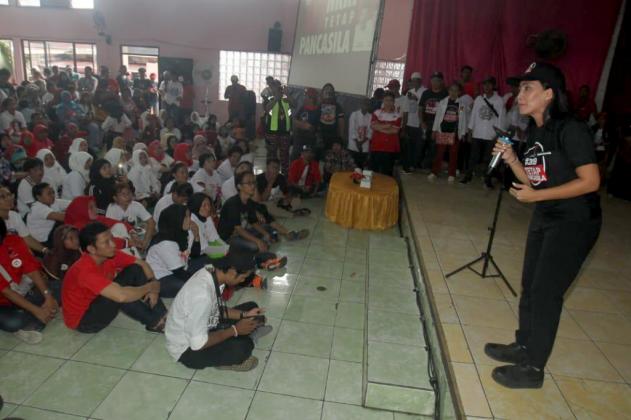 Ketua Umum relawan pemenangan paslon 01 Tim Alpha Rieke Diah Pitaloka, menyampaikan amanat Bung Karno soal Pemilu saat meluncurkan dan mendeklarasikan Gerakan Nasional #01NKRITetapPANCASILA di Balai Samina, Depok, Jawa Barat, Minggu (10/3/2019). AKTUAL/Tino Oktaviano