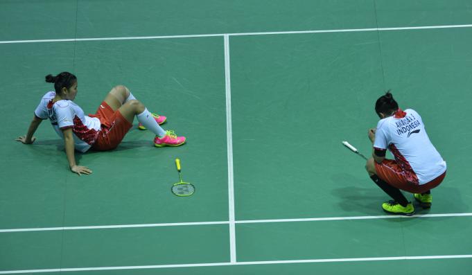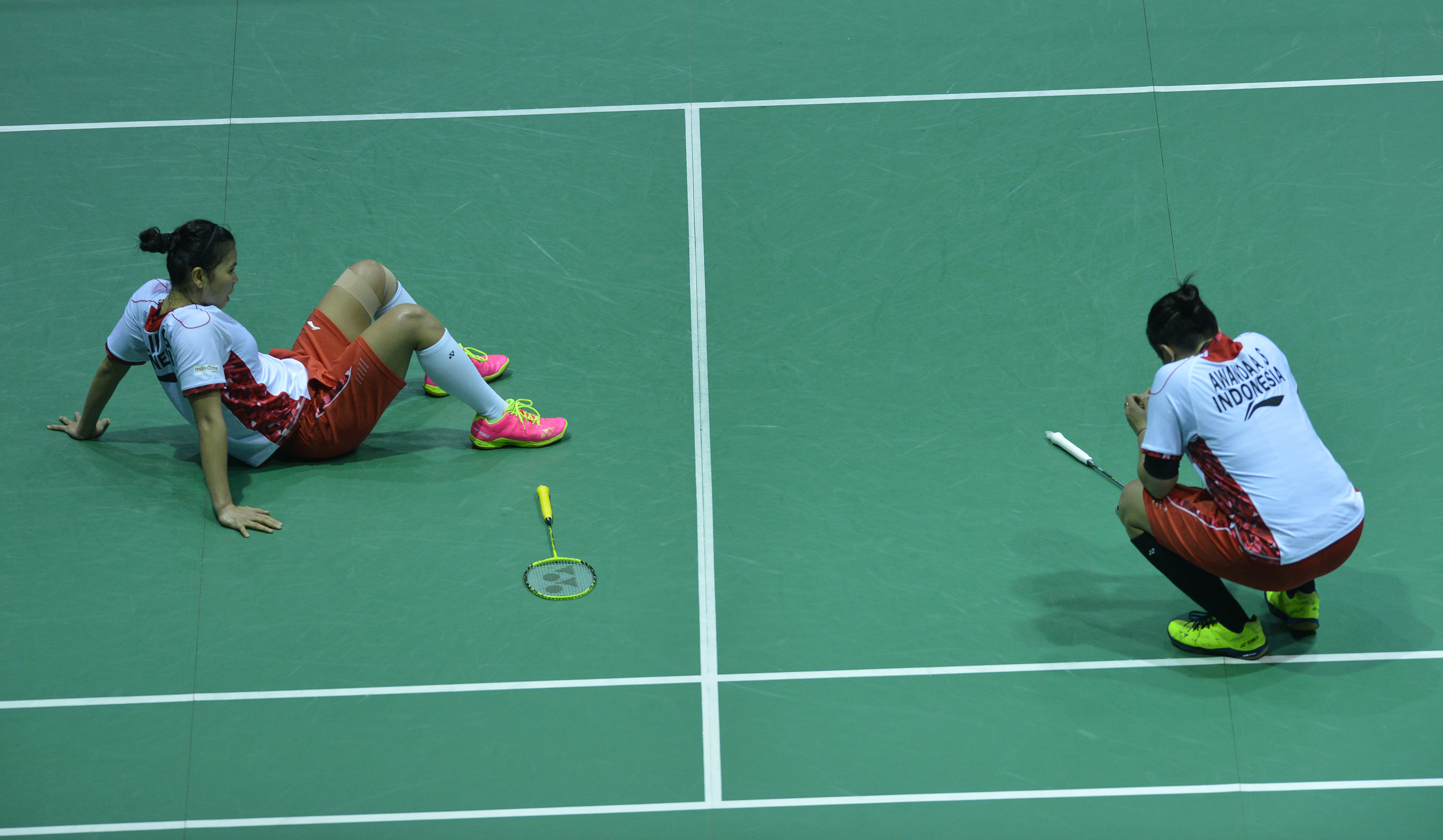 Pebulu tangkis ganda putri Indonesia Greysia Polii (kiri) dan Anggia Shitta Awanda (kanan) tertunduk saat dikalahkan pebulu tangkis Korea Selatan Kyung Eun Jun dan Seung Chan Shin pada pertandingan perempat final Piala Uber 2016 di Kunshan Sport Center Gymnasium, Tiongkok, Kamis (19/5). Indonesia gagal melangkah ke semi final setelah dikalahkan Korea Selatan dengan skor 0-3. ANTARA FOTO/Prasetyo Utomo/aww/16.