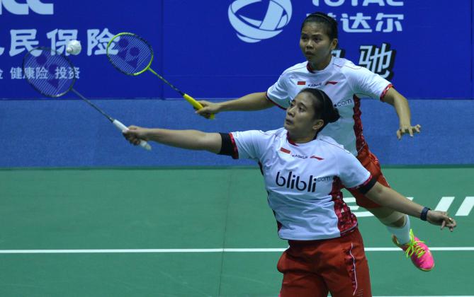 Pebulu tangkis ganda putri Indonesia Greysia Polii (belakang) dan Anggia Shitta Awanda (depan) mengembalikan kok ke arah lawannya pebulu tangkis Korea Selatan Kyung Eun Jun dan Seung Chan Shin pada pertandingan perempat final Piala Uber 2016 di Kunshan Sport Center Gymnasium, Tiongkok, Kamis (19/5). Indonesia gagal melangkah ke semi final setelah dikalahkan Korea Selatan dengan skor 0-3. ANTARA FOTO/Prasetyo Utomo/aww/16.