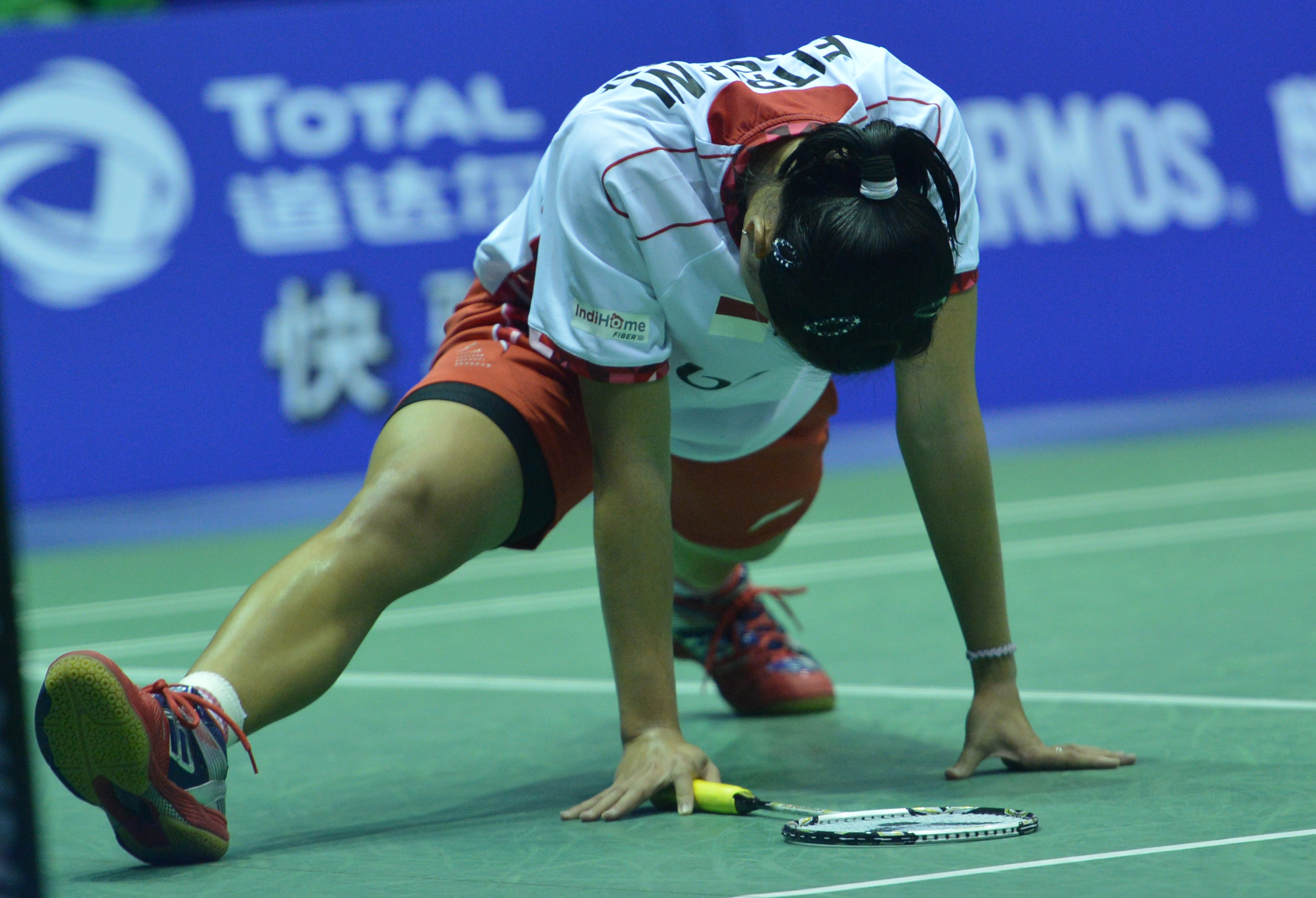 Pebulu tangkis tunggal putri Indonesia Fitriani terjatuh saat mencoba mengembalikan kok ke arah lawannya pebulu tangkis Korea Selatan Yeon Ju Bae pada pertandingan perempat final Piala Uber 2016 di Kunshan Sport Center Gymnasium, Tiongkok, Kamis (19/5). Indonesia gagal melangkah ke semi final setelah dikalahkan Korea Selatan dengan skor 0-3. ANTARA FOTO/Prasetyo Utomo/aww/16.