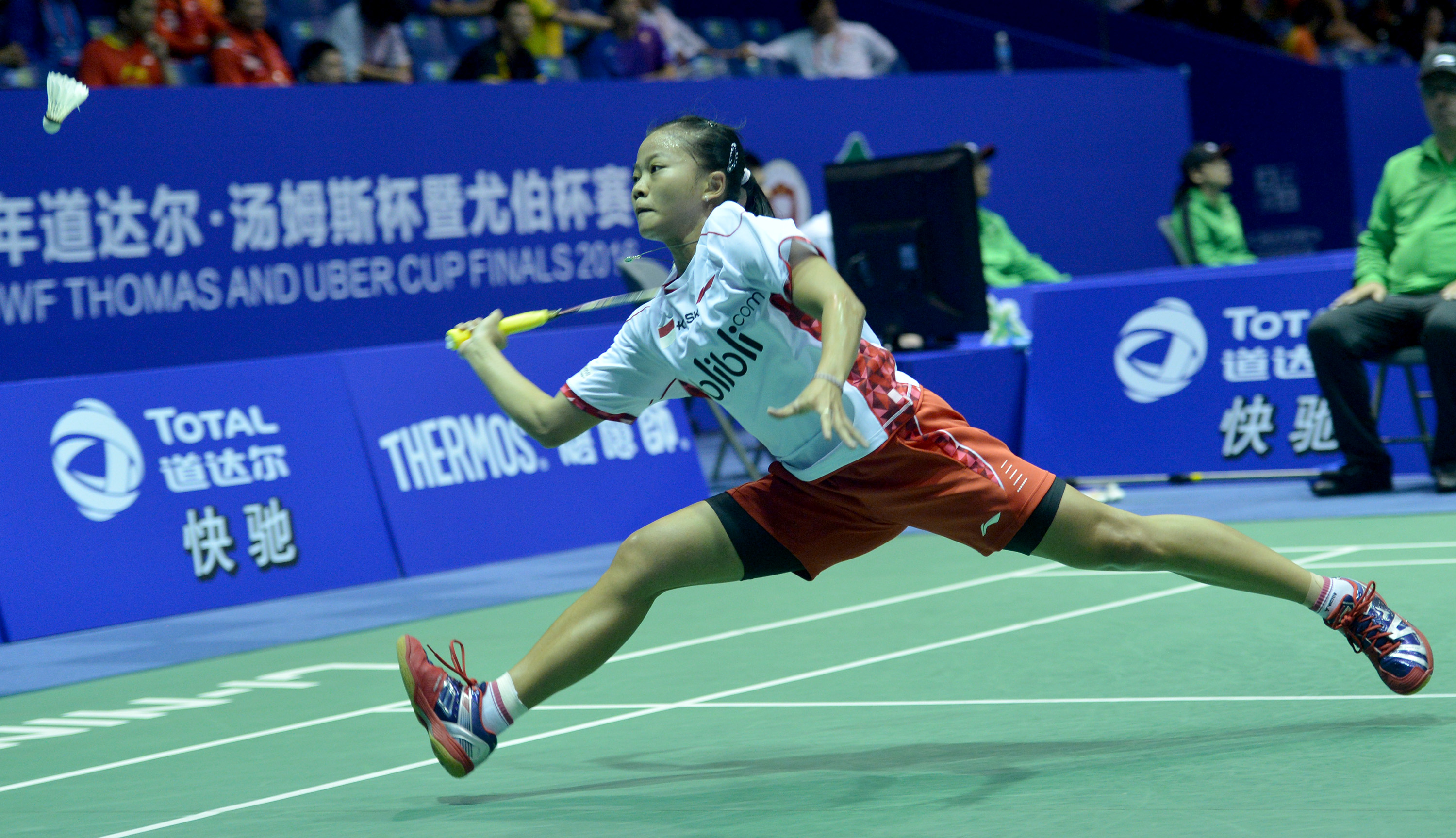 Pebulu tangkis tunggal putri Indonesia Fitriani mengembalikan kok ke arah lawannya pebulu tangkis Korea Selatan Yeon Ju Bae pada pertandingan perempat final Piala Uber 2016 di Kunshan Sport Center Gymnasium, Tiongkok, Kamis (19/5). Indonesia gagal melangkah ke semi final setelah dikalahkan Korea Selatan dengan skor 0-3. ANTARA FOTO/Prasetyo Utomo/aww/16.