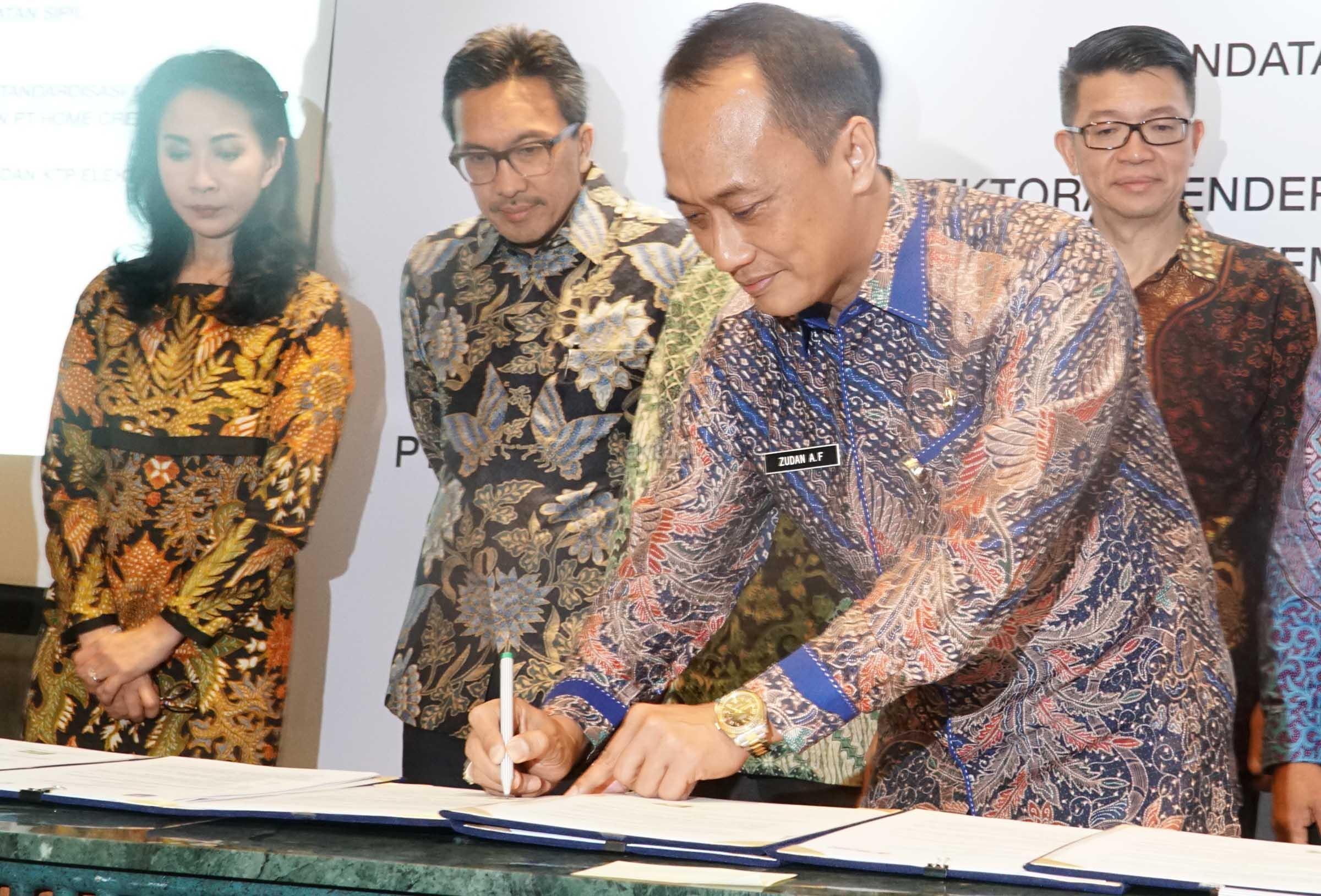 Direktur Jenderal Kependudukan dan Pencatatan sipil (Dukcapil) Kementrian Dalam Negeri, Zudan Arif Fakrulloh disaksikan (dari kiri ke kanan) Direktur Compliance,Corporate Secretary, and Legal CIMB Niaga, Fransiska Oei, Presiden Direktur CIMB Niaga, Tigor M Siahaan, Direktur Utama Nobu Bank, Suhaimin Djohan menandatngani naskah kerja sama di Jakarta, Kamis (22/6). CIMB Niaga bekerja sama dengan Dukcapil Kementrian Dalam Negeri terkait pemanfaatan data kependudukan dalam layanan perbankan. Melalui kerja sama ini, CIMB Niaga dapat menanfaatkan Nomor Induk Kependudukan (NIK), Data Kpendudukan, serta data Kartu Tanda Penduduk (KTP) Elektronik yang tercatat di Dukcapil untuk berbagai kebutuhan, seperti registrasi berbagai produk secara online serta meningkatkan efektivitas, akurasi, keamanan layanan, serta effesiensi transaksi perbankan.Kerja sama ini juga mendorong upaya CIMB Niaga untuk meningkatkan beragam layanan perbankan berbasis digital. AKTUAL/Eko S Hilman