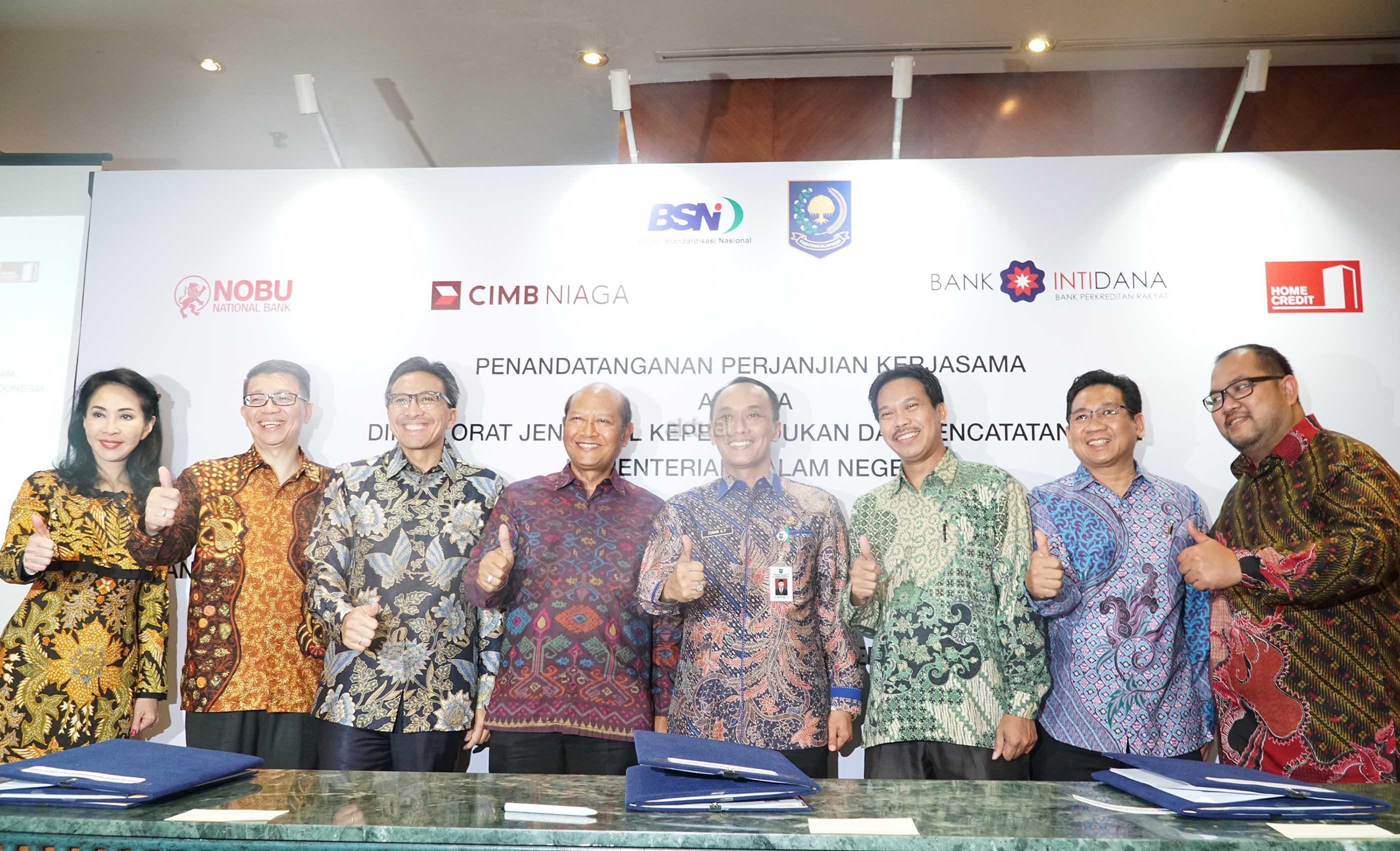 (dari kiri ke kanan) Direktur Utama Nobu Bank, Suhaimin Djohan, Direktur Compliance,Corporate Secretary, and Legal CIMB Niaga, Fransiska Oei, Presiden Direktur CIMB Niaga, Tigor M Siahaan,Deputi Bidang Penelitian dan kerja sama Standarisasi Badan Standarisasi Nasional (BSN),Nyaman Supriyatna, Direktur Jenderal Kependudukan dan Pencatatan sipil (Dukcapil) Kementrian Dalam Negeri, Zudan Arif Fakrulloh, Direktur Nobu Bank, Hendra Kurniawan, Direktur Utama BPR Tridana, Wage Abdi Pradja, serta Direktur Home Credit, Daniswara Pradiptha bersama sama mengacungkan jempol seusai penandatangan kerjasama di Jakarta, Kamis (22/6). CIMB Niaga bekerja sama dengan Dukcapil Kementrian Dalam Negeri terkait pemanfaatan data kependudukan dalam layanan perbankan. Melalui kerja sama ini, CIMB Niaga dapat menanfaatkan Nomor Induk Kependudukan (NIK), Data Kpendudukan, serta data Kartu Tanda Penduduk (KTP) Elektronik yang tercatat di Dukcapil untuk berbagai kebutuhan, seperti registrasi berbagai produk secara online serta meningkatkan efektivitas, akurasi, keamanan layanan, serta effesiensi transaksi perbankan.Kerja sama ini juga mendorong upaya CIMB Niaga untuk meningkatkan beragam layanan perbankan berbasis digital. AKTUAL/Eko S Hilman