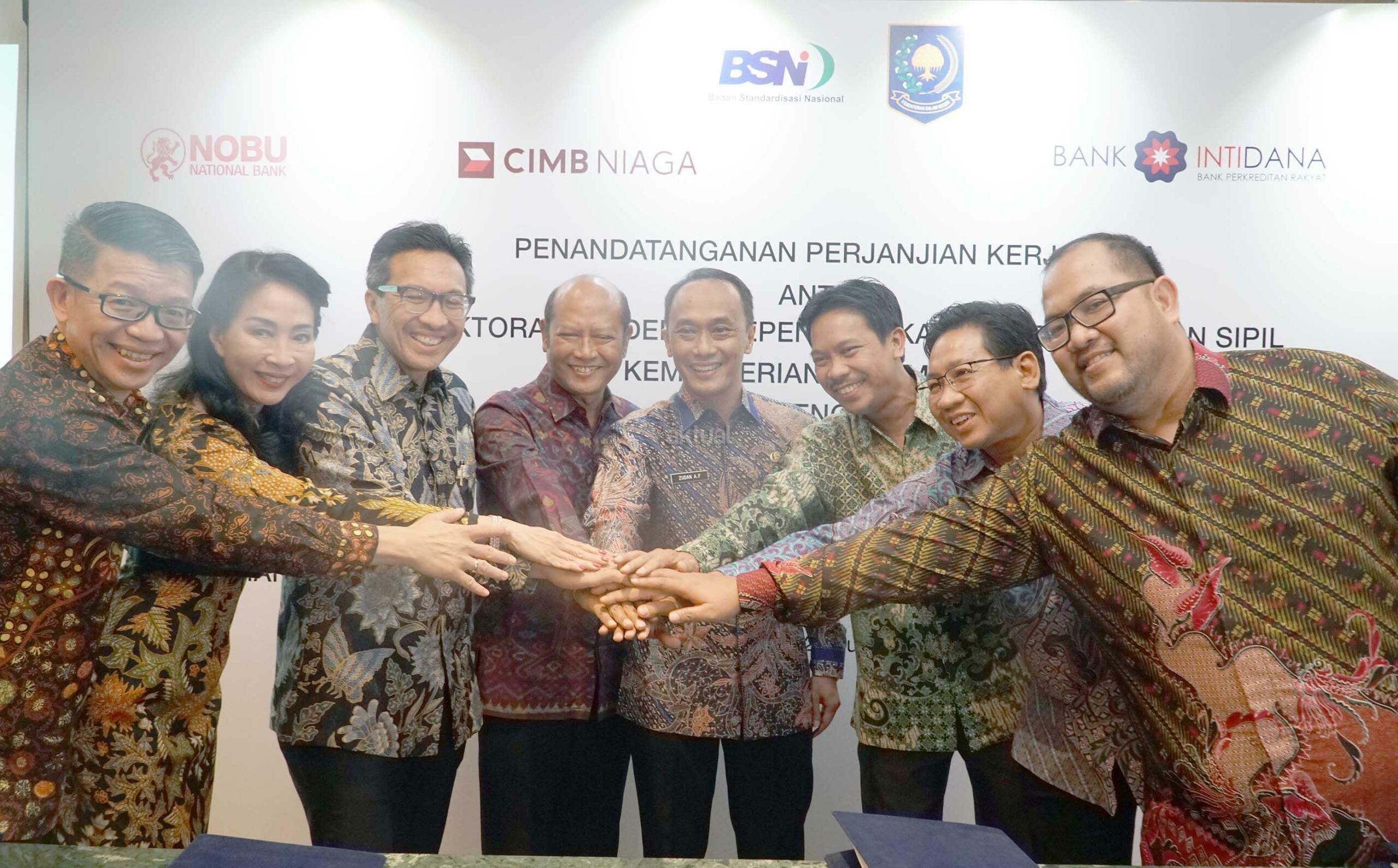 (dari kiri ke kanan) Direktur Utama Nobu Bank, Suhaimin Djohan, Direktur Compliance,Corporate Secretary, and Legal CIMB Niaga, Fransiska Oei, Presiden Direktur CIMB Niaga, Tigor M Siahaan,Deputi Bidang Penelitian dan kerja sama Standarisasi Badan Standarisasi Nasional (BSN),Nyaman Supriyatna, Direktur Jenderal Kependudukan dan Pencatatan sipil (Dukcapil) Kementrian Dalam Negeri, Zudan Arif Fakrulloh, Direktur Nobu Bank, Hendra Kurniawan, Direktur Utama BPR Tridana, Wage Abdi Pradja, serta Direktur Home Credit, Daniswara Pradiptha saling bertumpu tangan seusai penandatangan kerjasama di Jakarta, Kamis (22/6). CIMB Niaga bekerja sama dengan Dukcapil Kementrian Dalam Negeri terkait pemanfaatan data kependudukan dalam layanan perbankan. Melalui kerja sama ini, CIMB Niaga dapat menanfaatkan Nomor Induk Kependudukan (NIK), Data Kpendudukan, serta data Kartu Tanda Penduduk (KTP) Elektronik yang tercatat di Dukcapil untuk berbagai kebutuhan, seperti registrasi berbagai produk secara online serta meningkatkan efektivitas, akurasi, keamanan layanan, serta effesiensi transaksi perbankan.Kerja sama ini juga mendorong upaya CIMB Niaga untuk meningkatkan beragam layanan perbankan berbasis digital. AKTUAL/Eko S Hilman