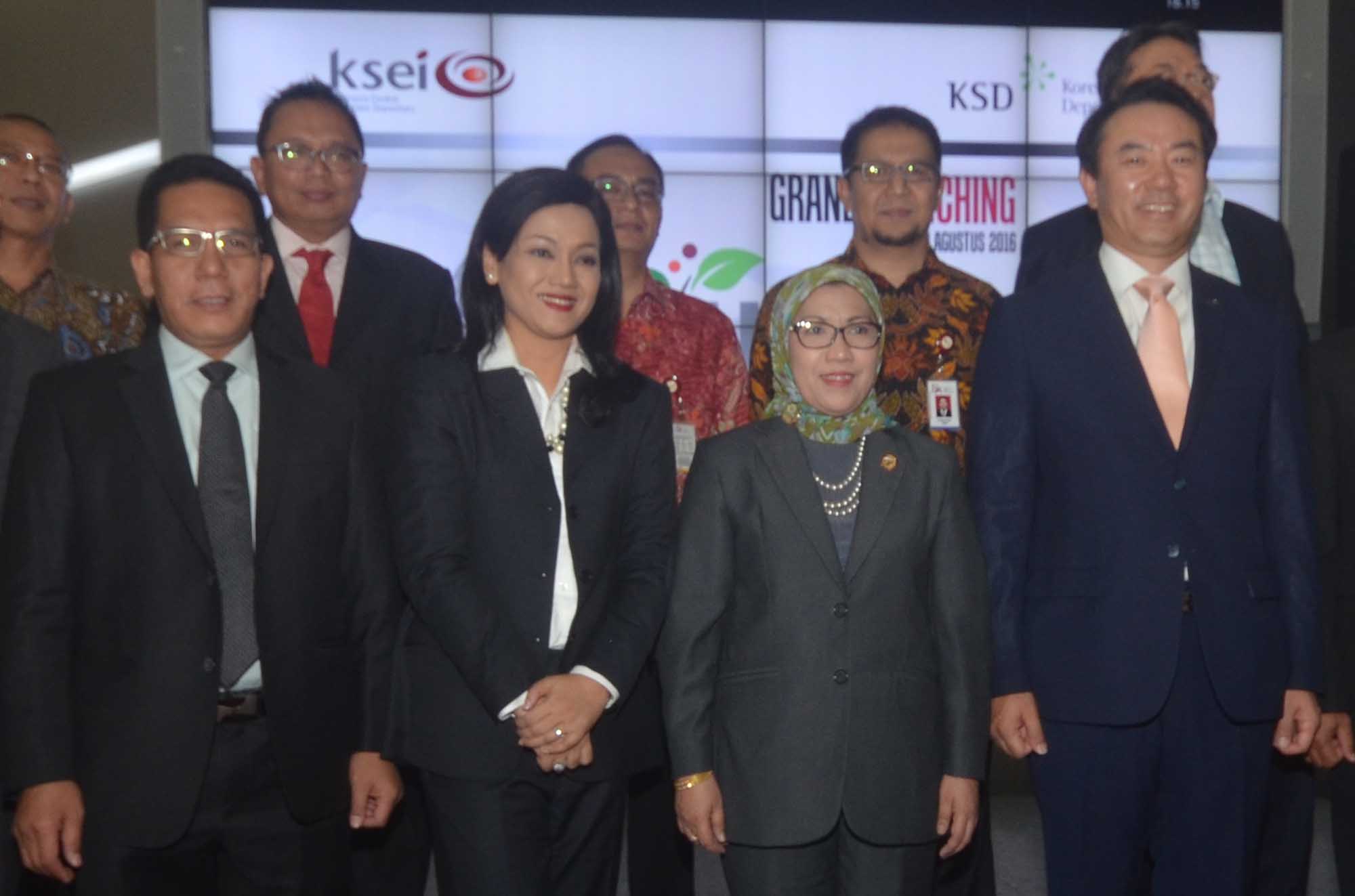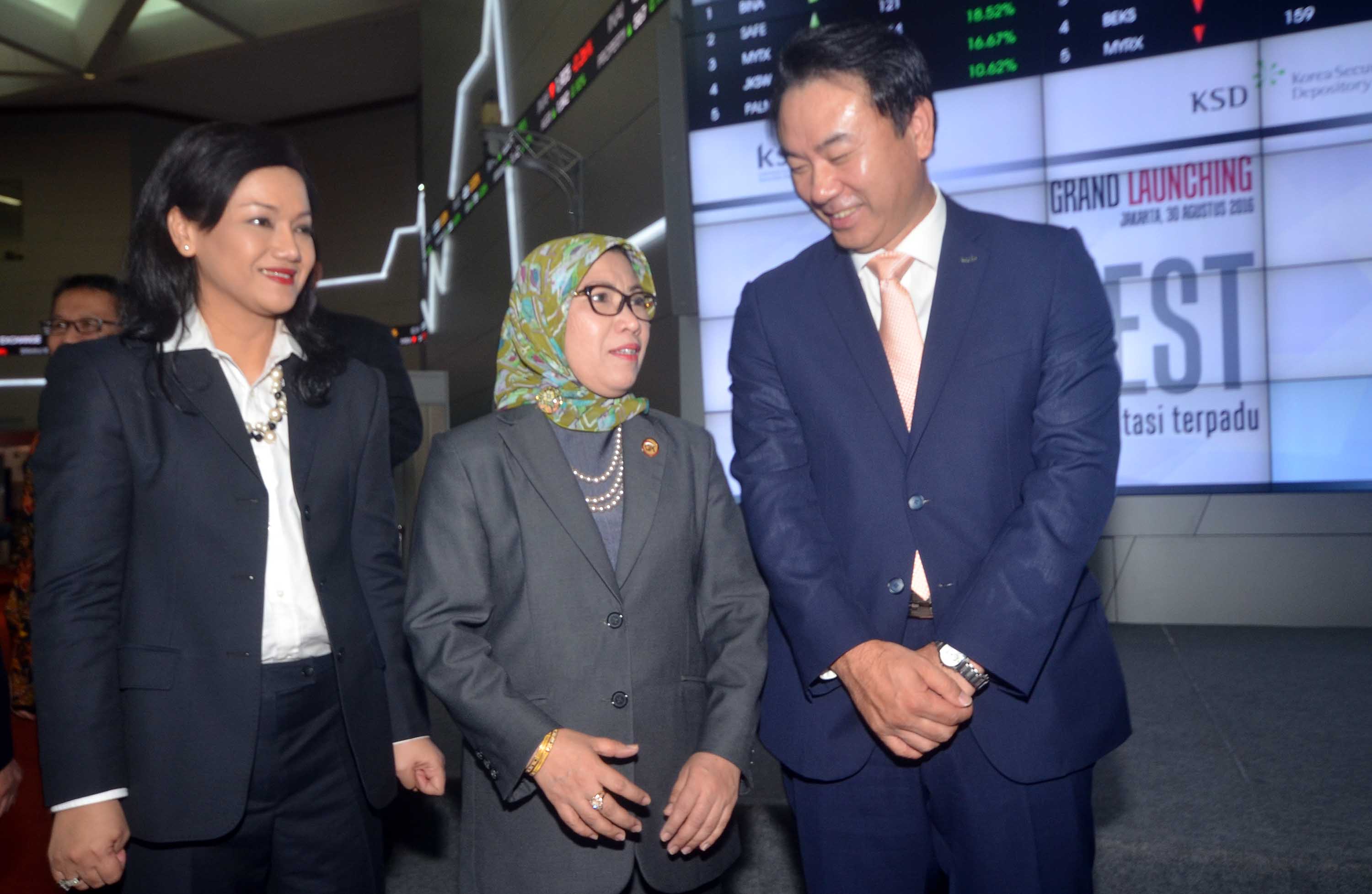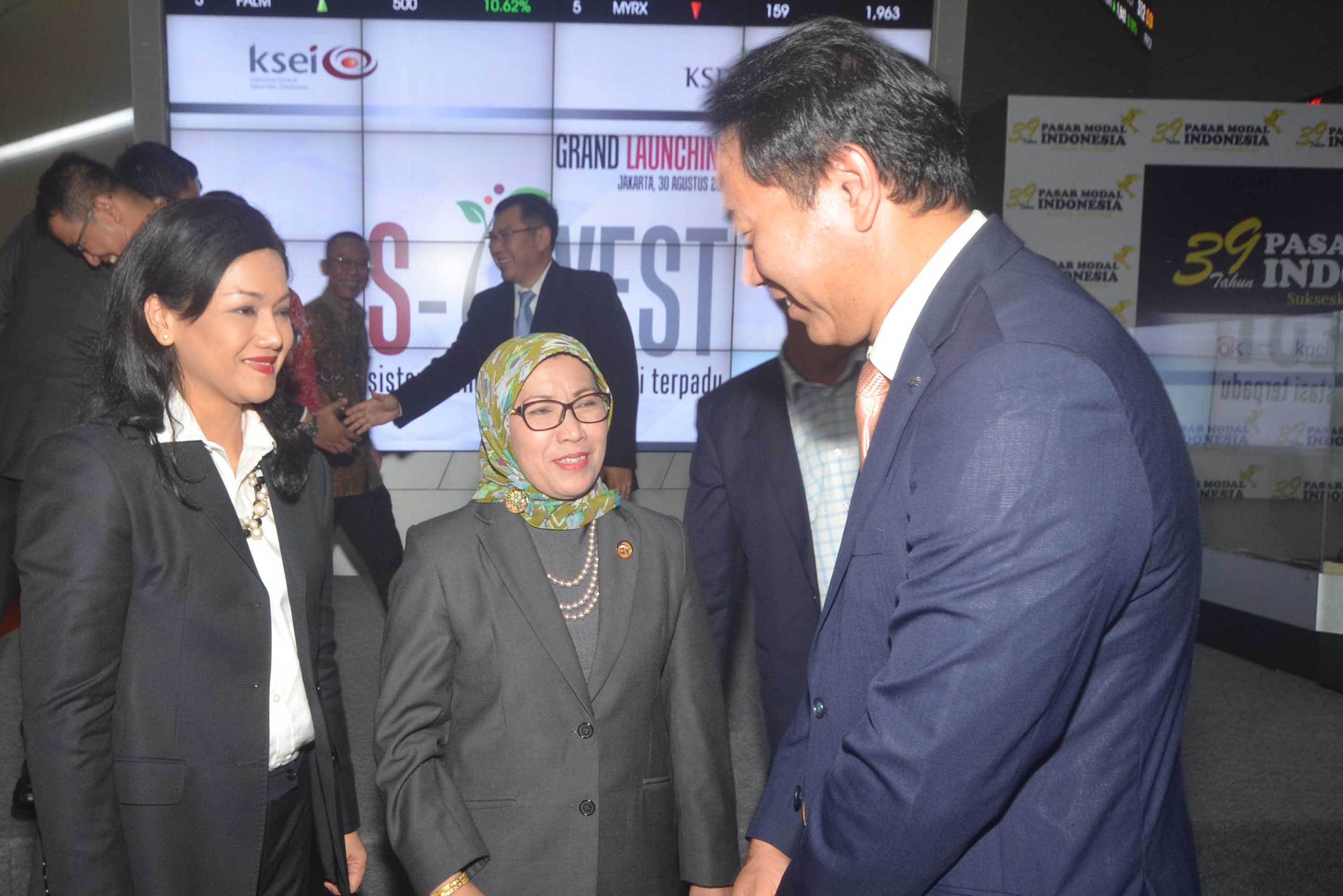 Kepala Eksekutif Pengawas Pasar Modal, Otoritas Jasa Keuangan (OJK), Nurhaida (tengah) berbincang dengan Chairman & CEO Korea Securities Depository (KSD) Jaehoon Yoo (kanan) dan Direktur Utama KSEI Friderica Widyasari Dewi seusai secara resmi meluncurkan Sistem Pengelolaan Investasi Terpadu atau S-INVEST di Jakarta,Rabu (30/8) Dengan telah diluncurkannya S-INVEST, maka Pasar Modal Indonesia kini memiliki platform dan sistem yang terintegrasi untuk industri pengelolaan investasi, Implementasi ini juga merupakan pencapaian salah satu target master plan sektor jasa keuangan Indonesia tahun 2015 – 2019. Hal ini merupakan wujud komitmen KSEI untuk mendukung perkembangan Pasar Modal Indonesia melalui pembangunan infrastruktur maupun sistem, dalam menjawab kebutuhan pasar