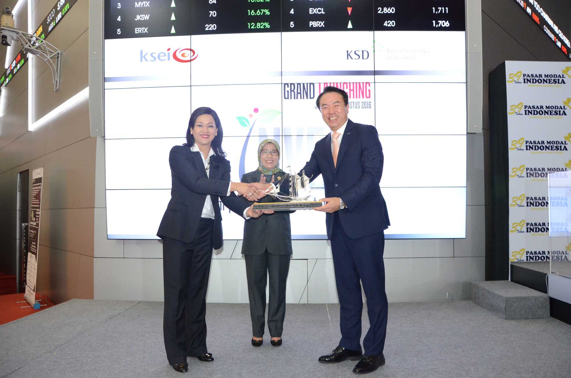 Direktur Utama KSEI Friderica Widyasari Dewi (kiri) memberikan cinderamata kepada Chairman & CEO Korea Securities Depository (KSD) Jaehoon Yoo (kanan) disaksikan Kepala Eksekutif Pengawas Pasar Modal, Otoritas Jasa Keuangan (OJK), Nurhaida (tengah) seusai secara resmi meluncurkan Sistem Pengelolaan Investasi Terpadu atau S-INVEST di Jakarta,Rabu (30/8) Dengan telah diluncurkannya S-INVEST, maka Pasar Modal Indonesia kini memiliki platform dan sistem yang terintegrasi untuk industri pengelolaan investasi, Implementasi ini juga merupakan pencapaian salah satu target master plan sektor jasa keuangan Indonesia tahun 2015 - 2019. Hal ini merupakan wujud komitmen KSEI untuk mendukung perkembangan Pasar Modal Indonesia melalui pembangunan infrastruktur maupun sistem, dalam menjawab kebutuhan pasar