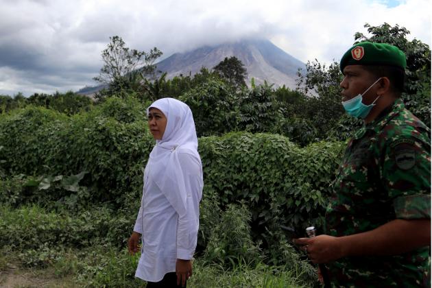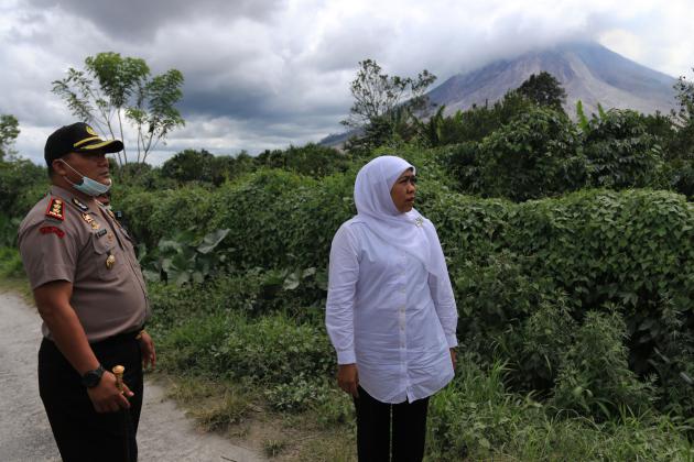 Menteri Sosial Khofifah Indar Parawansa (tengah) berbincang dengan pengungsi erupsi Gunung Sinabung, di Posko Pengungsian Kabanjahe, Karo, Sumatera Utara, Senin (23/5). Kunjungan Menteri Sosial tersebut selain memberikan bantuan kepada pengungsi, juga untuk melihat fasilitas yang ada selama di pengungsian. ANTARA FOTO/Irsan Mulyadi/ama/16