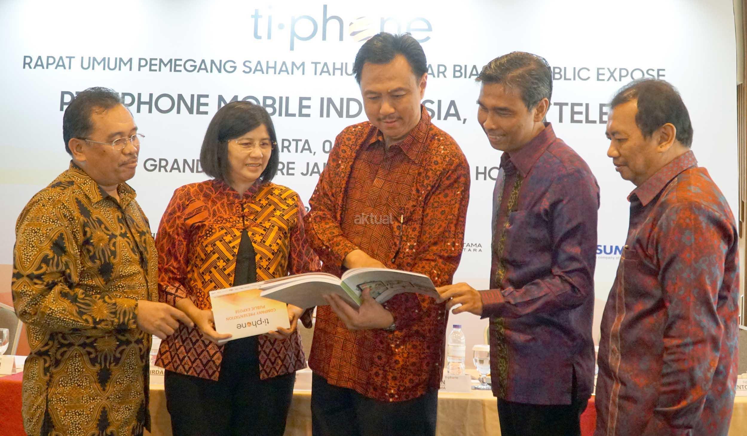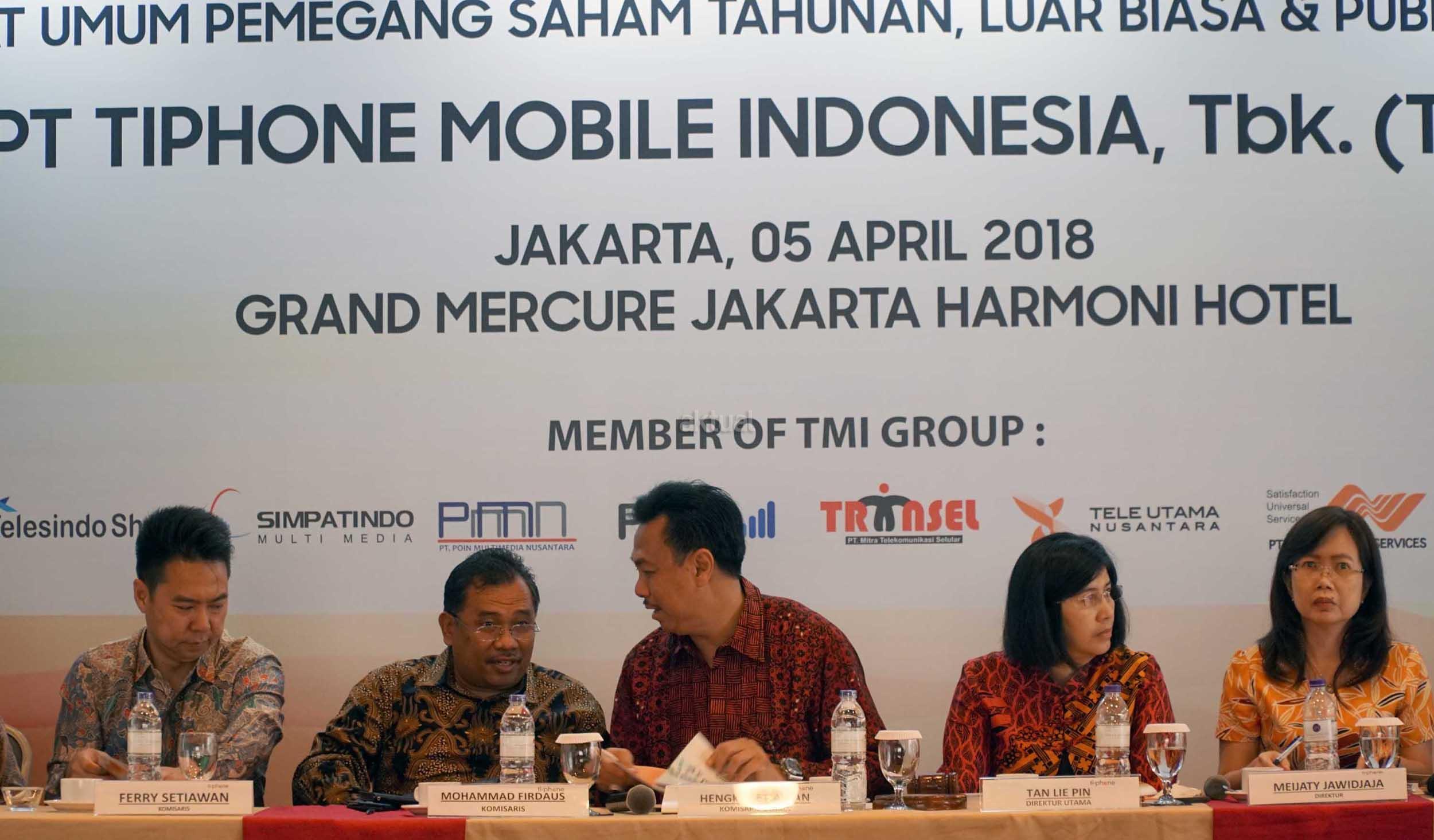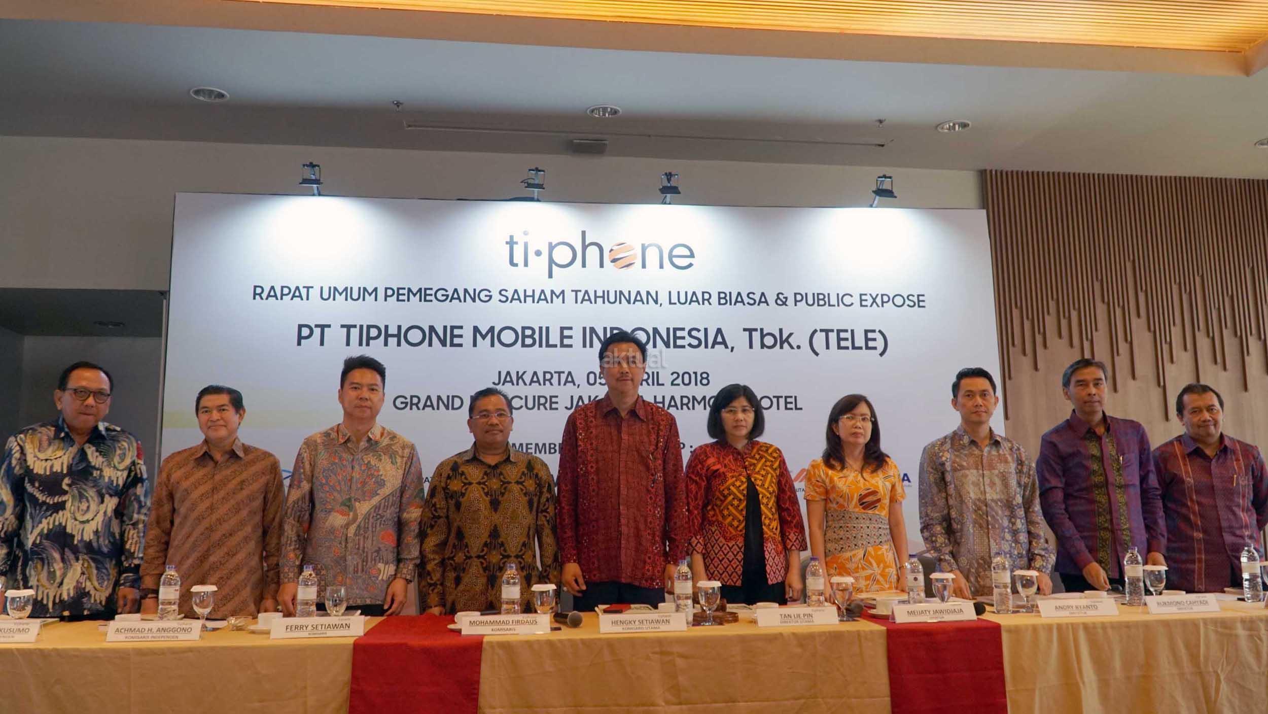 Jajaran Direksi dan Komisaris PT Tiphone Mobile Indonesia Tbk (TELE) saat melaksanakan RUPS Tahunan dan RUPS Luar Biasa di Jakarta, Kamis,5 April 2018. Perseroan yang bergerak di bidang distribusi produk dan layanan seluler di Indonesia dan menjadi distributor terbesar di Indonesia untuk produk Telkom Group tersebut menargetkan akan mengandeng 100.000 Usaha Mikro Kecil menengah (UMKM) di seluruh Indonesia untuk bergabung dalam layanan teknologi keuangan digital (fintech). Dan Tahun 2018 ini juga, TELE menargetkan pertumbuhan jumlah reseller menjadi 300.000 reseller, Sementara RUPS tahunan dan RUPSLB perseroan yang memiliki 200 cabang, 400 outlet, 96 layanan service center itu akan memberikan deviden sebesar Rp 5 per saham serta menyetujui menerbitkan Obligasi sukuk dan surat utang lainnya dengan nilai Rp 2 Triliun. AKTUAL/Eko S Hilman