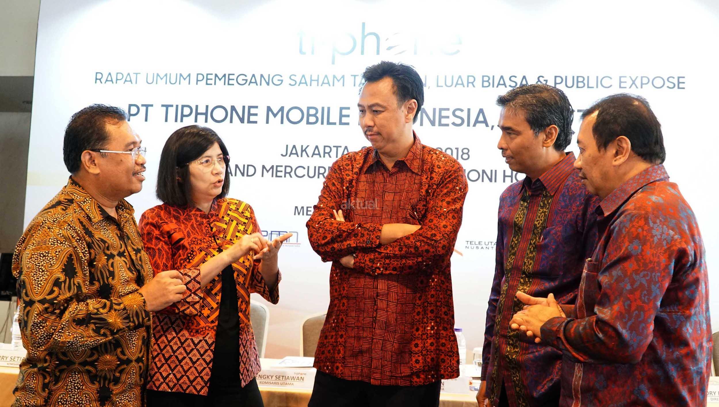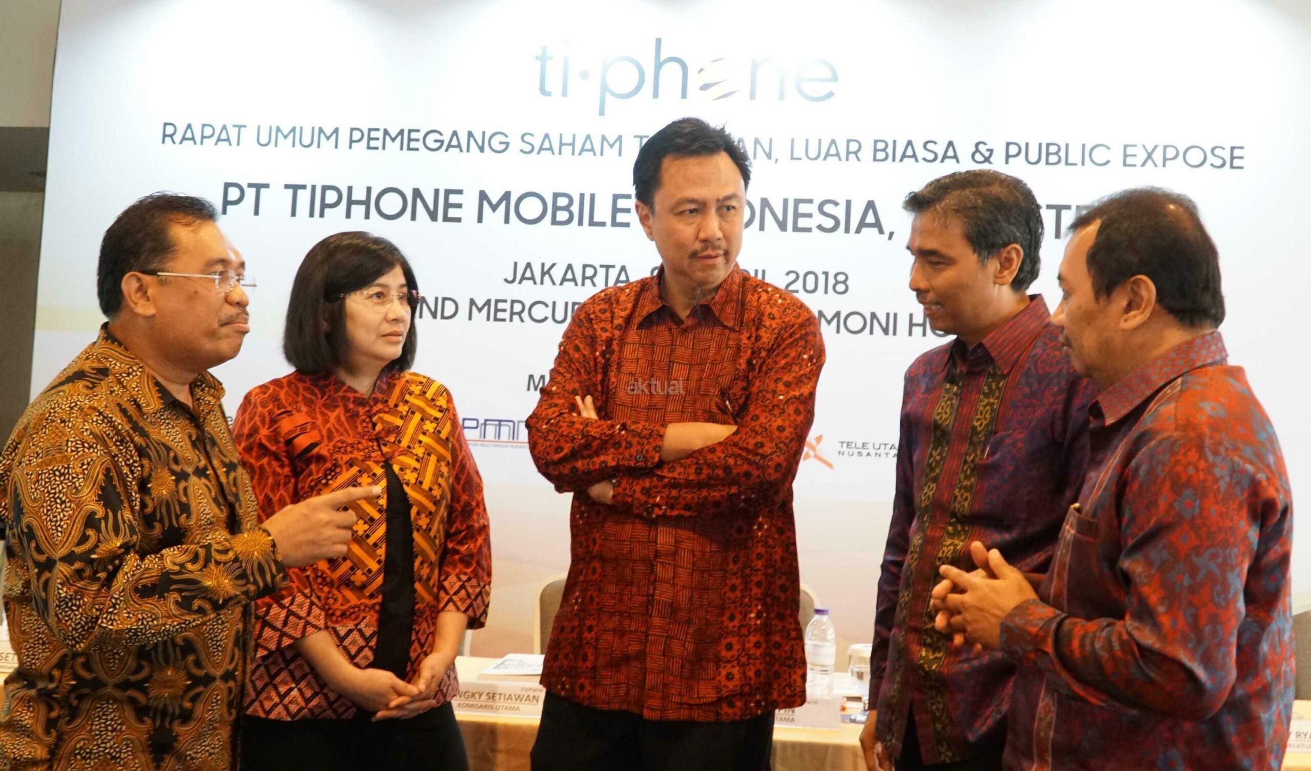 (dari kiri ke kanan) Komisaris PT Tiphone Mobile Indonesia Tbk (TELE), Mohammad Firdaus, Presiden Direktur, Tan Lie Pin, Presiden Komisaris, Hengky Setiawan, Direktur, Rukmono Cahyadi, Direktur Independen, Gatot Bekti Haryono berbincang seusai melaksanakan RUPS Tahunan dan RUPS Luar Biasa di Jakarta, Kamis,5 April 2018. Perseroan yang bergerak di bidang distribusi produk dan layanan seluler di Indonesia dan menjadi distributor terbesar di Indonesia untuk produk Telkom Group tersebut menargetkan akan mengandeng 100.000 Usaha Mikro Kecil menengah (UMKM) di seluruh Indonesia untuk bergabung dalam layanan teknologi keuangan digital (fintech). Dan Tahun 2018 ini juga, TELE menargetkan pertumbuhan jumlah reseller menjadi 300.000 reseller, Sementara RUPS tahunan dan RUPSLB perseroan yang memiliki 200 cabang, 400 outlet, 96 layanan service center itu akan memberikan deviden sebesar Rp 5 per saham serta menyetujui menerbitkan Obligasi sukuk dan surat utang lainnya dengan nilai Rp 2 Triliun. AKTUAL/Eko S Hilman