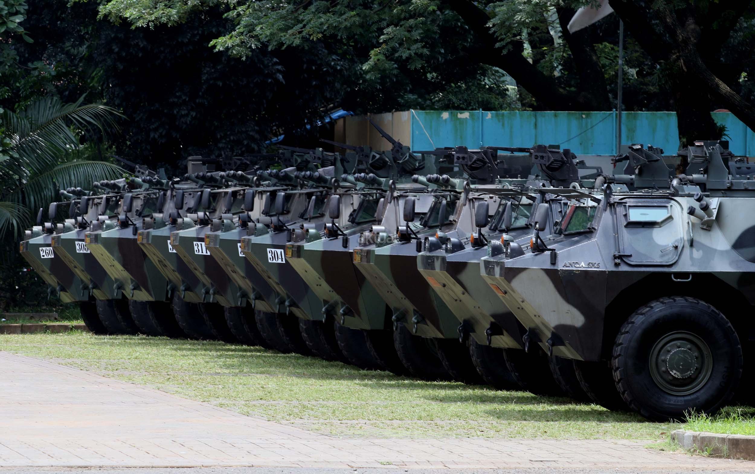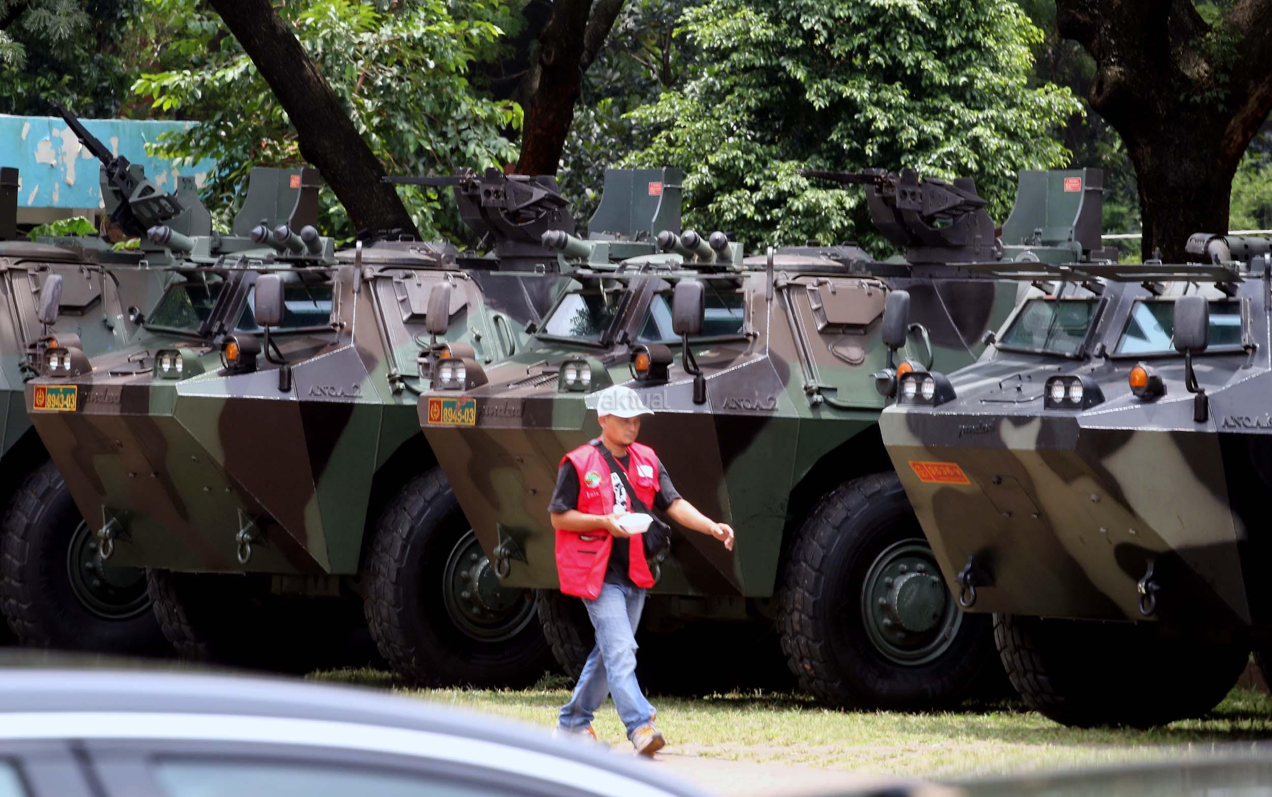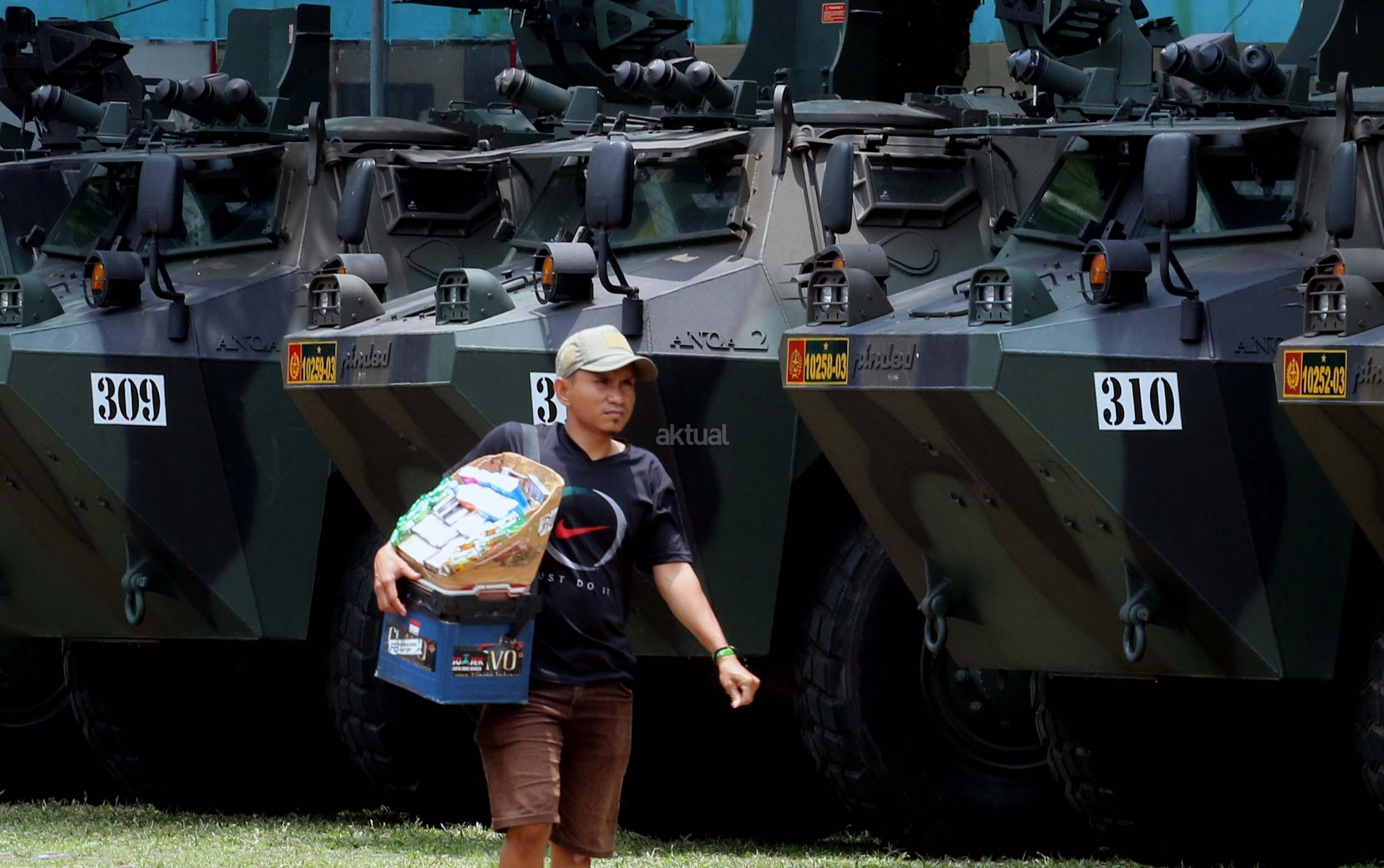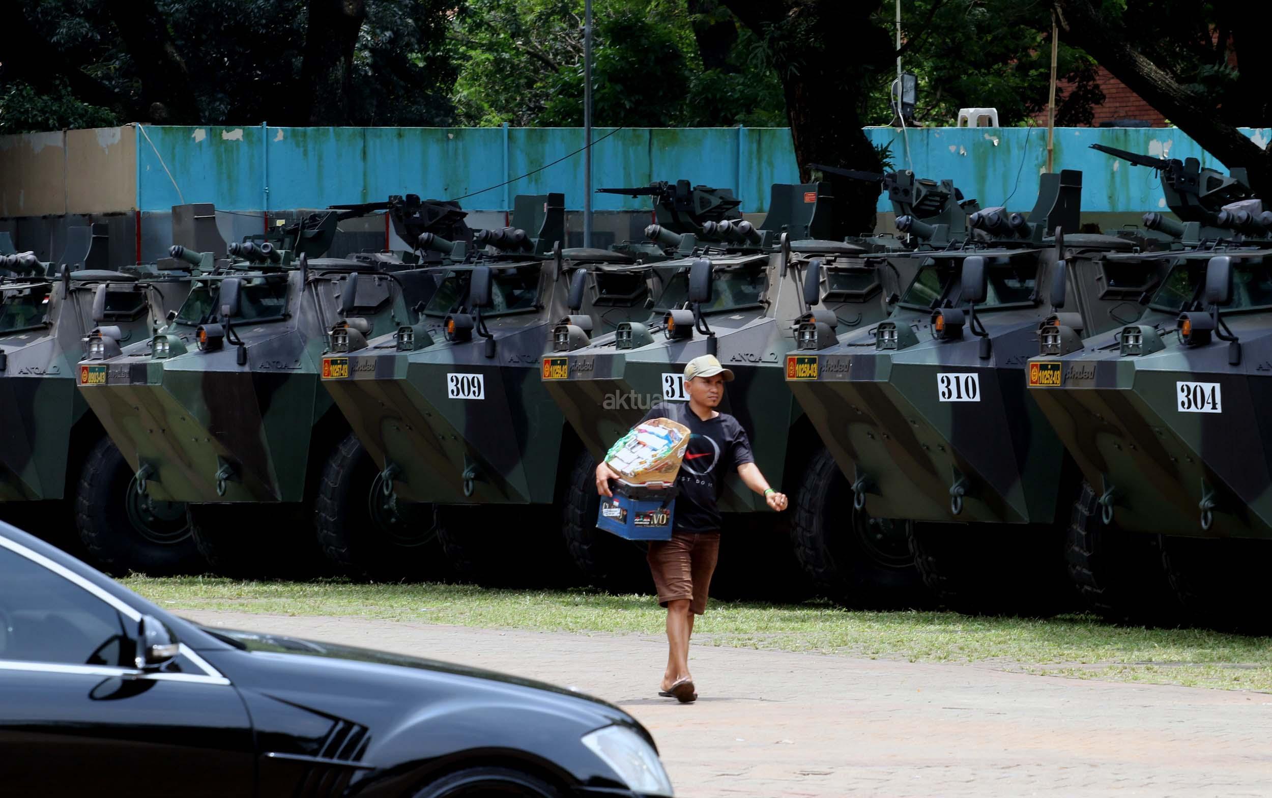 Seorang pria melintas di depan panser Anoa yang akan dipakai untuk mengamankan rombongan kedatangan Raja Salman di Parkir Timur Senayan, Jakarta, Selasa (28/2/2017). TNI mensiagakan puluhan kendaraan taktis Panser Anoa dalam pengamanan rombongan Raja Salman ke Jakarta.