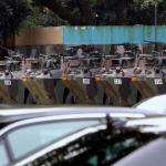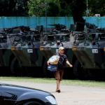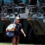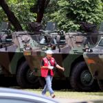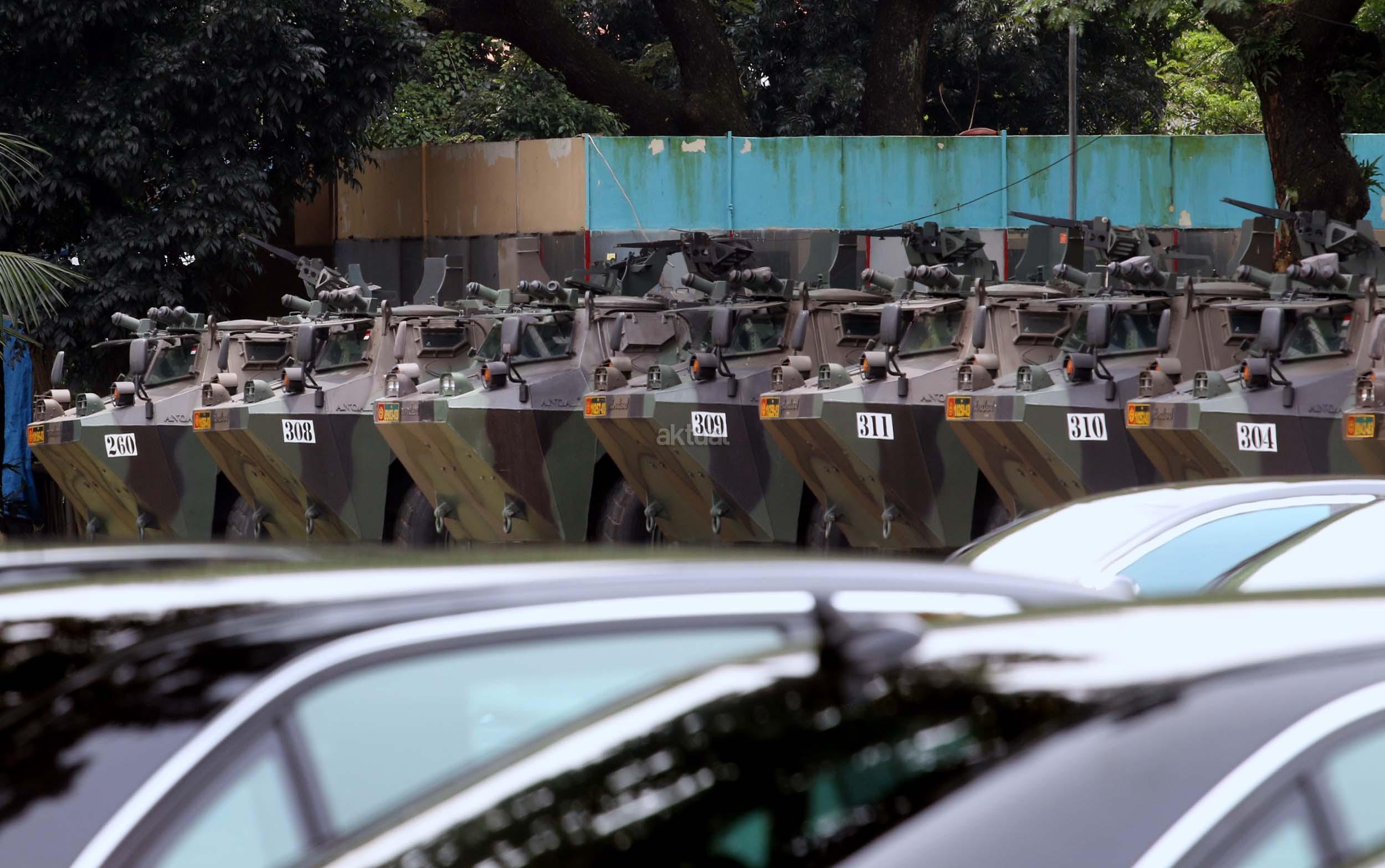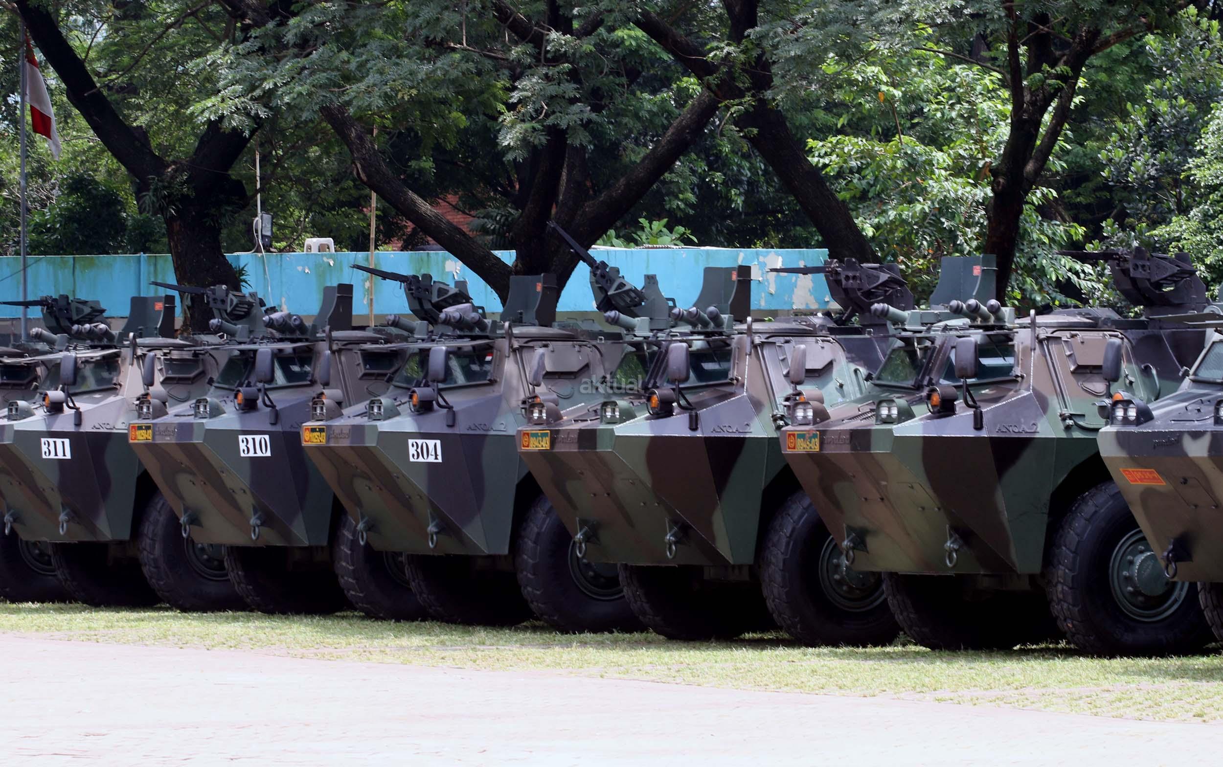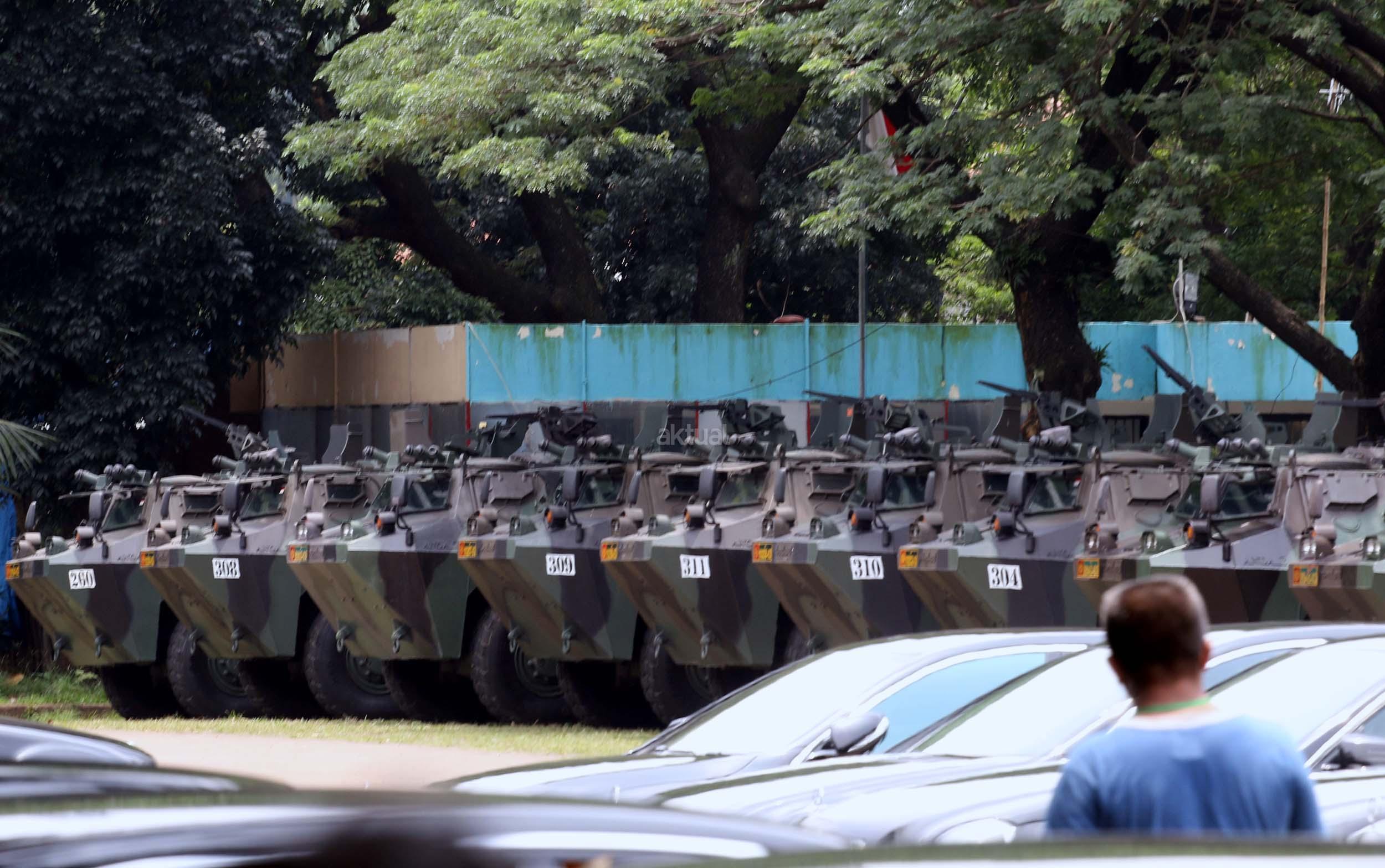 Seorang pria melintas di depan panser Anoa yang akan dipakai untuk mengamankan rombongan kedatangan Raja Salman di Parkir Timur Senayan, Jakarta, Selasa (28/2/2017). TNI mensiagakan puluhan kendaraan taktis Panser Anoa dalam pengamanan rombongan Raja Salman ke Jakarta.