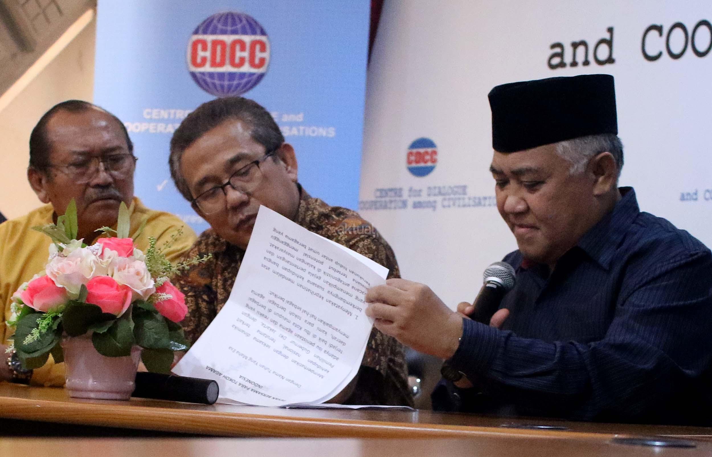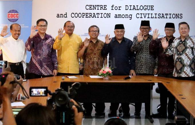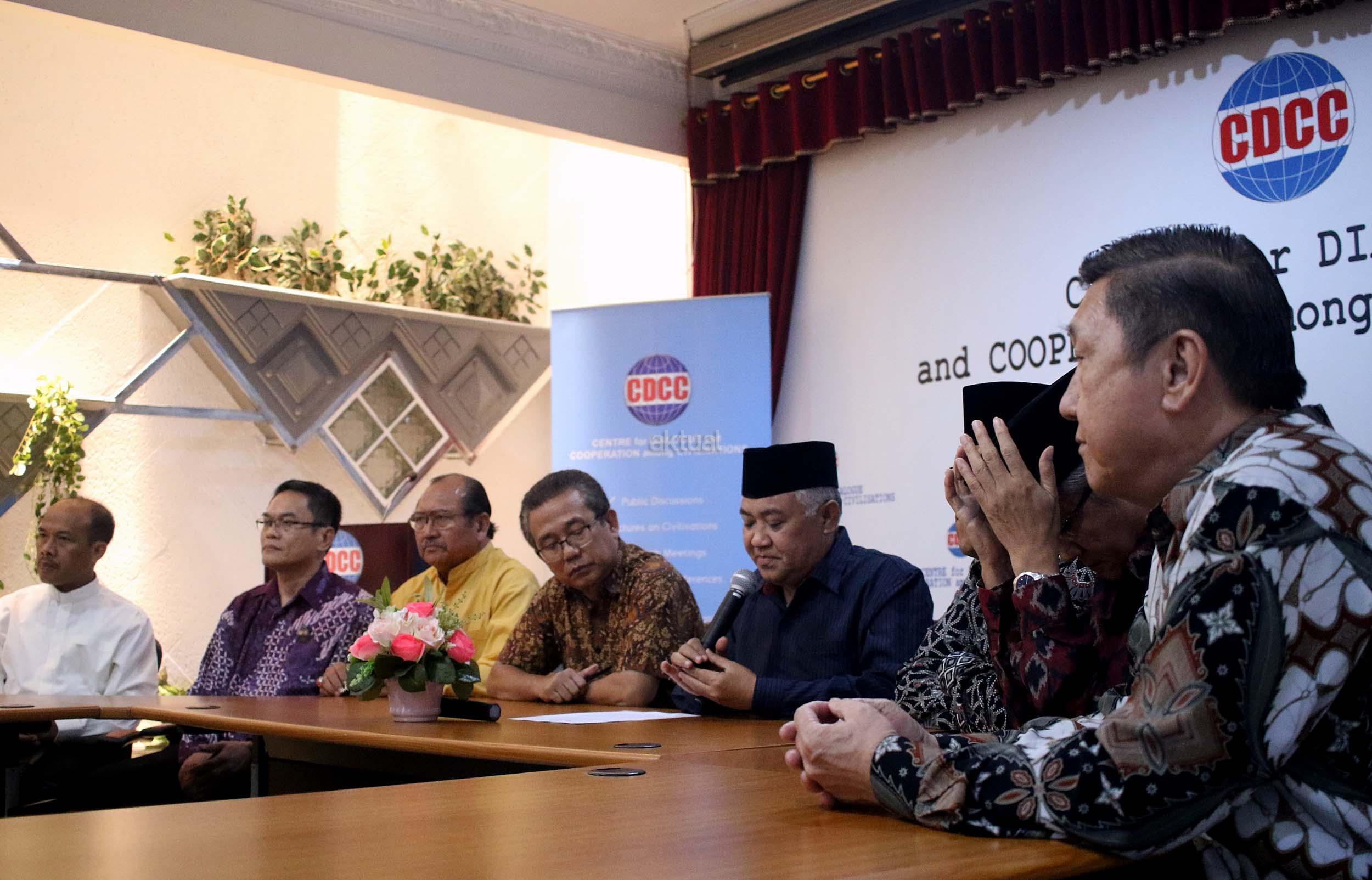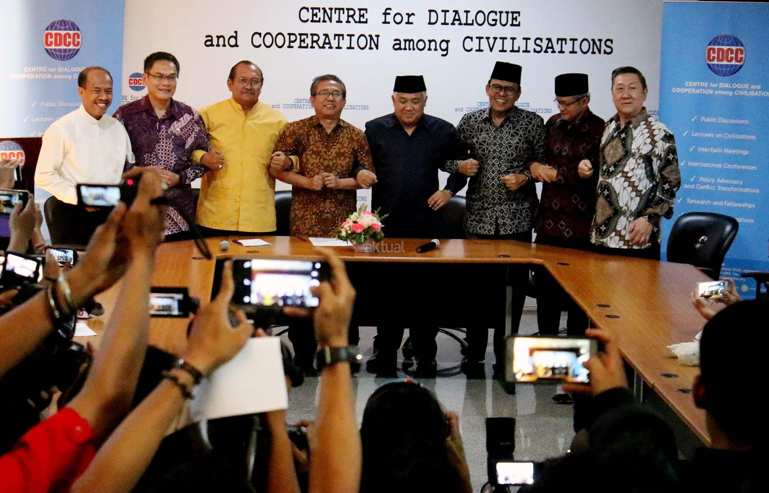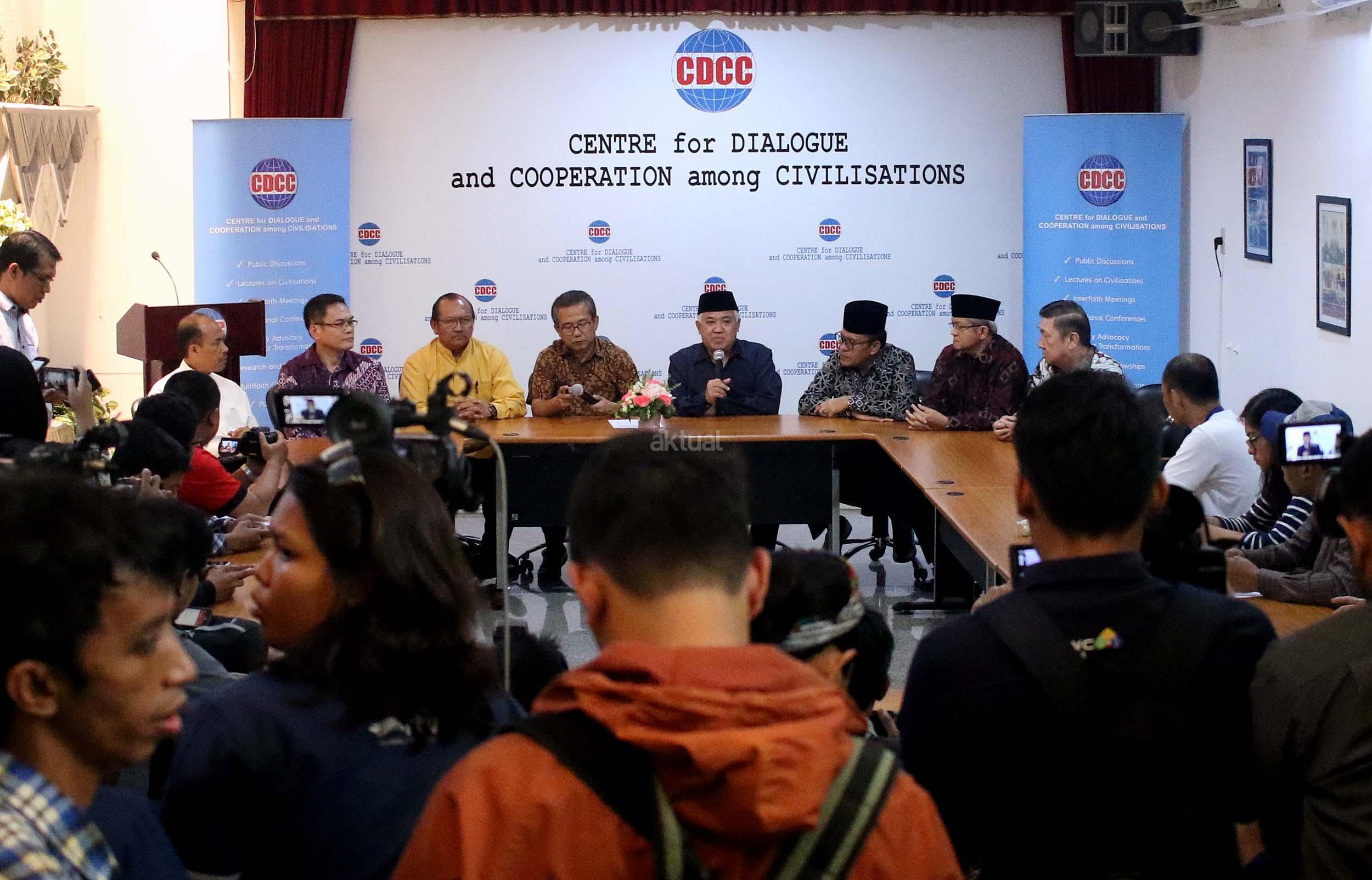 Presidium Inter Religious Council Indonesia (IRC) Din Syamsuddin, bersama tokoh lintas agama memberikan pernyataan sikap menyikapi isu yang berkembang terkait penistaan agama di Kantor CDCC, Jakarta, senin (17/10/2016). Sejumlah tokoh lintas agama meminta sejumlah pihak menahan diri dalam perkataan dan perbuatan yang dapat mendorong pertentangan dalam masyarakat majemuk, terutama menyinggung wilayah sensitifitas menyangkut keyakinan agama, ras dan suku.