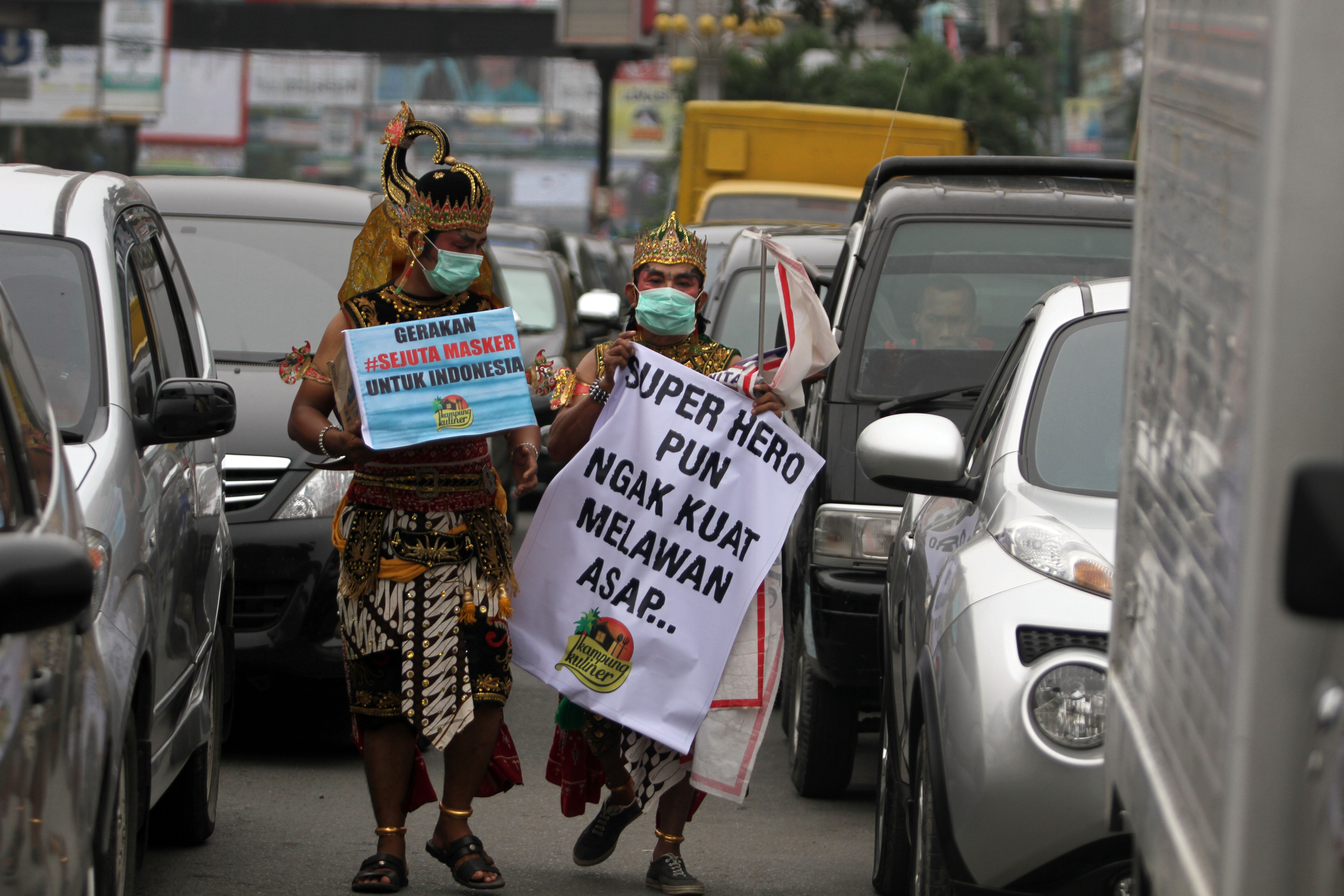 Anggota komunitas Kampung Kuliner dan Komunitas Sepeda Tua Indonesia (Kosti) mengenakan kostum tokoh pewayangan ketika menggelar aksi "Gerakan Sejuta Masker Untuk Indonesia" di Bundaran Majestik Medan, Sumatera Utara, Selasa (6/10). Aksi tersebut sebagai bentuk keprihatinan terhadap bencana kabut asap yang melanda kawasan Pulau Sumatera dan Kalimantan akibat kebakaran lahan dan hutan. ANTARA FOTO/Irsan Mulyadi/pd/15