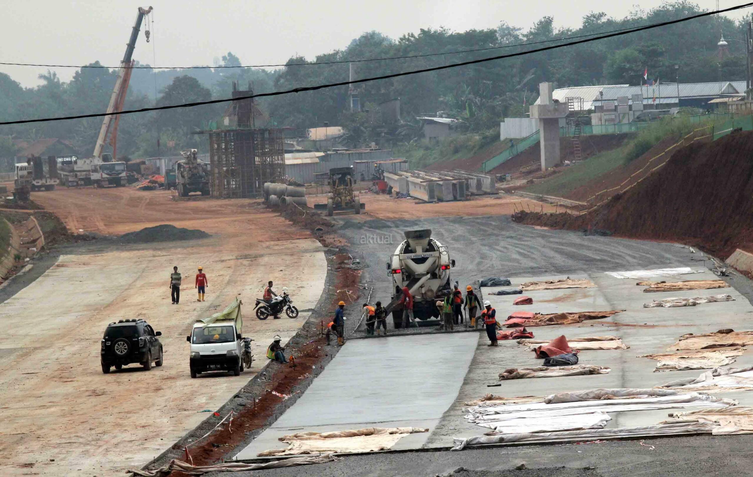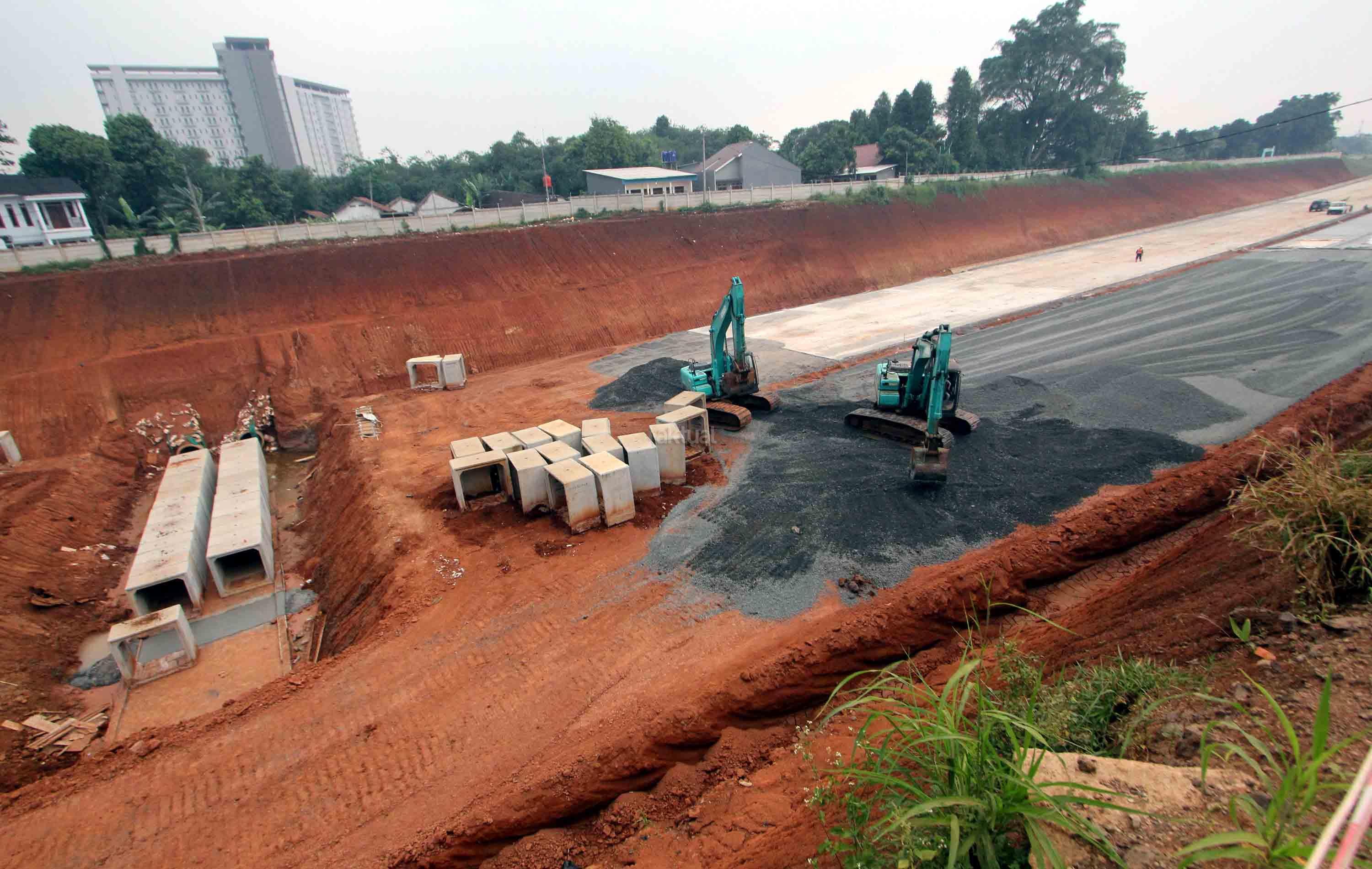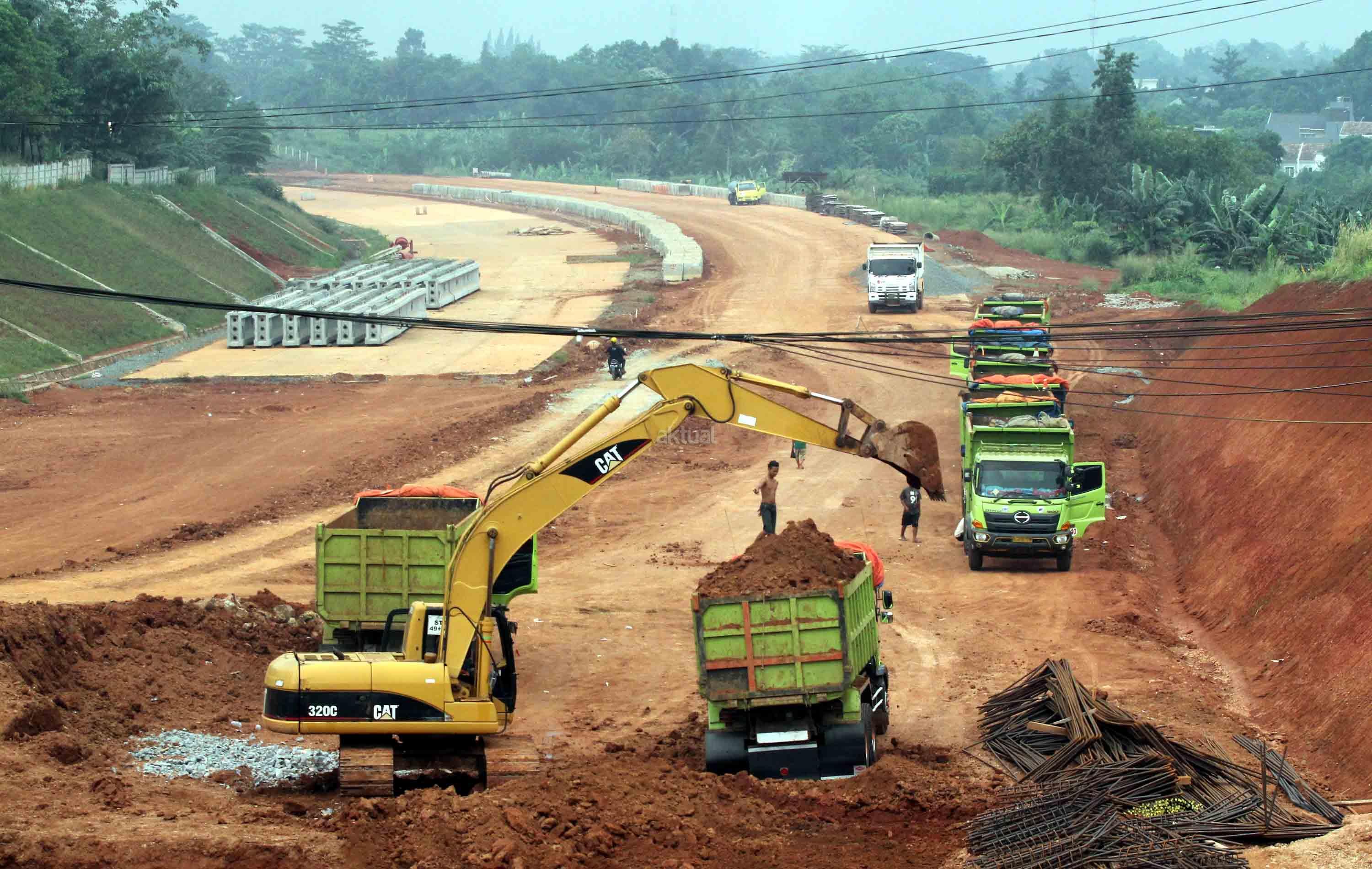 Aktivitas proyek pembangunan Tol Kunciran Serpong di Jombang, Tangerang Selatan, Banten, Minggu (20/5). Jalan Tol Kunciran-Serpong sepanjang 11,2 kilometer merupakan bagian dari jaringan Jalan Tol Lingkar Luar Jakarta (JORR) 2 yang akan menghubungkan Bandara Soekarno-Hatta hingga Cibitung. AKTUAL/Tino Oktaviano