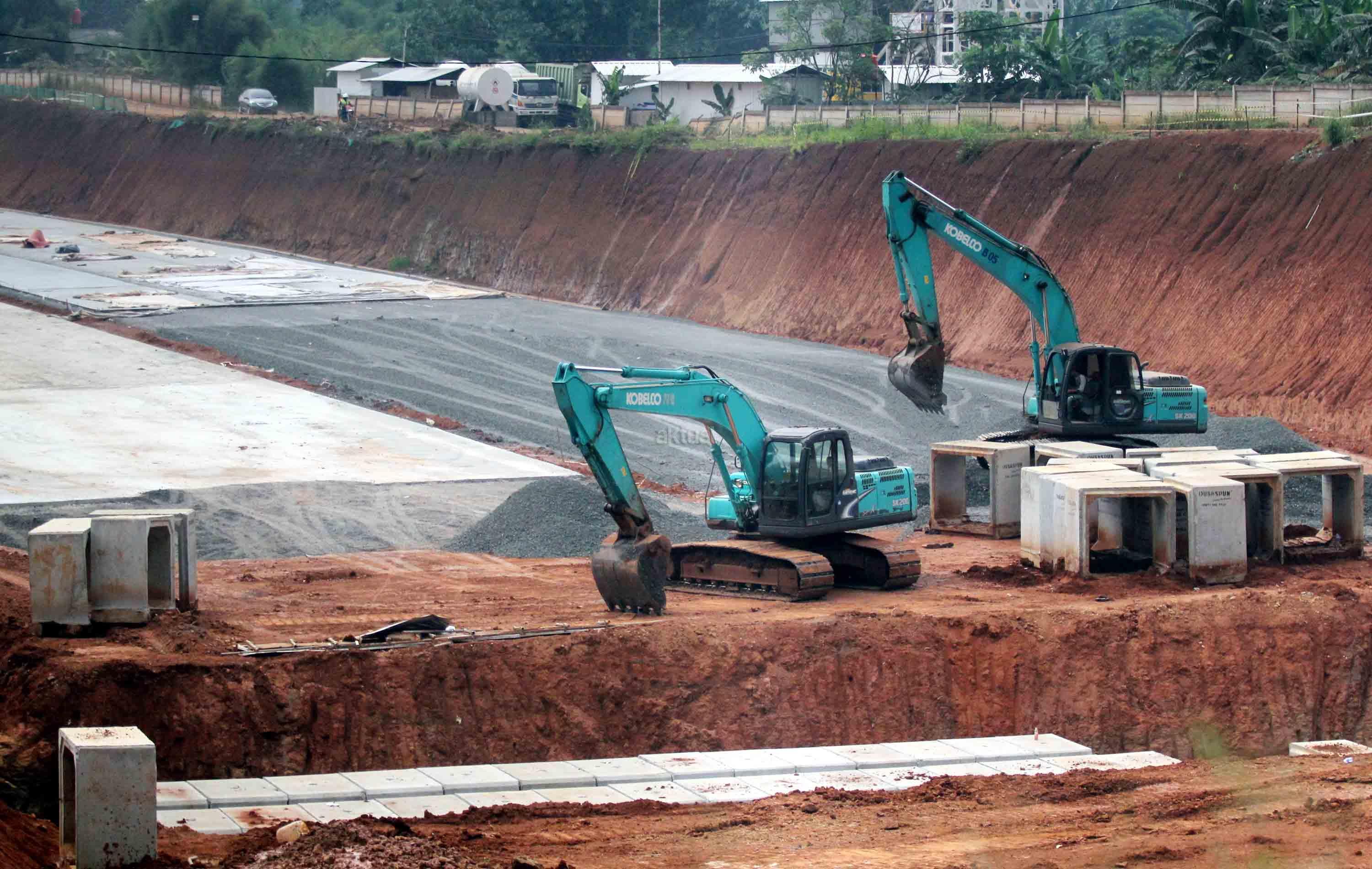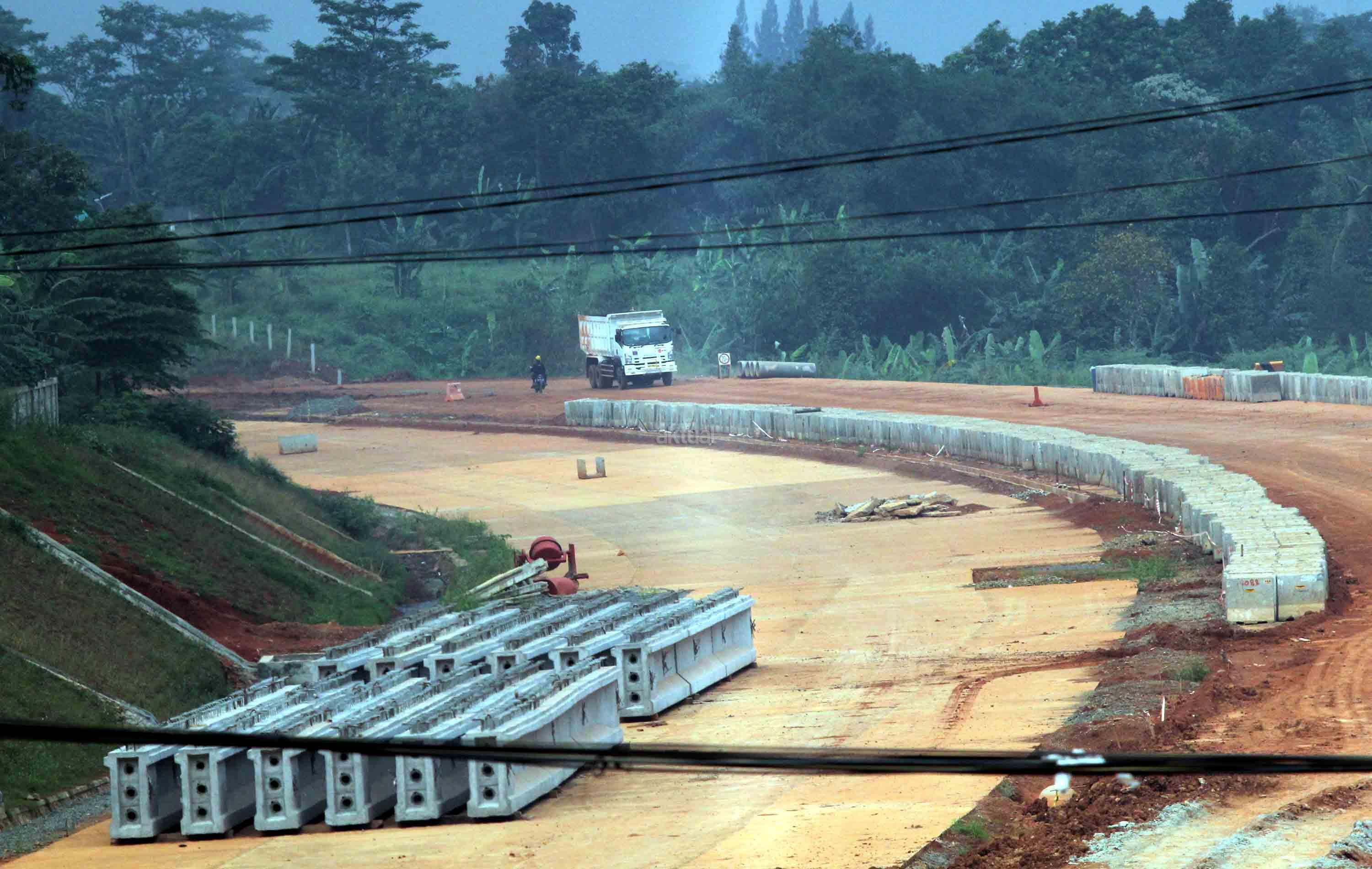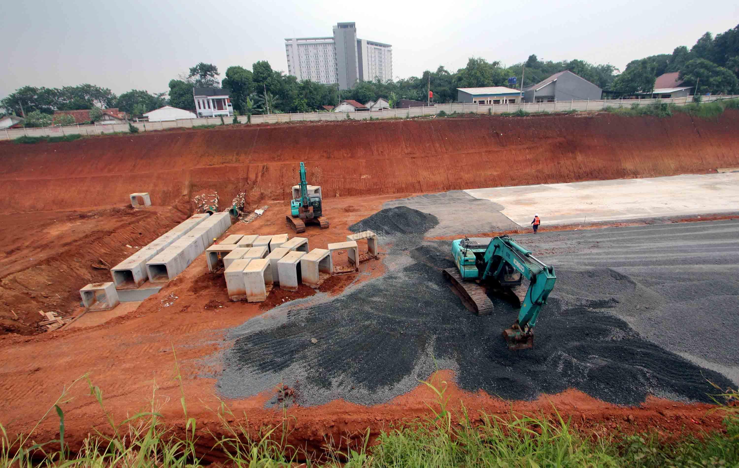 Aktivitas proyek pembangunan Tol Kunciran Serpong di Jombang, Tangerang Selatan, Banten, Minggu (20/5). Jalan Tol Kunciran-Serpong sepanjang 11,2 kilometer merupakan bagian dari jaringan Jalan Tol Lingkar Luar Jakarta (JORR) 2 yang akan menghubungkan Bandara Soekarno-Hatta hingga Cibitung. AKTUAL/Tino Oktaviano