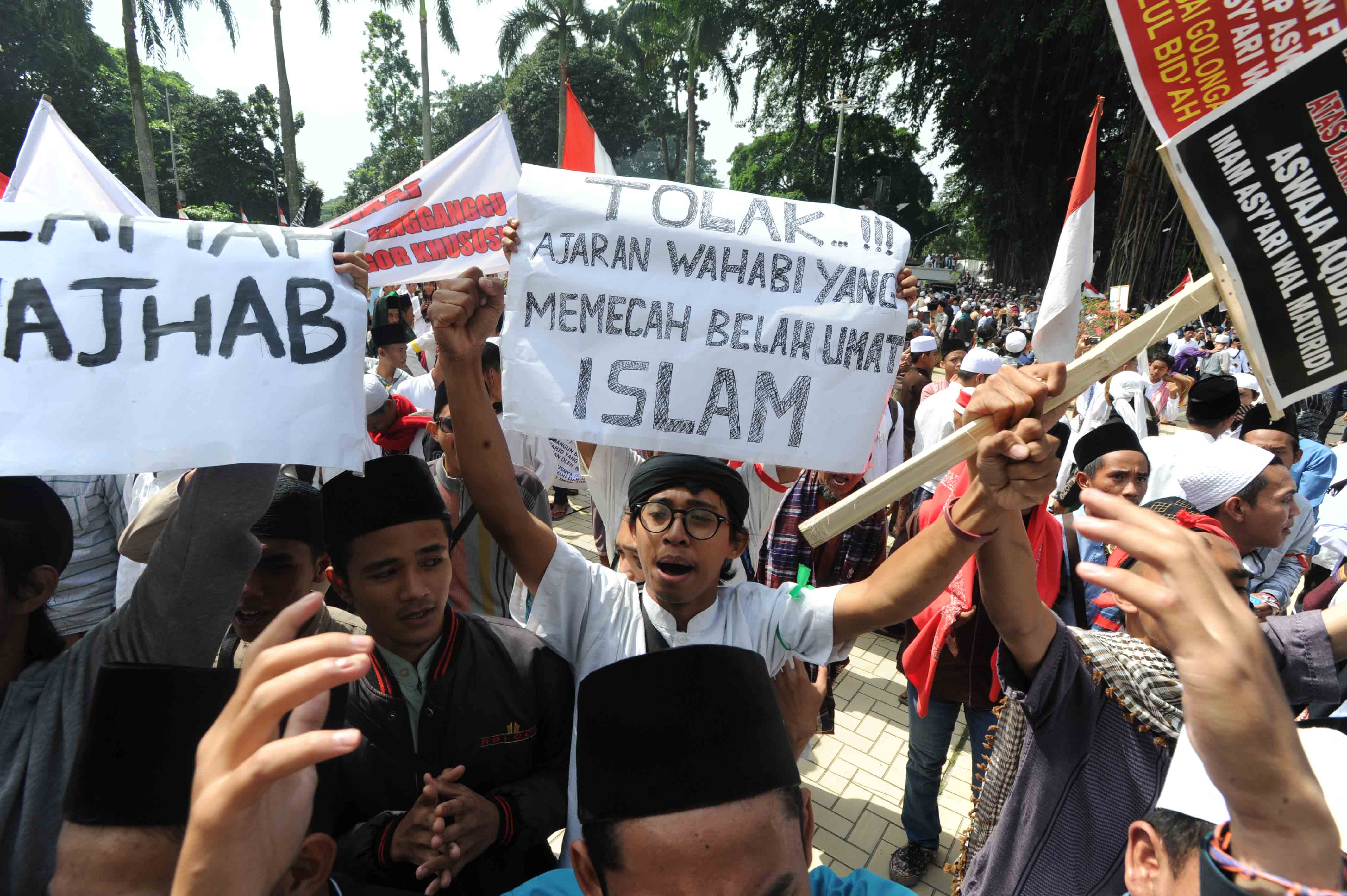 Mereka berorasi sambil membentangkan poster dan spanduk tentang penolakan ajaran Wahabi yang mereka anggap dapat memecah bela umat Islam. AKTUAL/HO