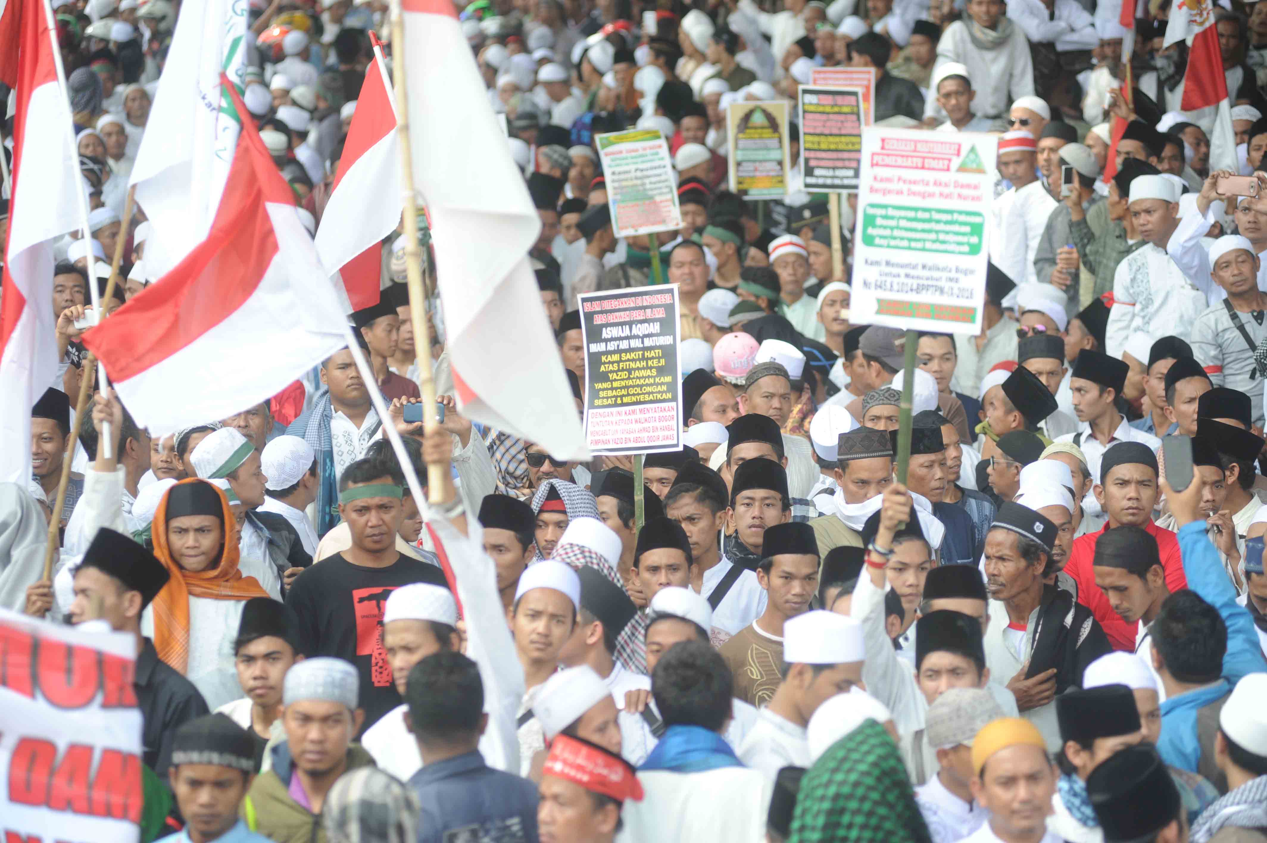 Ribuan umat Islam yang tergabung dalam Gerajan Masyarakat Pemersatu Umat saat menggelar aksi unjuk rasa di halaman Balaikota, Bogor, Jawa Barat, Selasa (29/8). Dalam aksinya, mereka menuntut Walikota Bogor Bima Arya untuk mencabut IMB pembangunan Masjid Imam Ahmad bin Hanbal di Jalan Ahmad Syam, Kelurahan Tanahbaru, Kecamatan Bogor Utara. AKTUAL/HO
