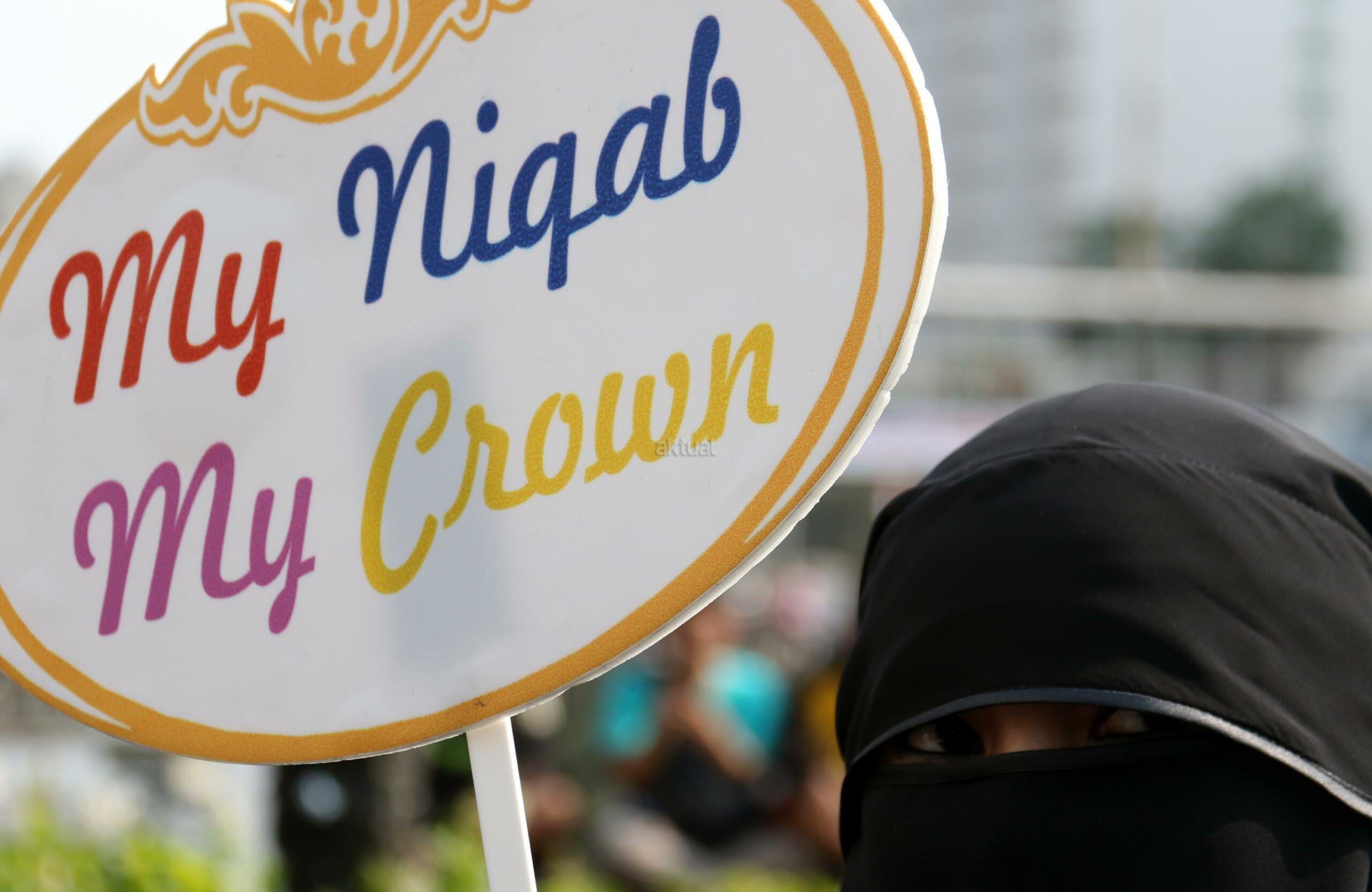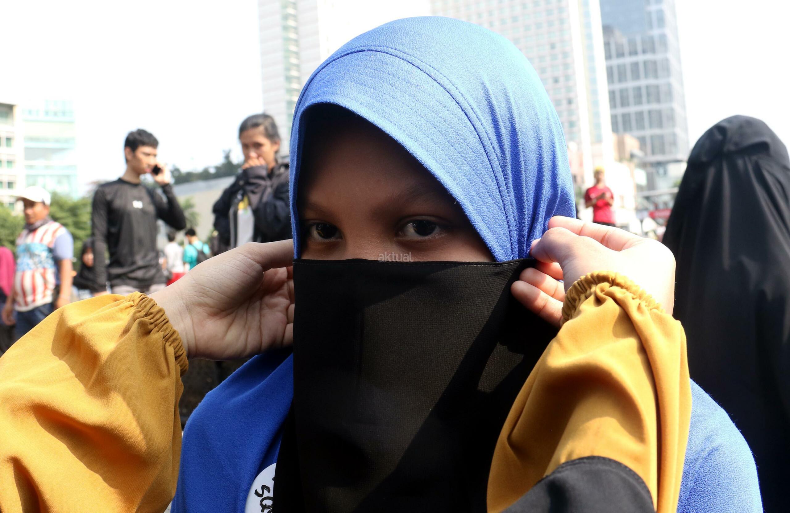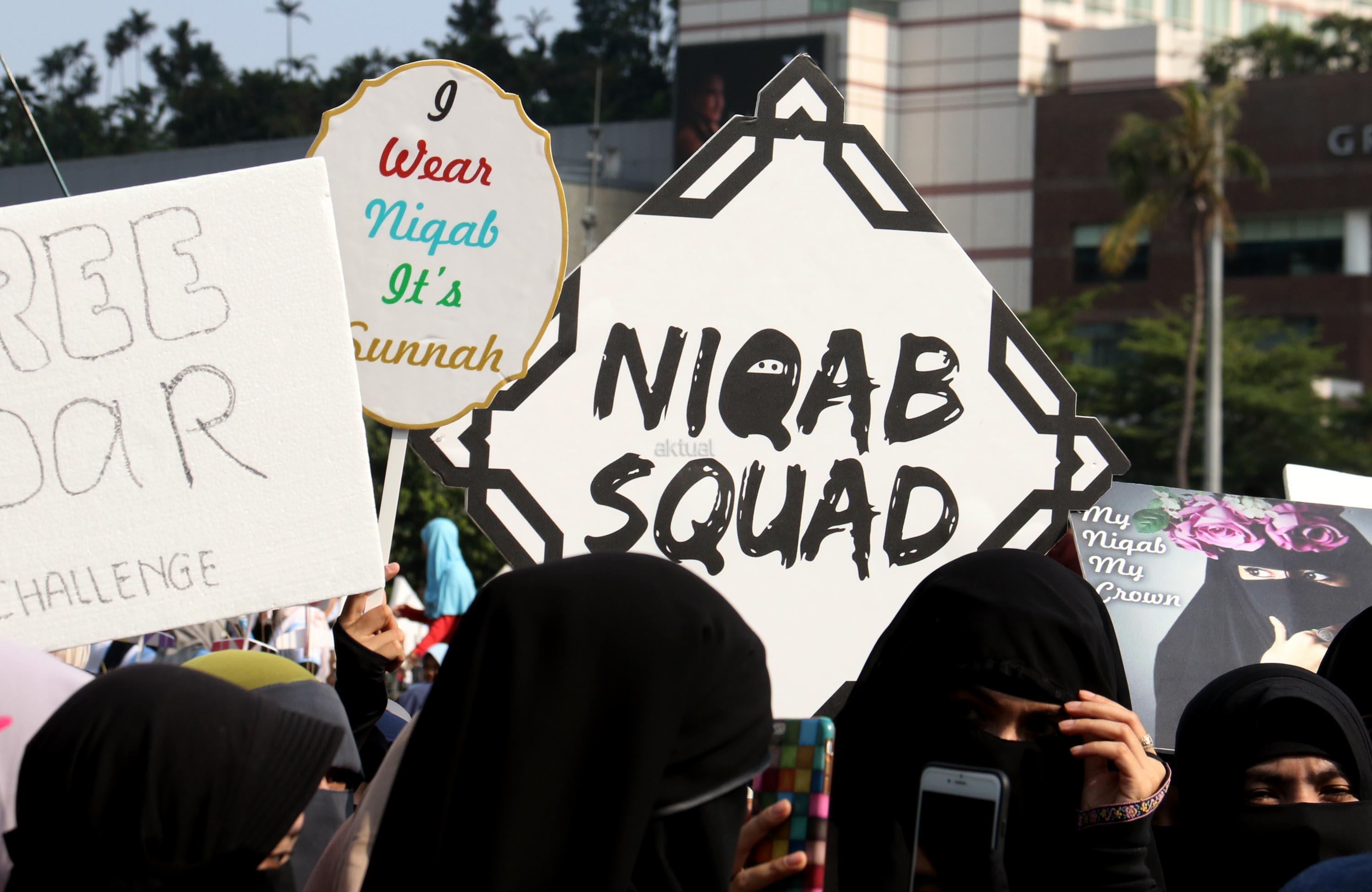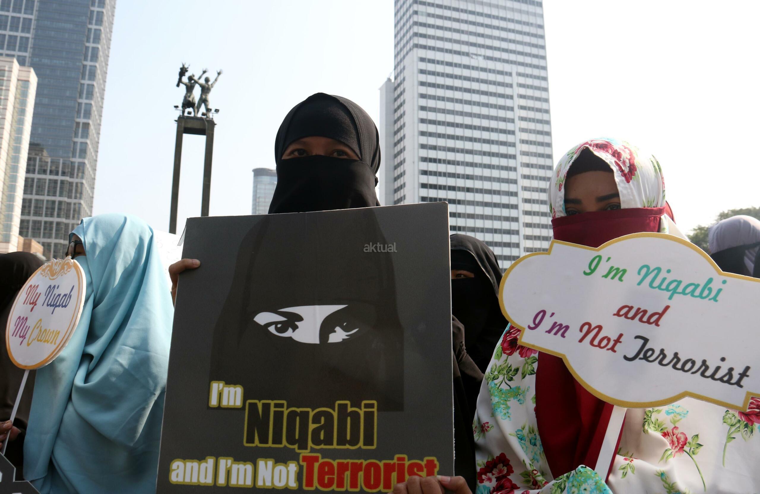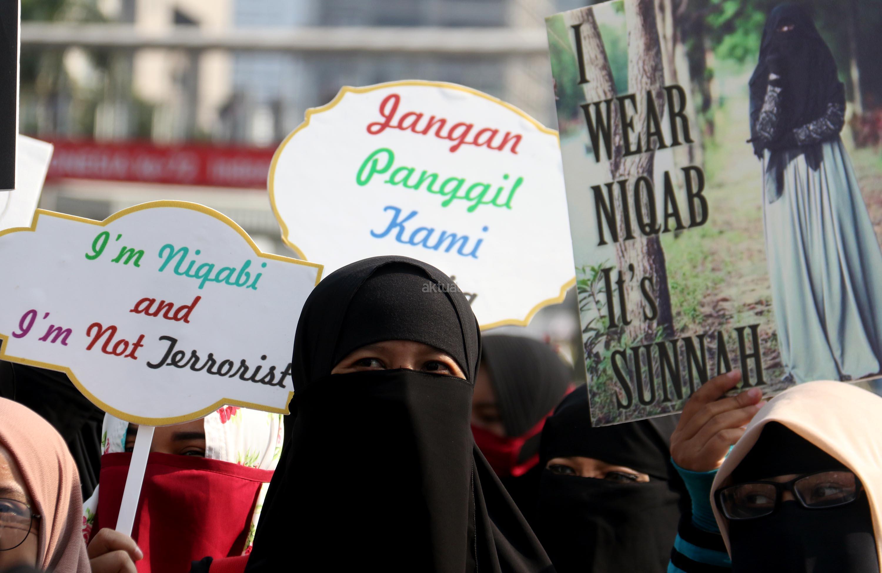 Sejumlah perempuan memakai Niqab (penutup kepala muslimah yg dilengkapi dgn cadar) saat menggelar aksi dikawasan Bundaran Hotel Indonesia, Jakarta, Minggu (10/9/2017). Mereka menolak segala bentuk diskriminasi terhadap wanita yang memakai niqab. AKTUAL/Munzir
