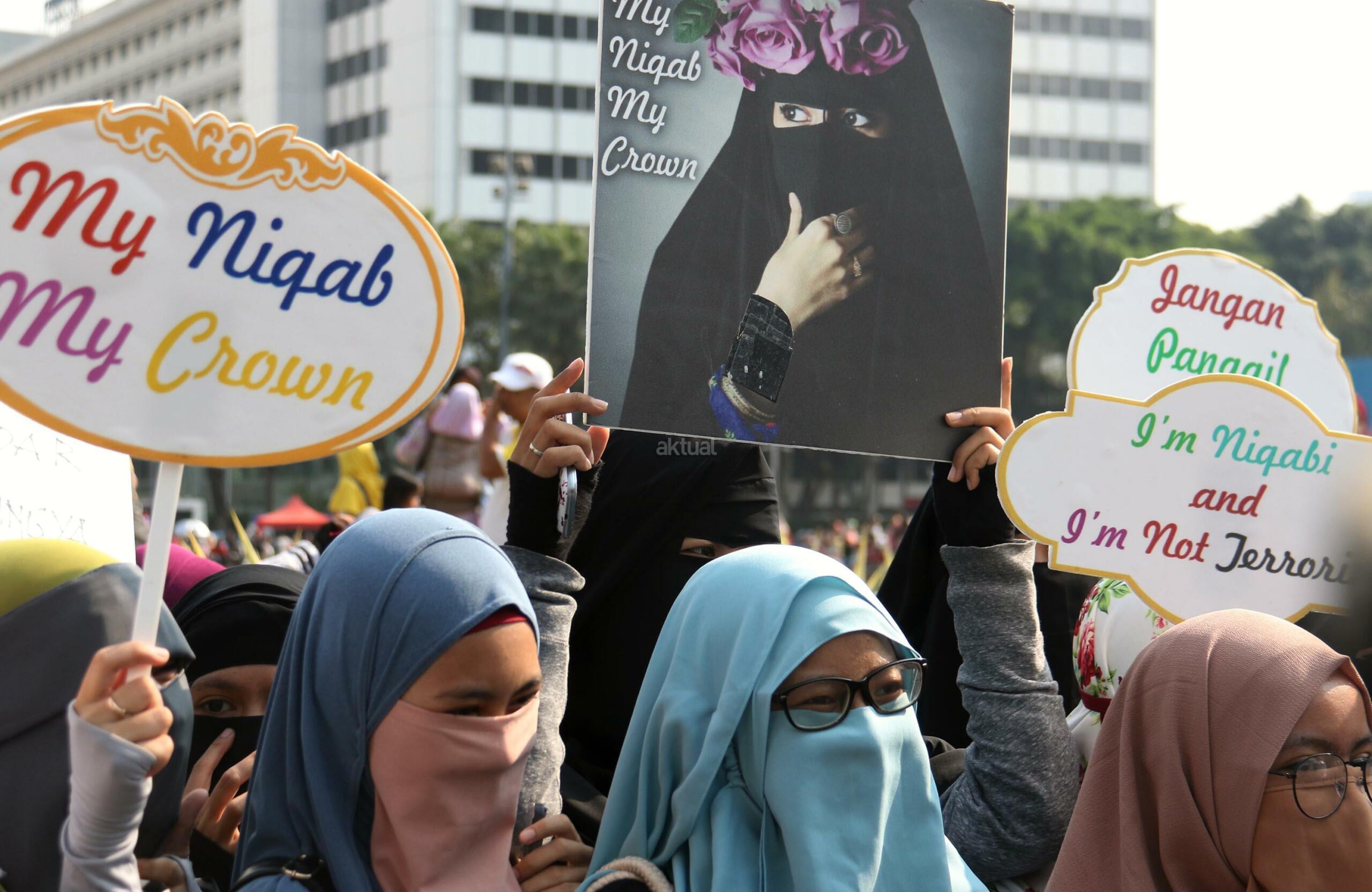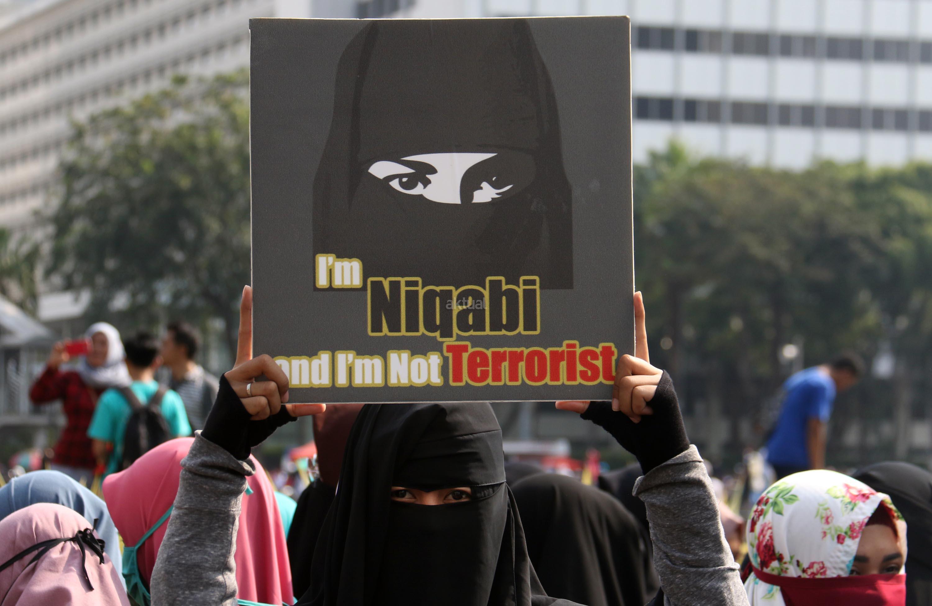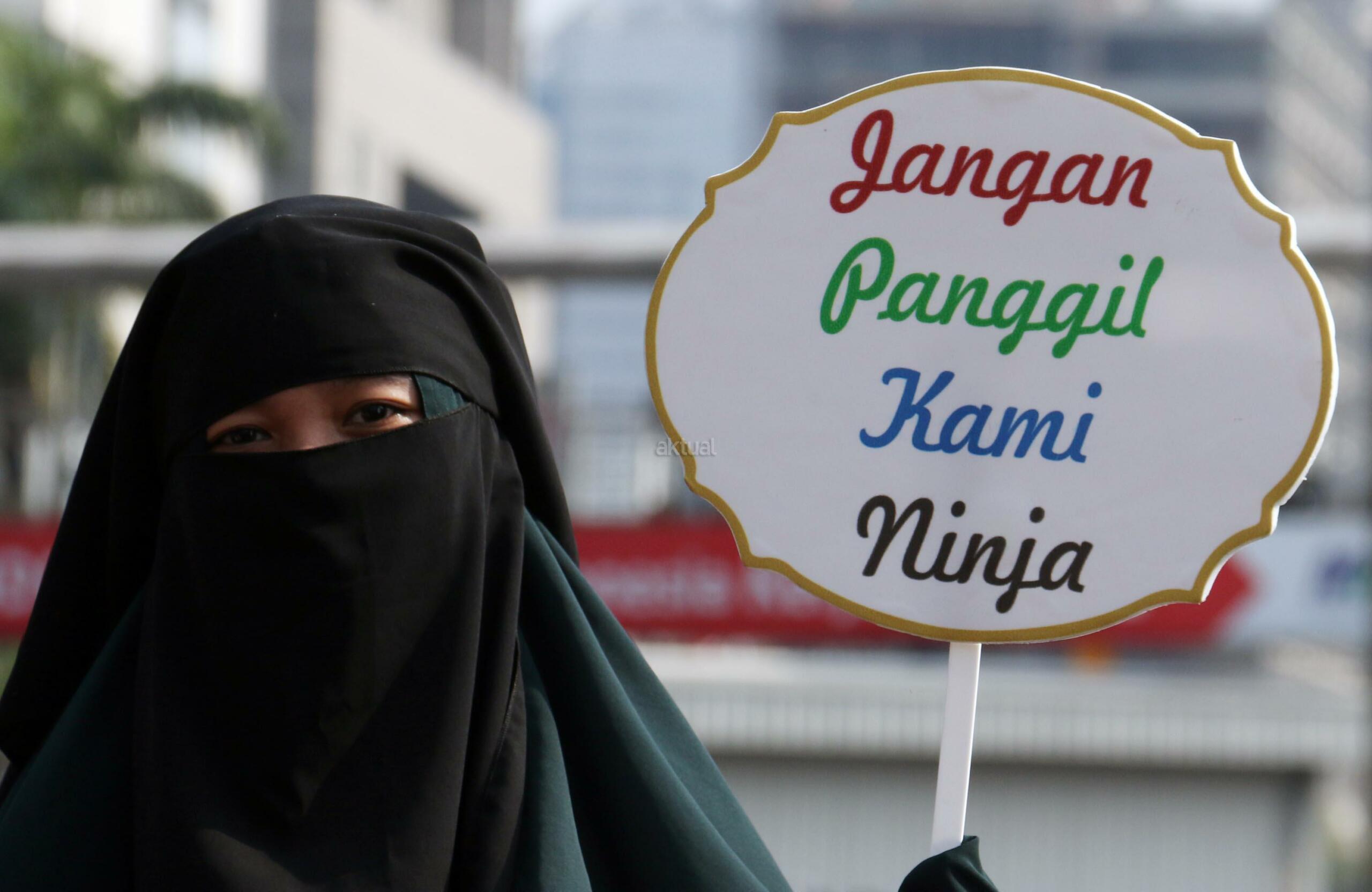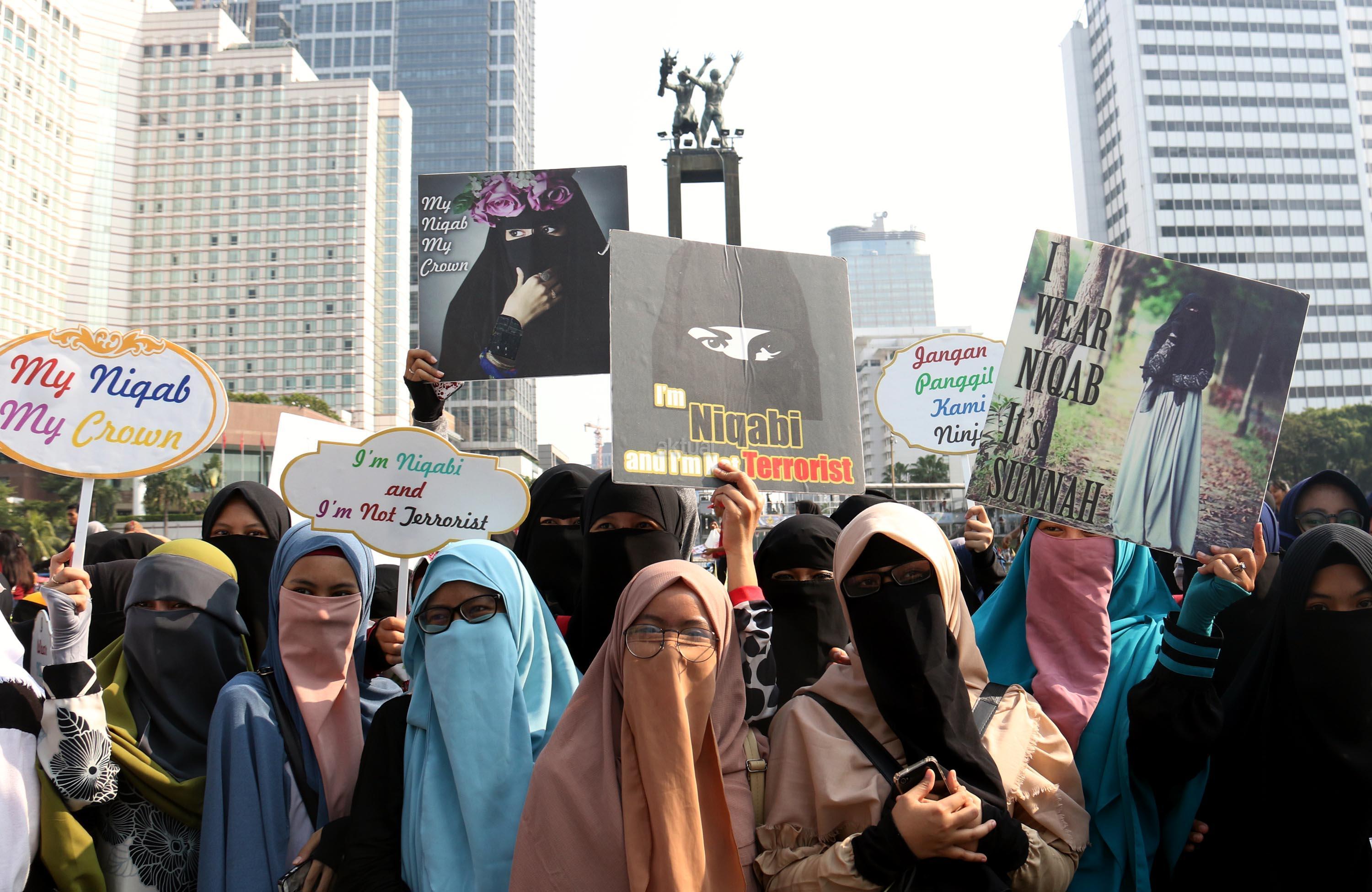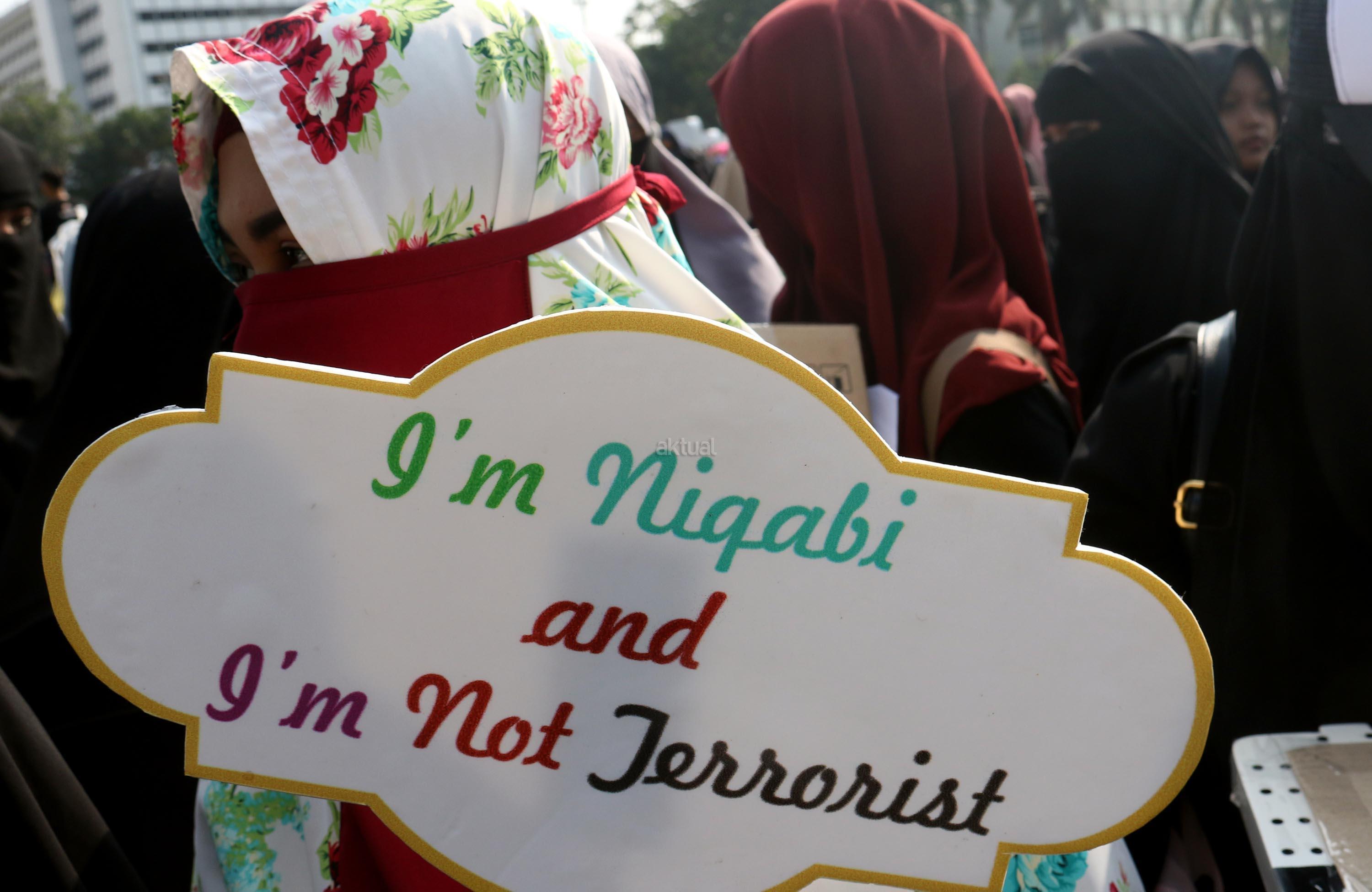 Sejumlah perempuan memakai Niqab (penutup kepala muslimah yg dilengkapi dgn cadar) saat menggelar aksi dikawasan Bundaran Hotel Indonesia, Jakarta, Minggu (10/9/2017). Mereka menolak segala bentuk diskriminasi terhadap wanita yang memakai niqab. AKTUAL/Munzir