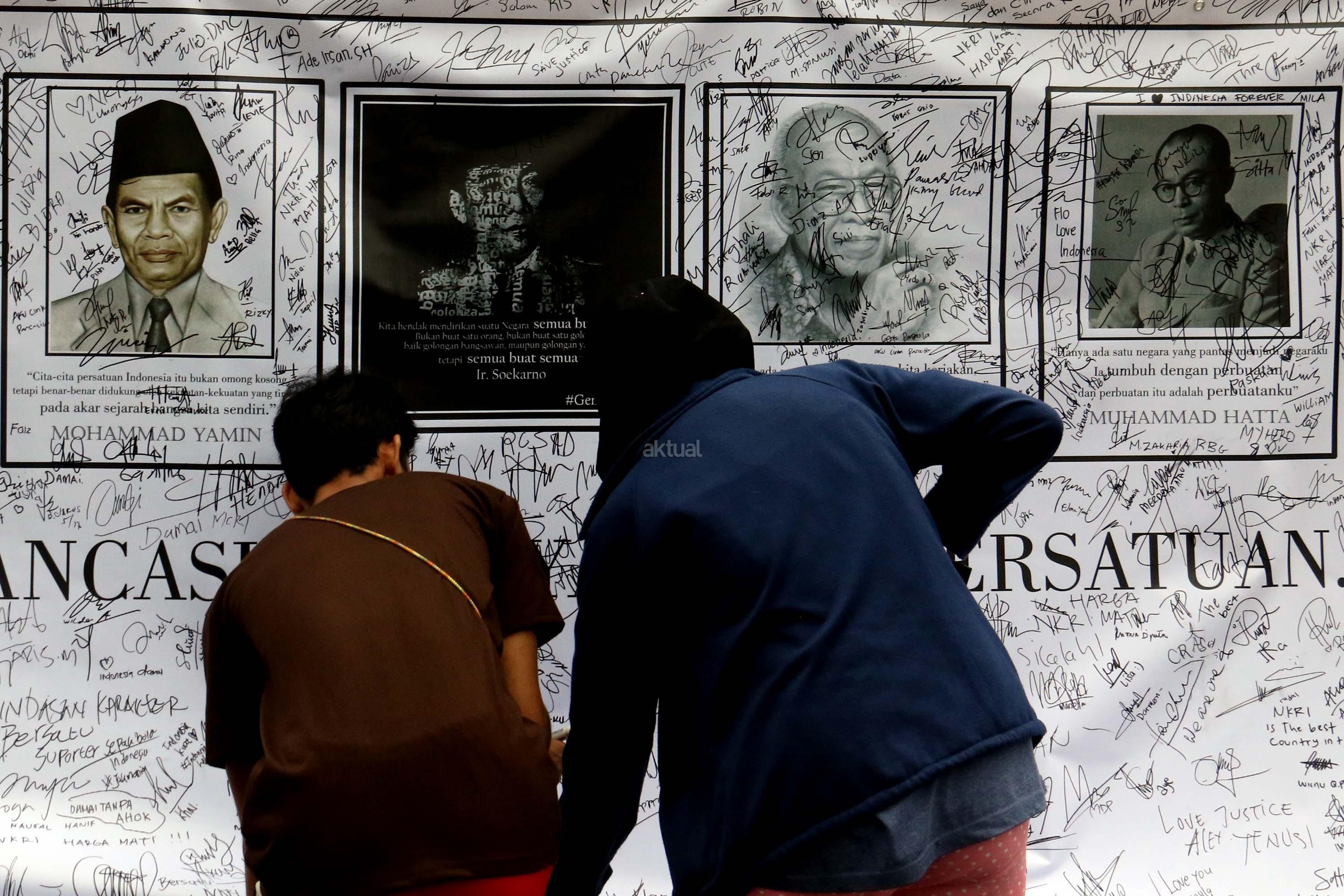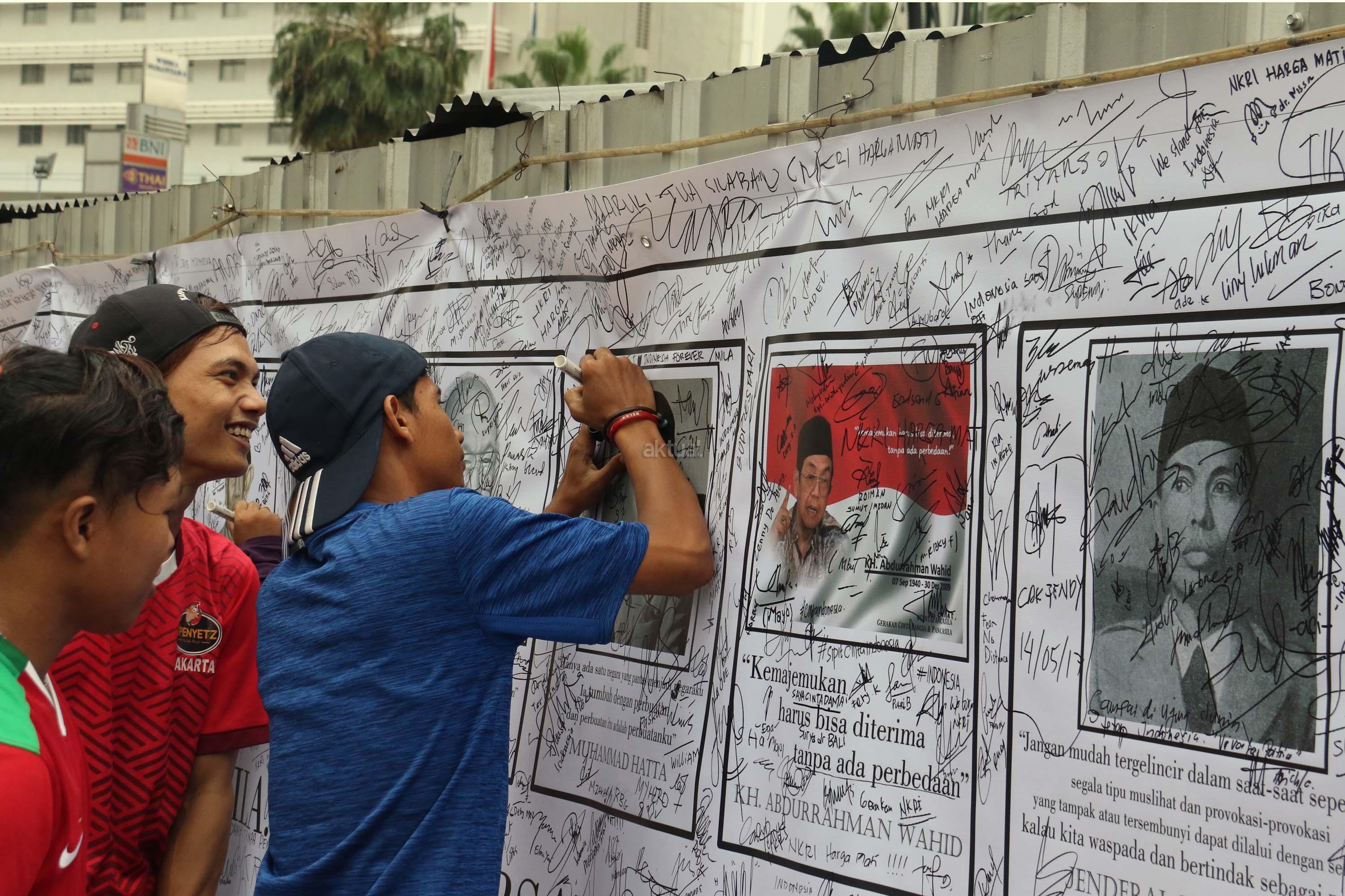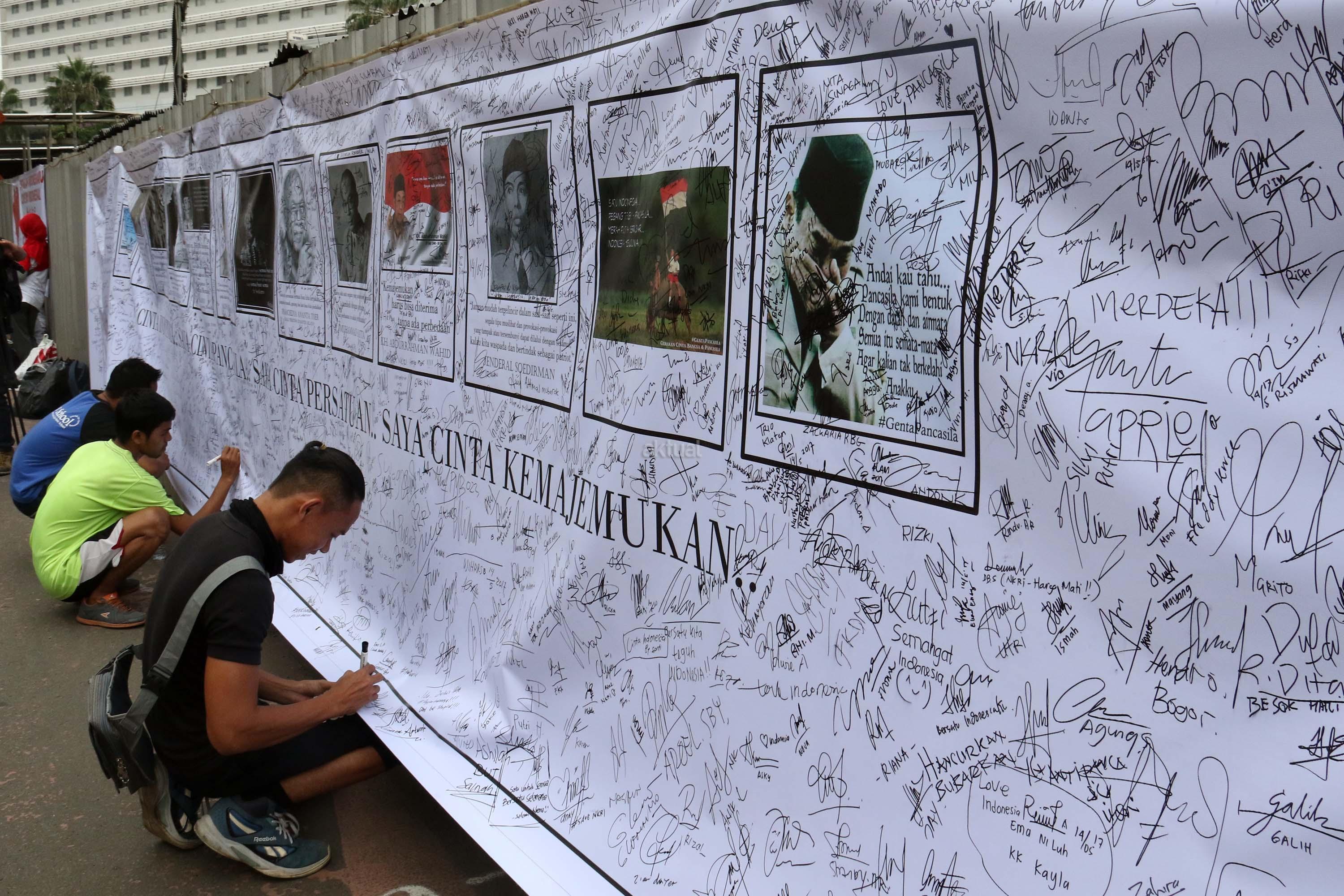 Sejumlah warga membubuhkan tanda tangan di spanduk bergambar tokoh nasional di area car free day, Jakarta, Minggu (14/5/2017). Kegiatan itu sebagai bentuk simpati terhadap kondisi nasional yang ramai akan isu perpecahan dan perbedaaan. AKTUAL/Munzir