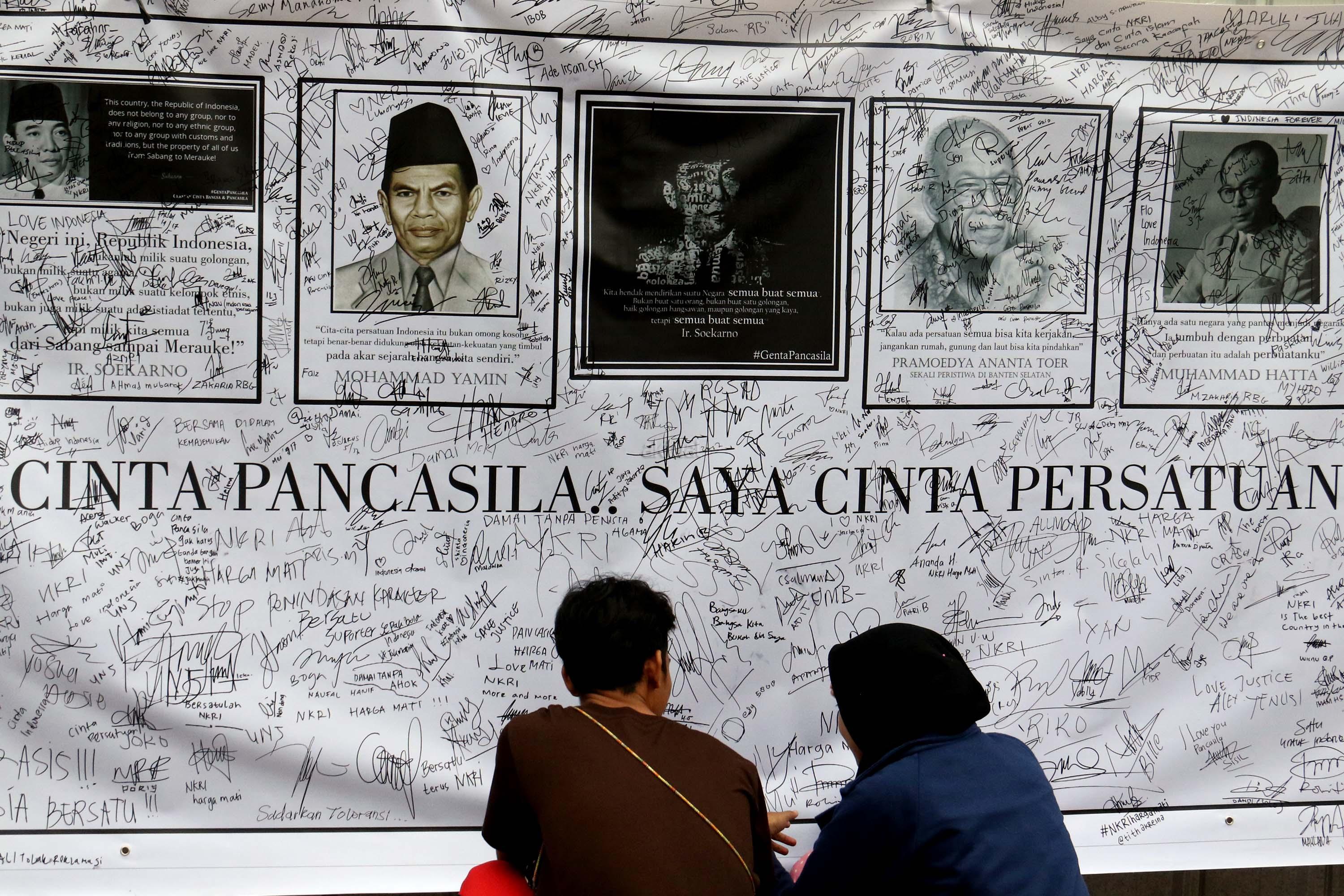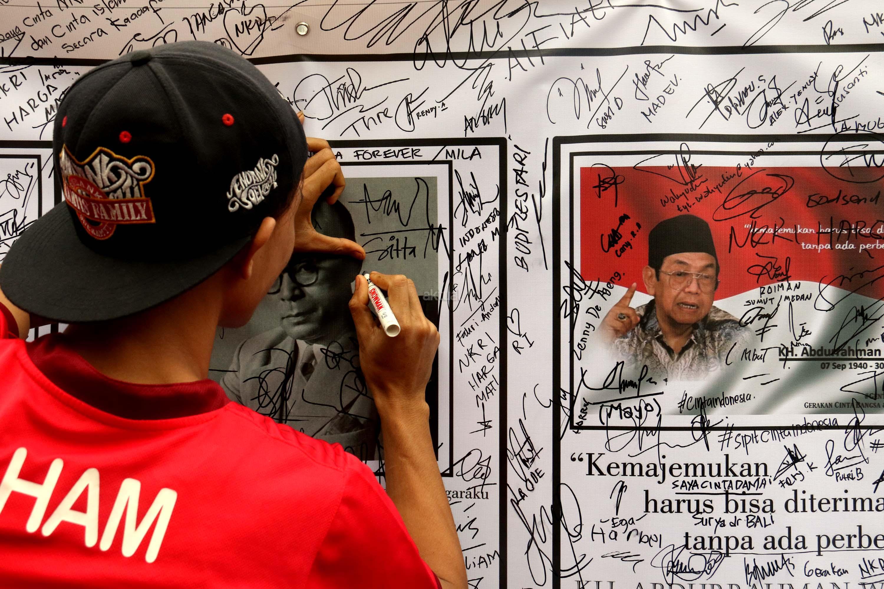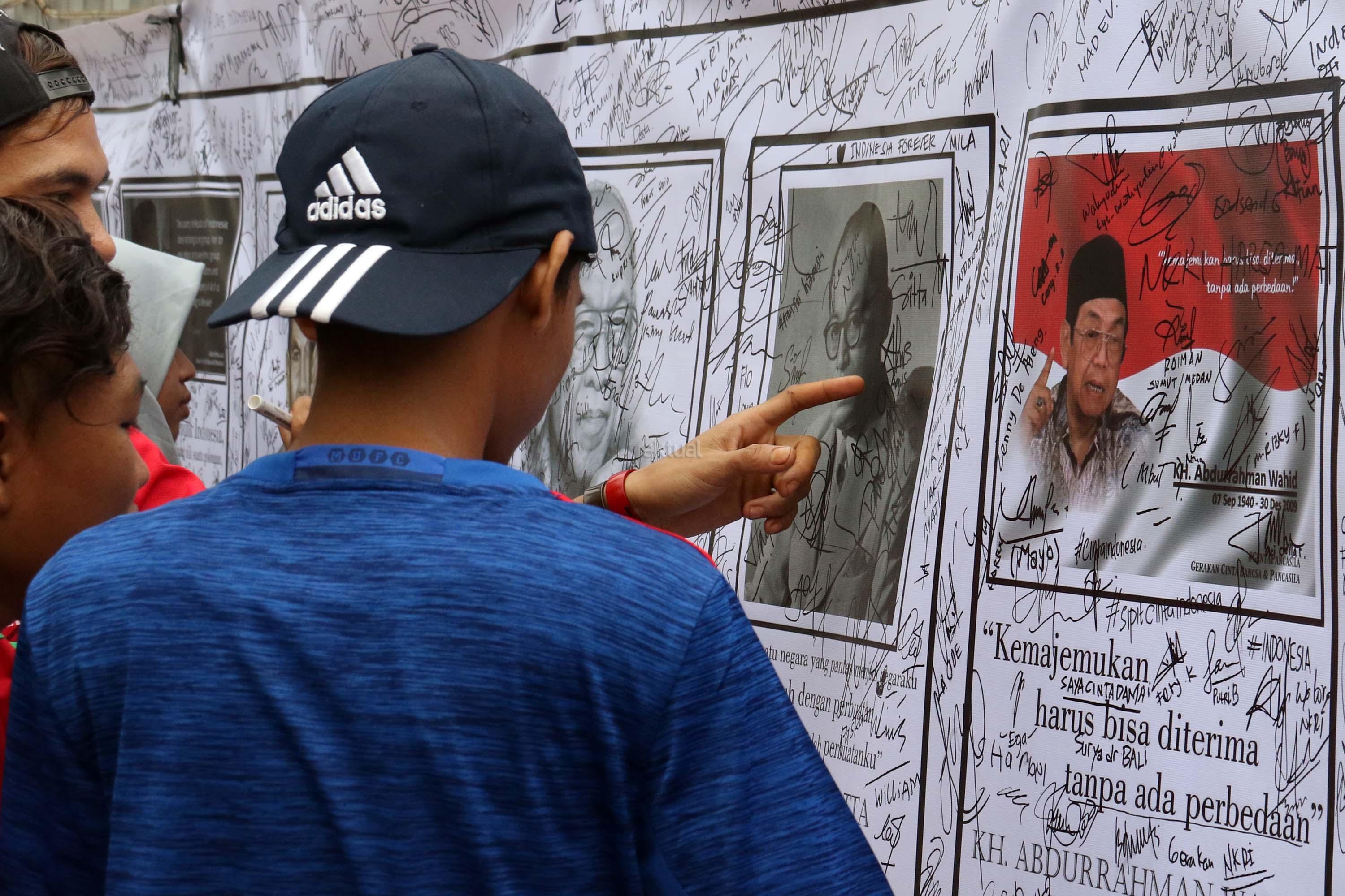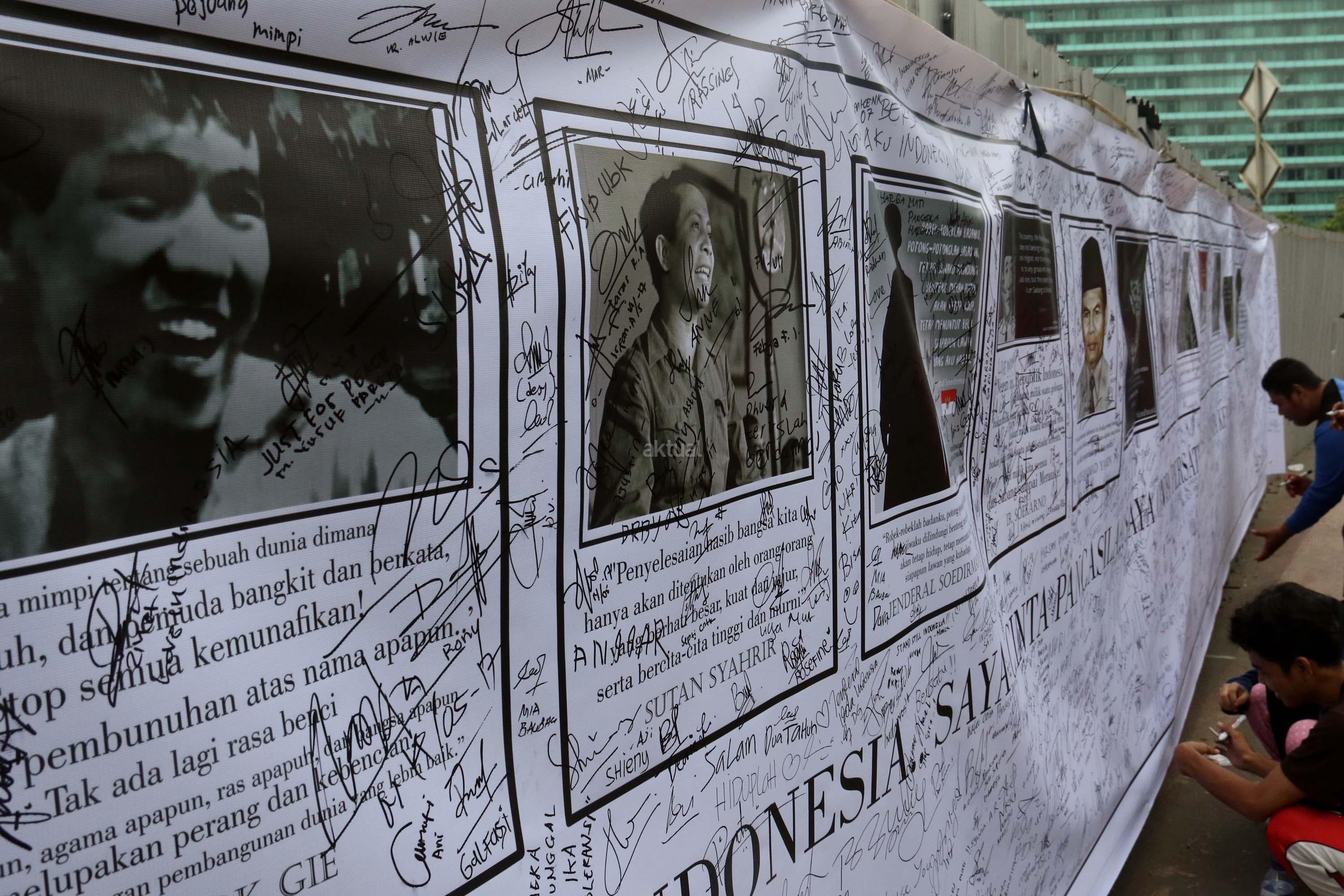 Sejumlah warga membubuhkan tanda tangan di spanduk bergambar tokoh nasional di area car free day, Jakarta, Minggu (14/5/2017). Kegiatan itu sebagai bentuk simpati terhadap kondisi nasional yang ramai akan isu perpecahan dan perbedaaan. AKTUAL/Munzir