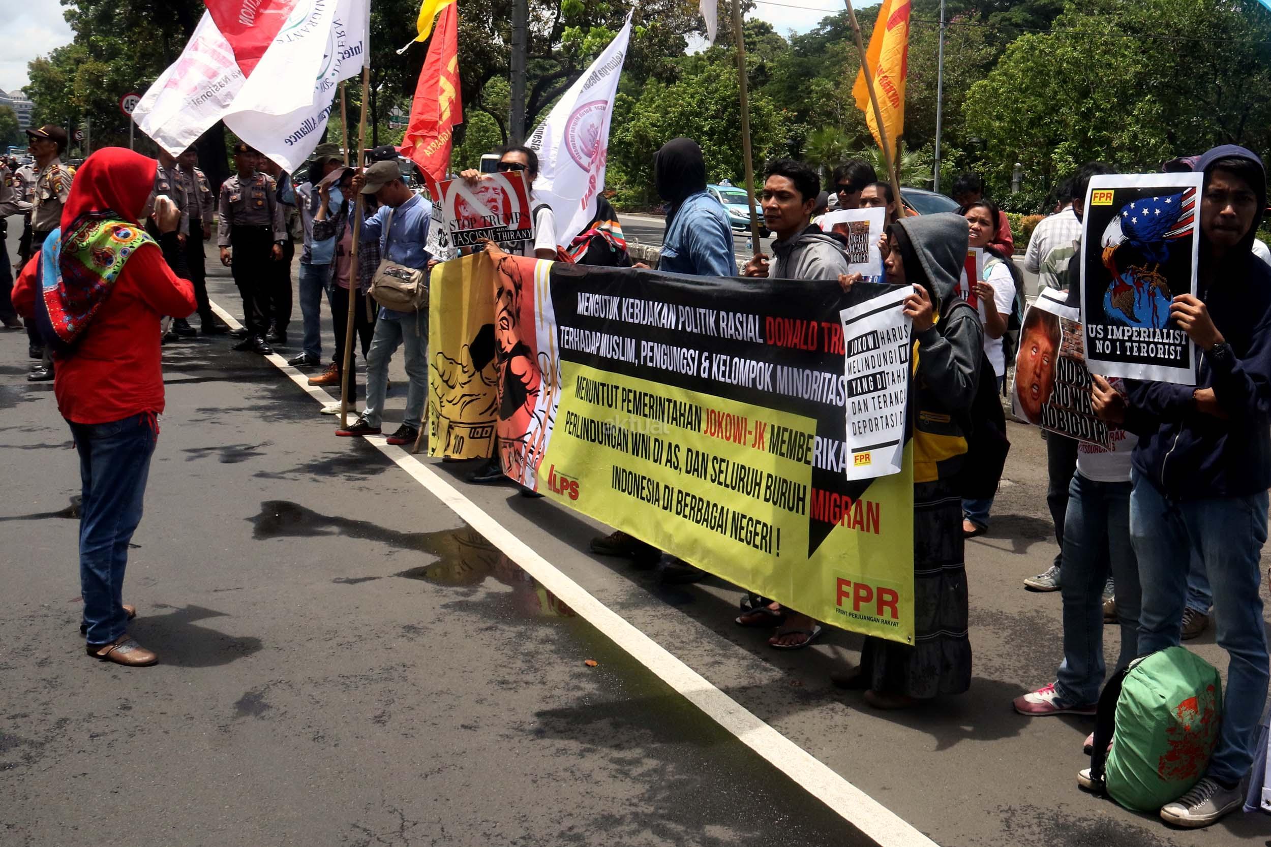 Sejumlah aktivis dari berbagai elemen yang tergabung Front Perjuangan Rakyat (FPR) menggelar aksi di depan kedutaan Amerika Serikat, di Jakarta, Senin (6/2/2017). Mereka mengutuk kebijakan Presiden Amerika Donald Trump dan mendesak agar mencabut kebijakan warga 7 negara muslim yang dilarang masuk ke Amerika. AKTUAL/Munzir