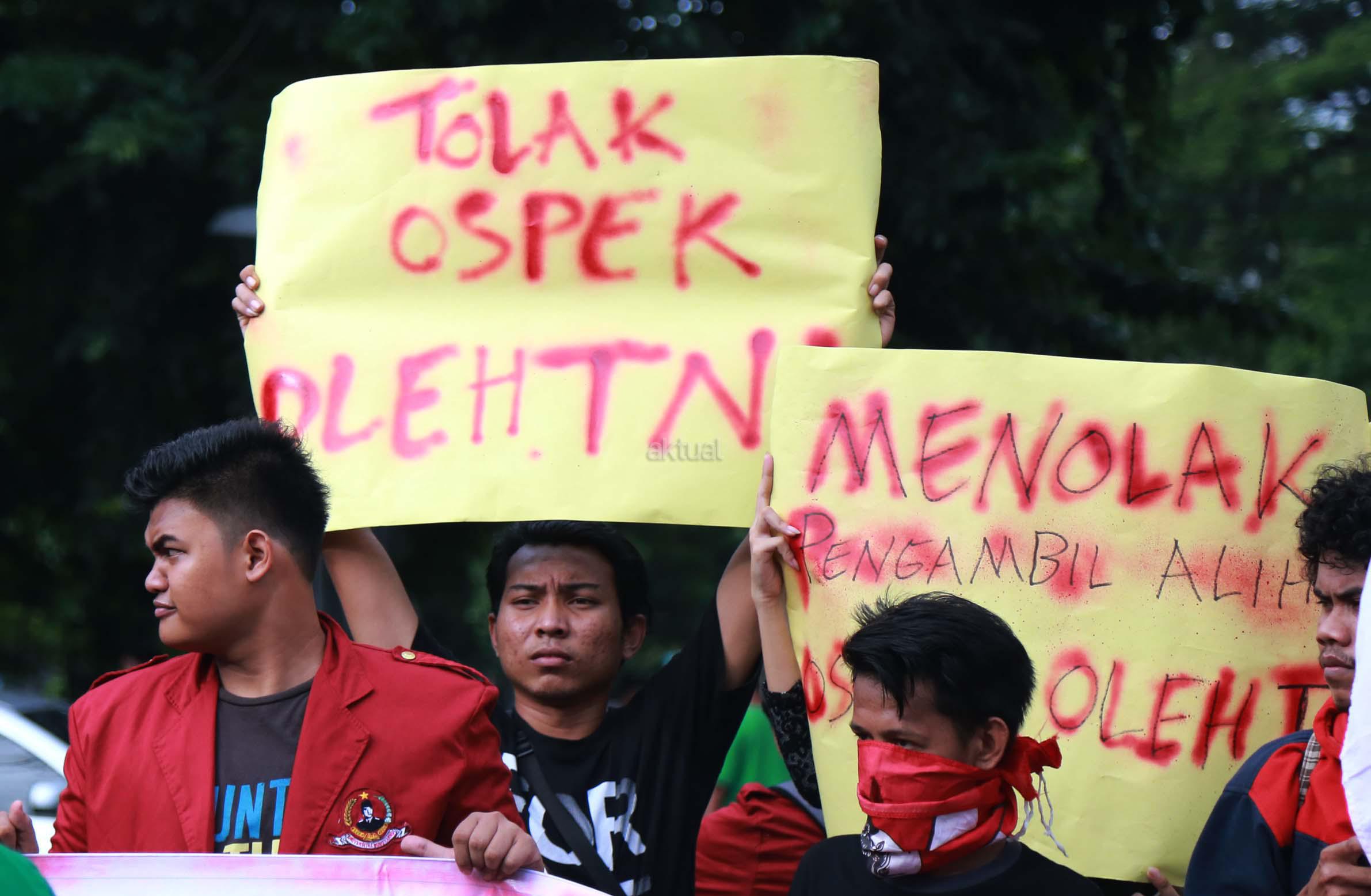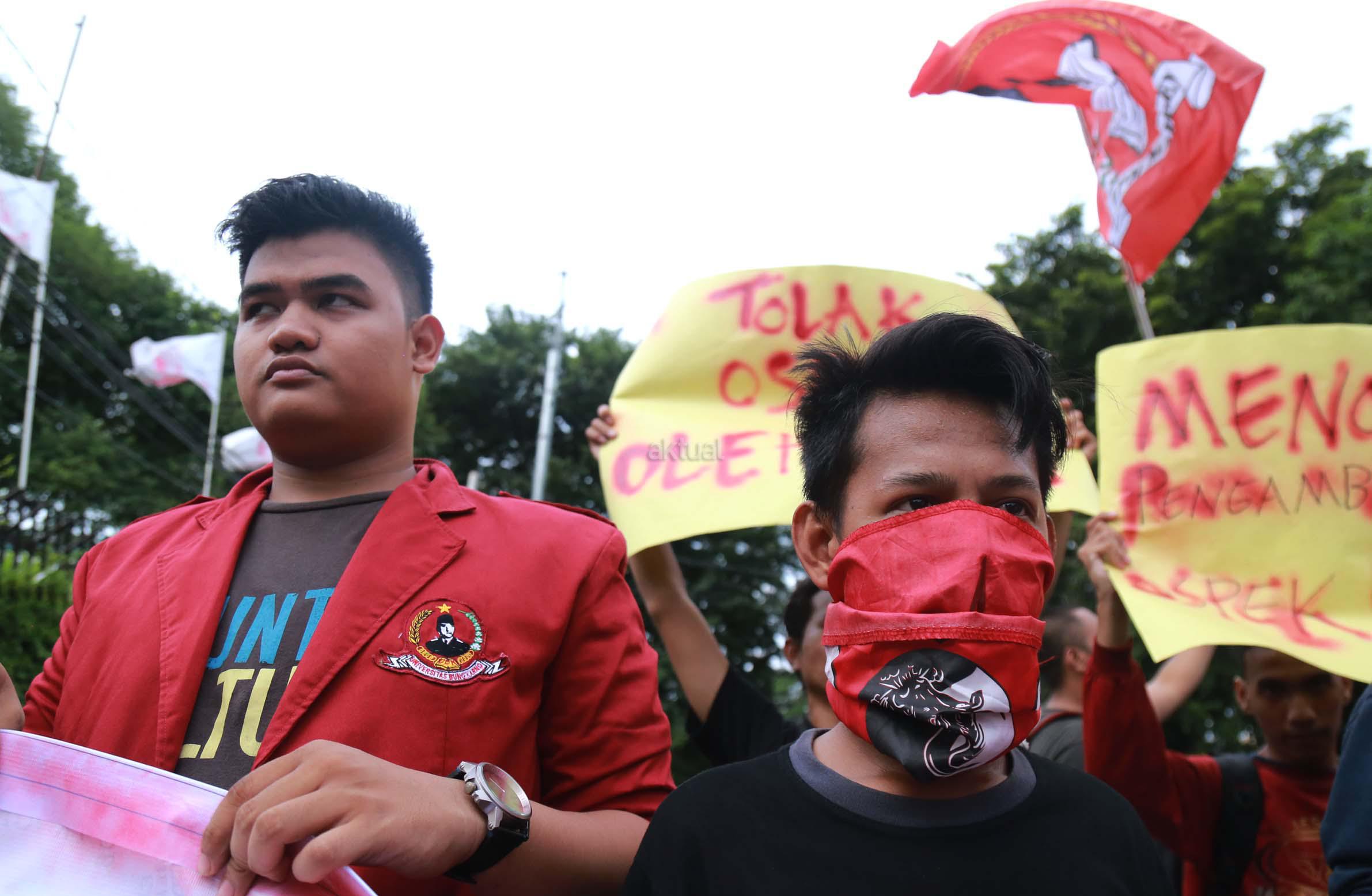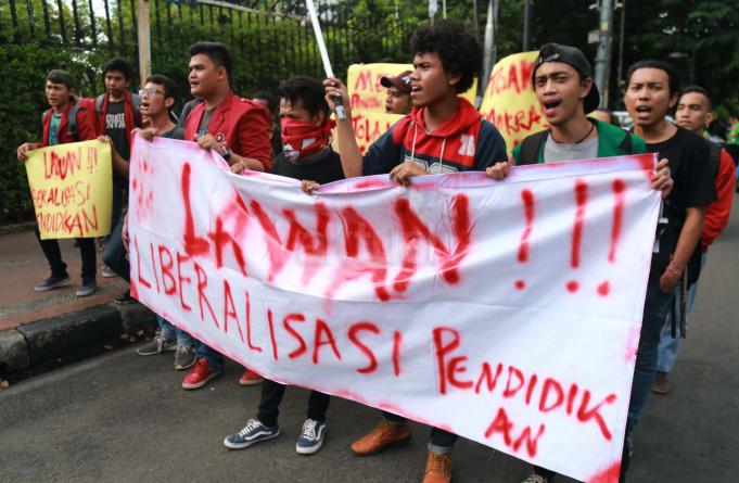 Aliansi Mahasiswa yang tergabung dalam Jaringan Kerja Nasional (Jakernas) menggelar aksi unjuk rasa di depan kampus Universitas Bung Karno (UBK), Jakarta, Senin (2/5/2016). Dalam aksi yang bertepatan dengan Hari Pendidikan Nasional tersebut, mereka menuntut untuk melawan Liberalisasi Pendidikan, Wujudkan Pendidikan murah dan berkualitas, Tegakkan Demokrasi di dalam Kampus, serta menolak keterlibatan TNI dalam Orientas Studi dan Pengenalan Kampus (OSPEK) yang berkedok bela negara.