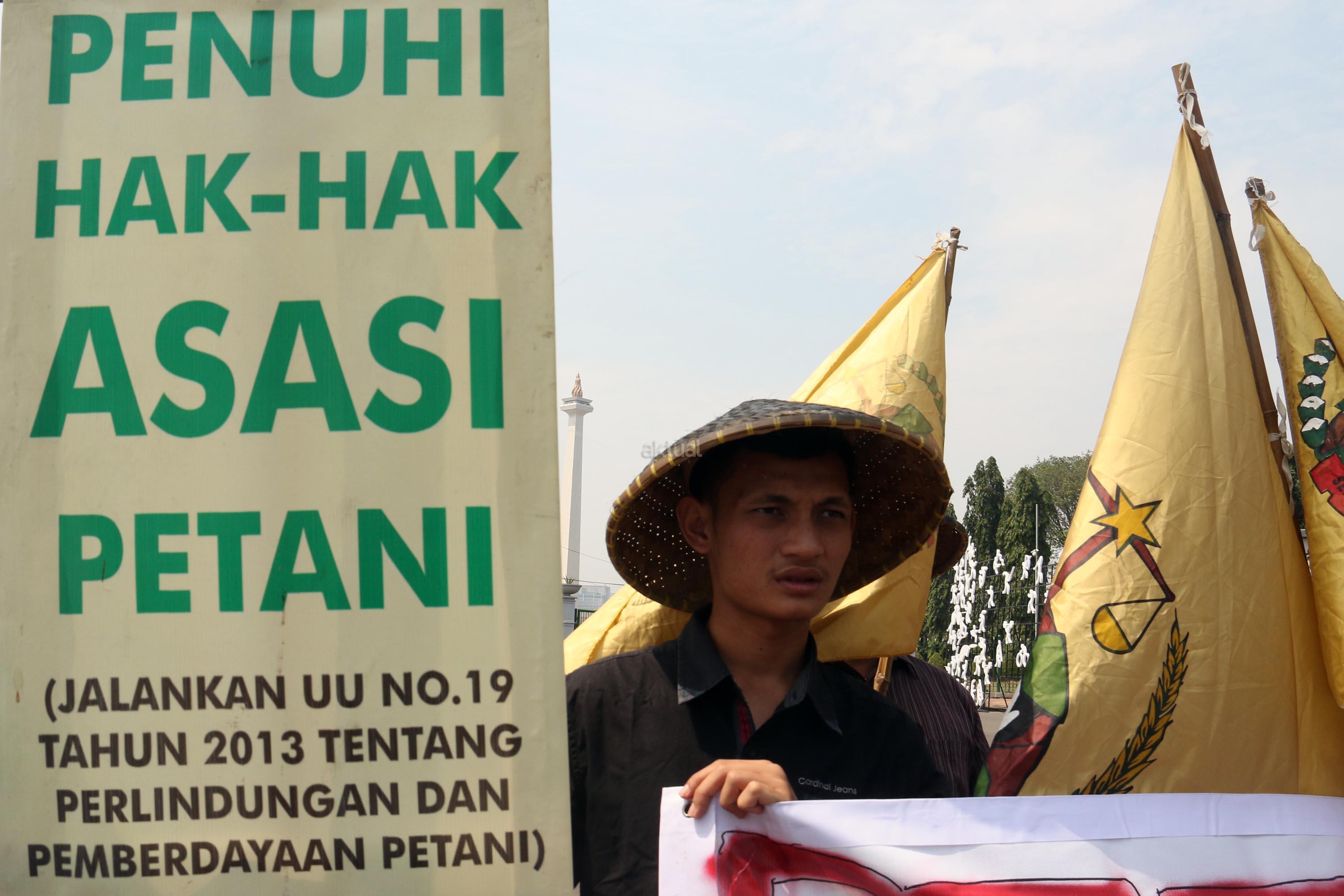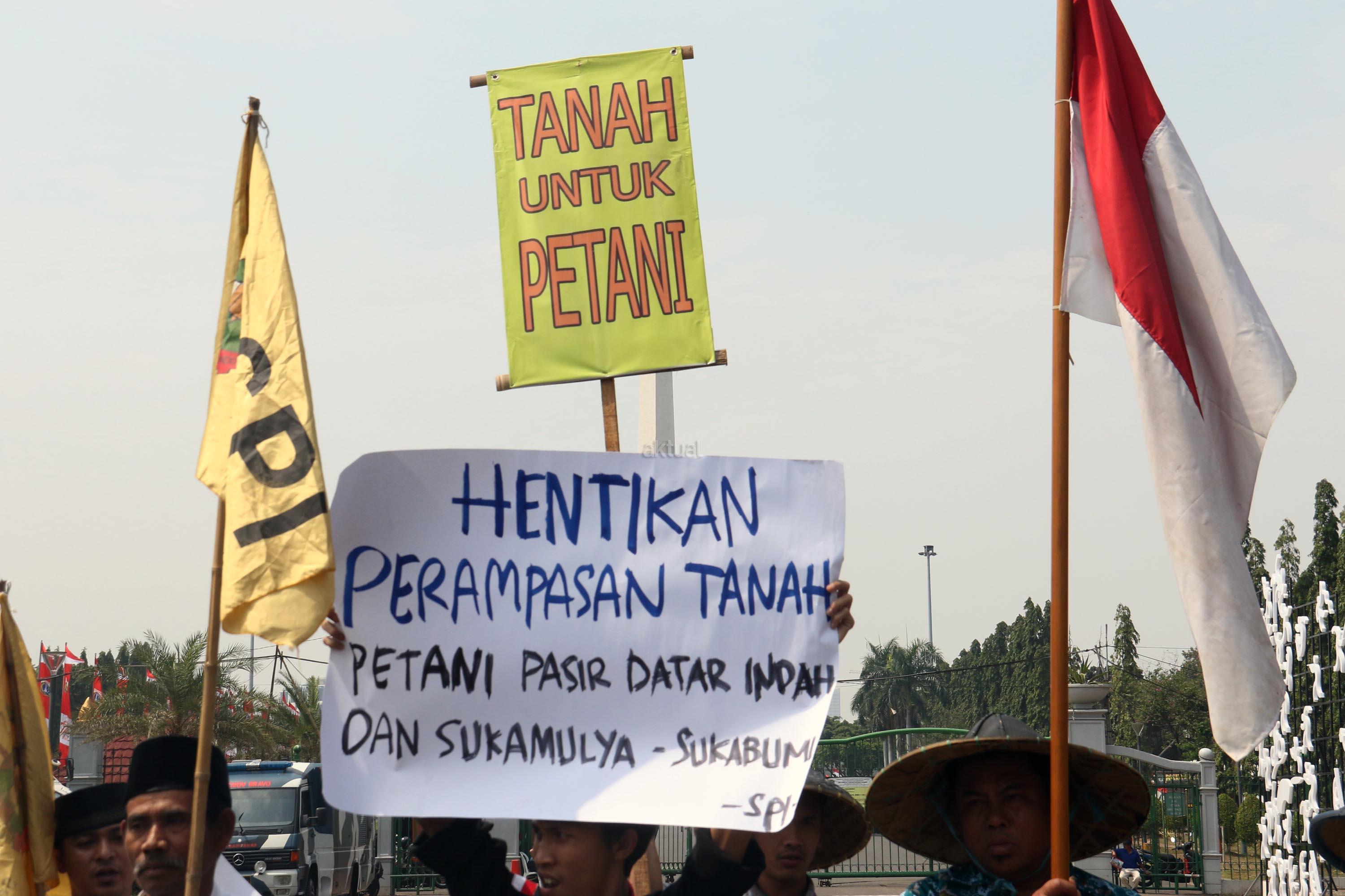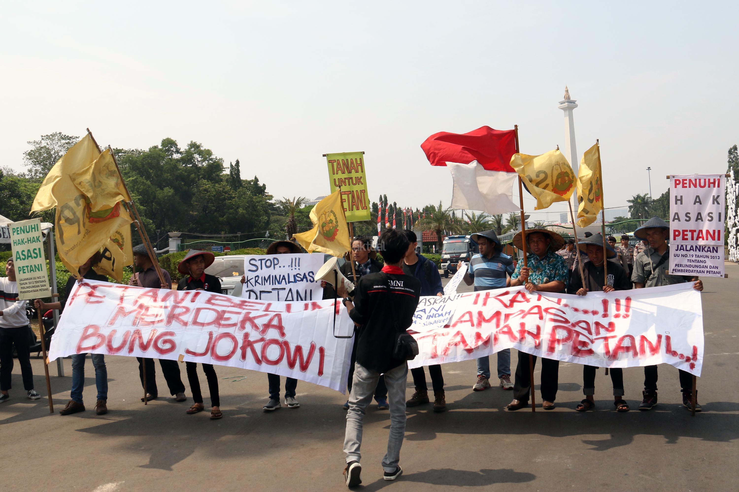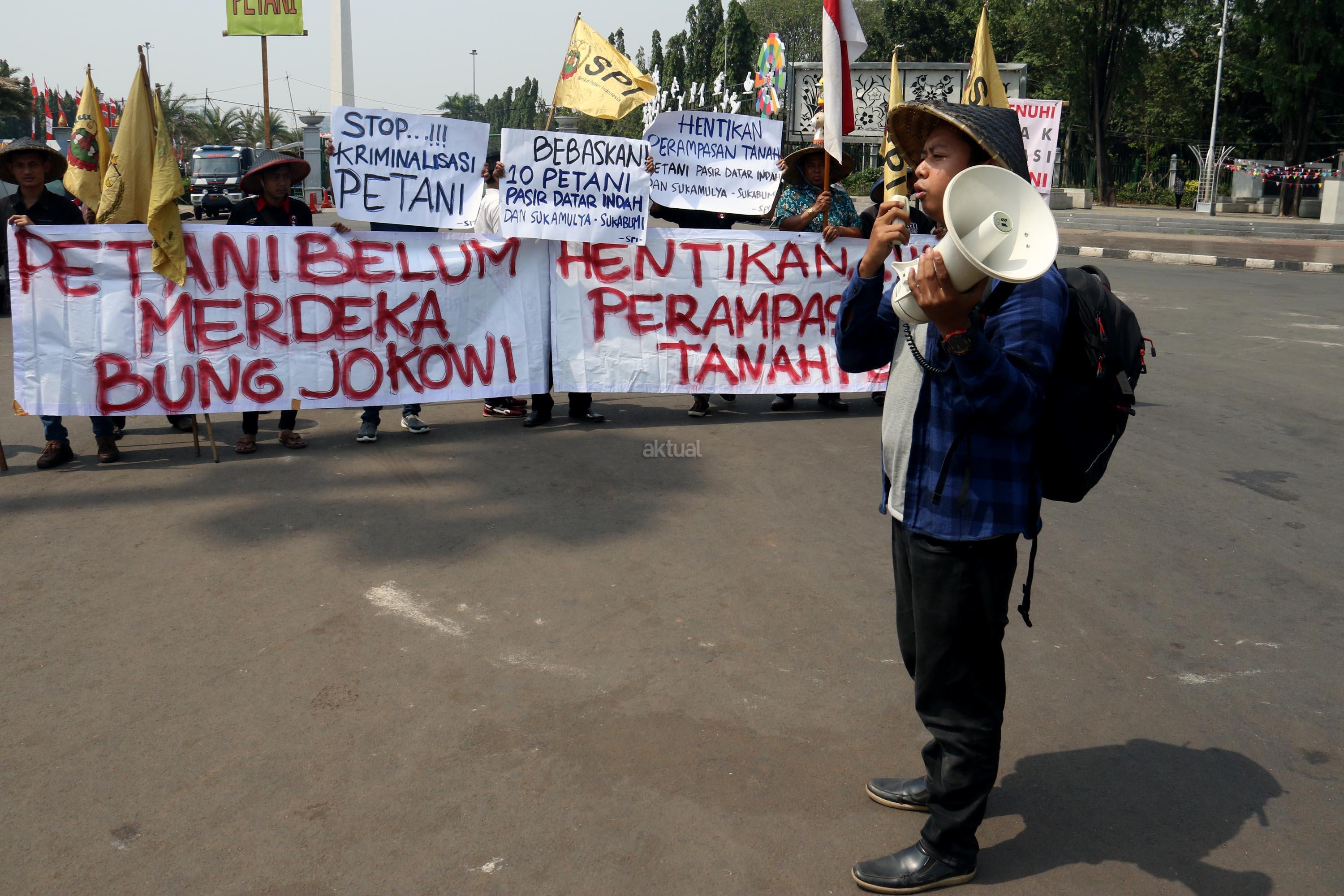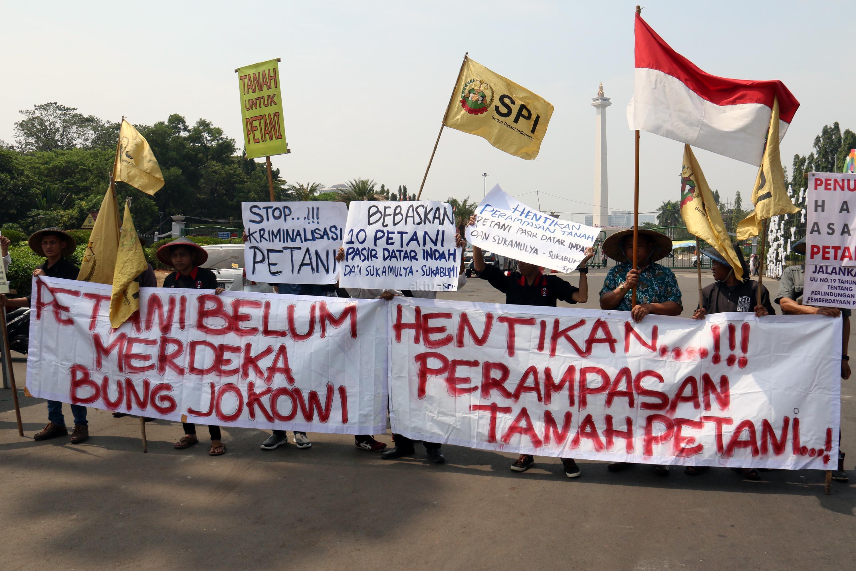 Sejumlah petani Sukabumi yang tergabung dalam Serikat Petani Indonesia (SPI) melakukan aksi unjuk rasa di depan Istana Merdeka, Jumat (18/8/2017). Dalam aksinya para petani mendesak kepada Pemerintaha Jokowi/JK untuk menghentikan kriminalisasi dan perampasan tanah petani yang dilakukan oleh PT. Surya Nusa Nadicipta (PT.SNN). AKTUAL/Munzir