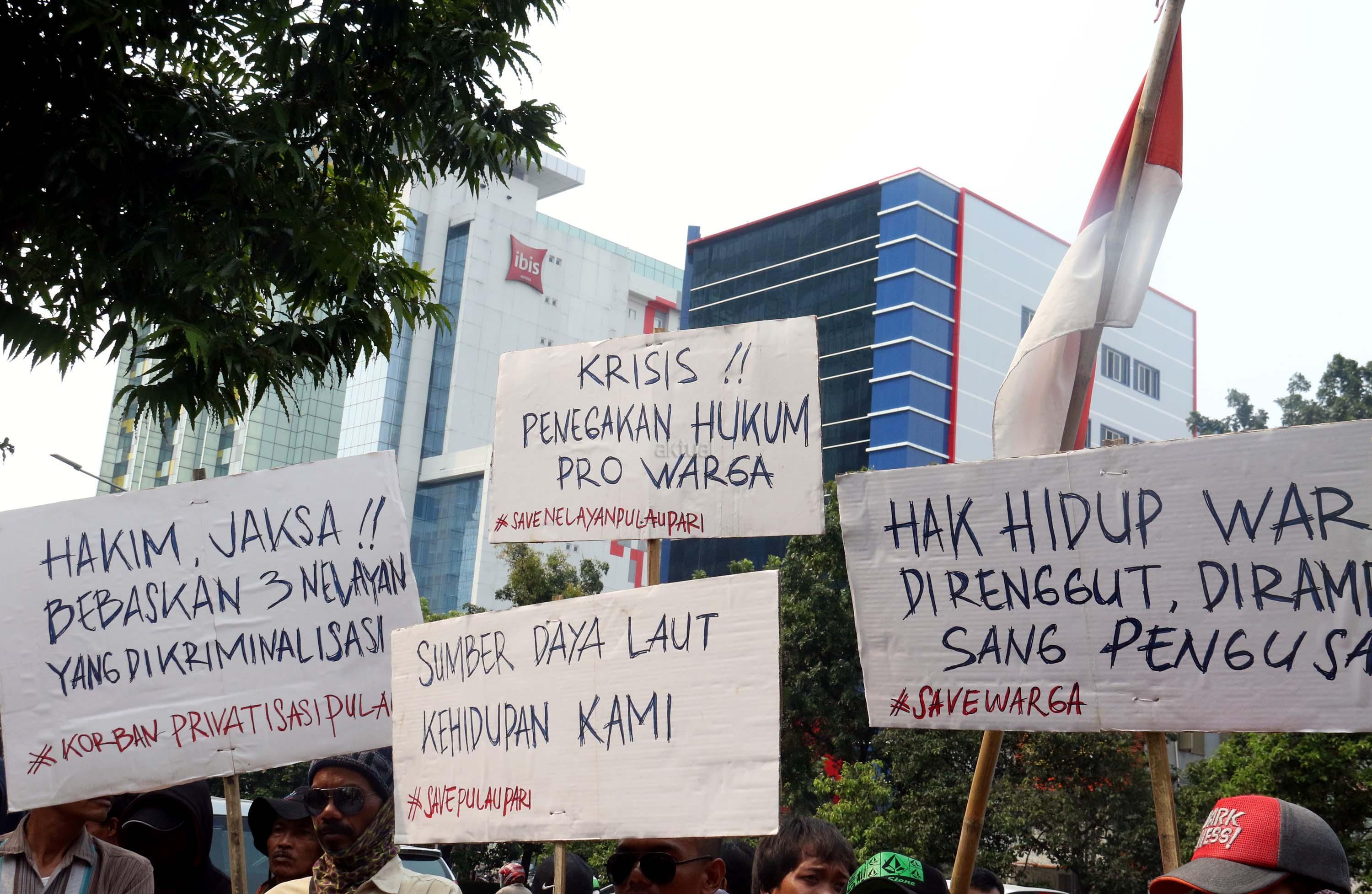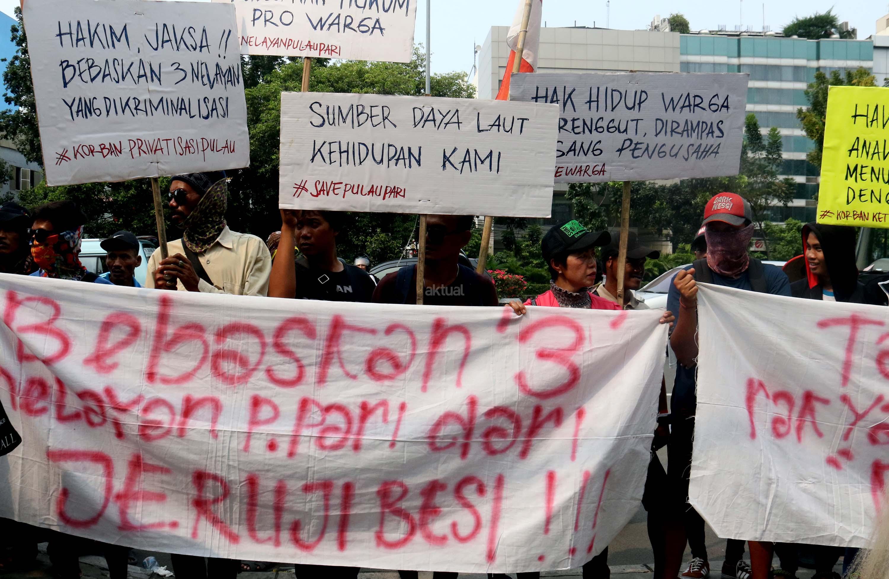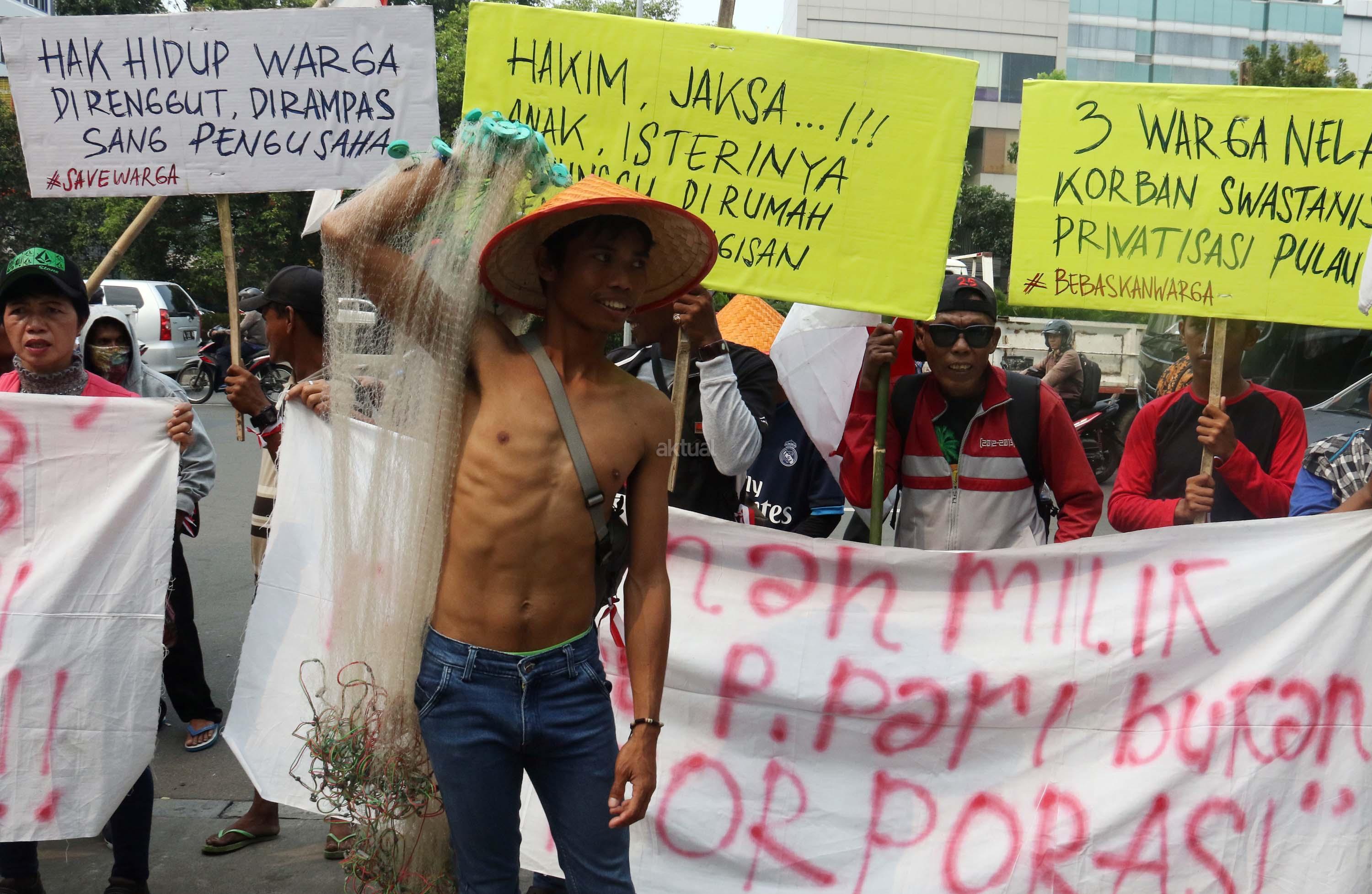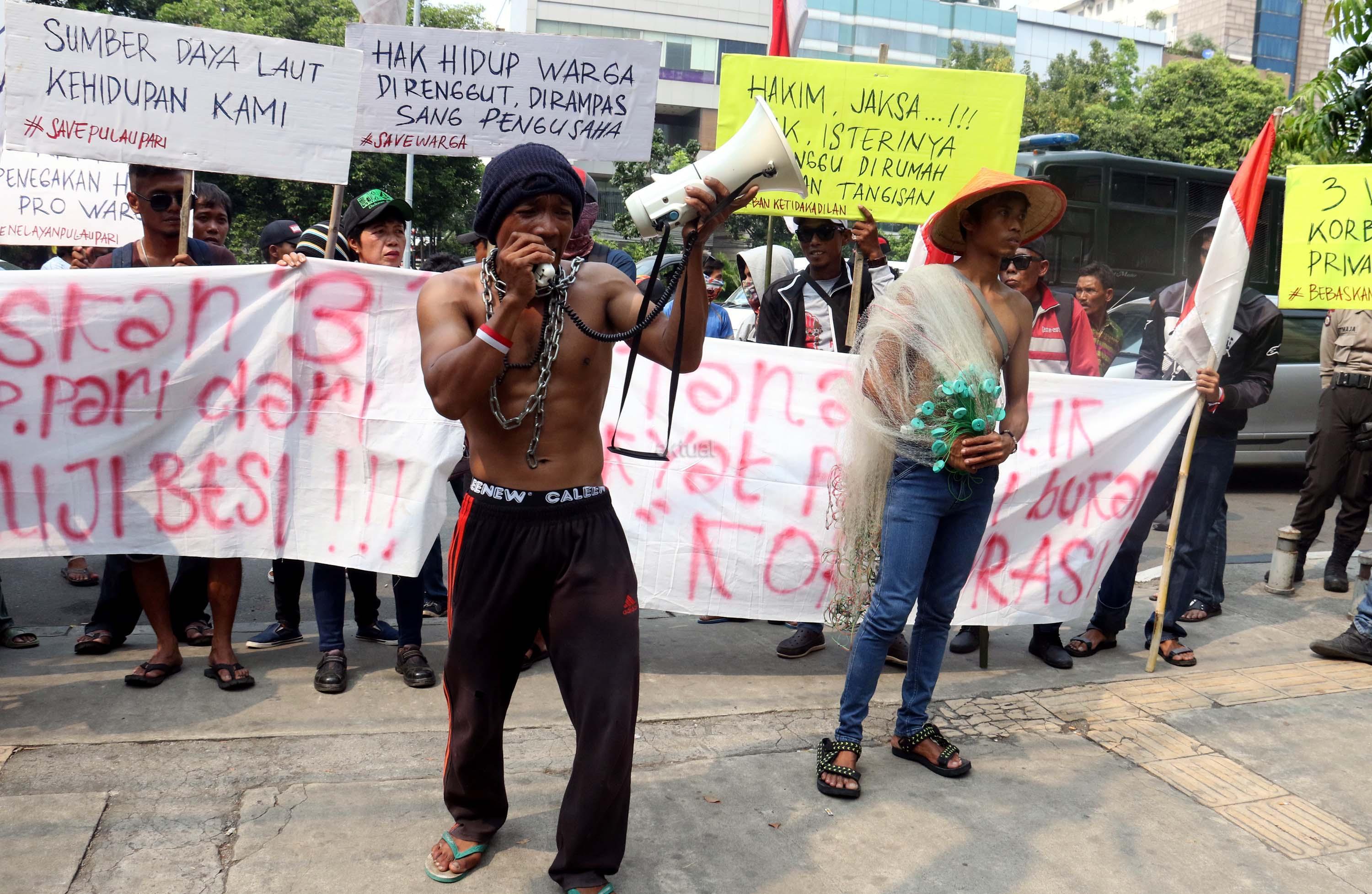Sejumlah nelayan dari Pulau Pari yang tergabung dalam Koalisi Selamatkan Pulau Pari melakukan aksi di depan PN Jakarta Utara, terkait sidang perdana 3 orang nelayan yang mengurus pantai perawan secara swadaya ditangkap dan dituduh melakukan pungliditangkap dan dituduh melakukan pungli, Jalan. Gajah Mada, Jakarta Pusat, Senin (5/6/2017). Dalam aksinya para nelayan menolak kriminalisasi 3 Nelayan Palau Pari dan mendesak hakim untuk membebaskan para nelaya segala tuntutan. AKTUAL/Munzir