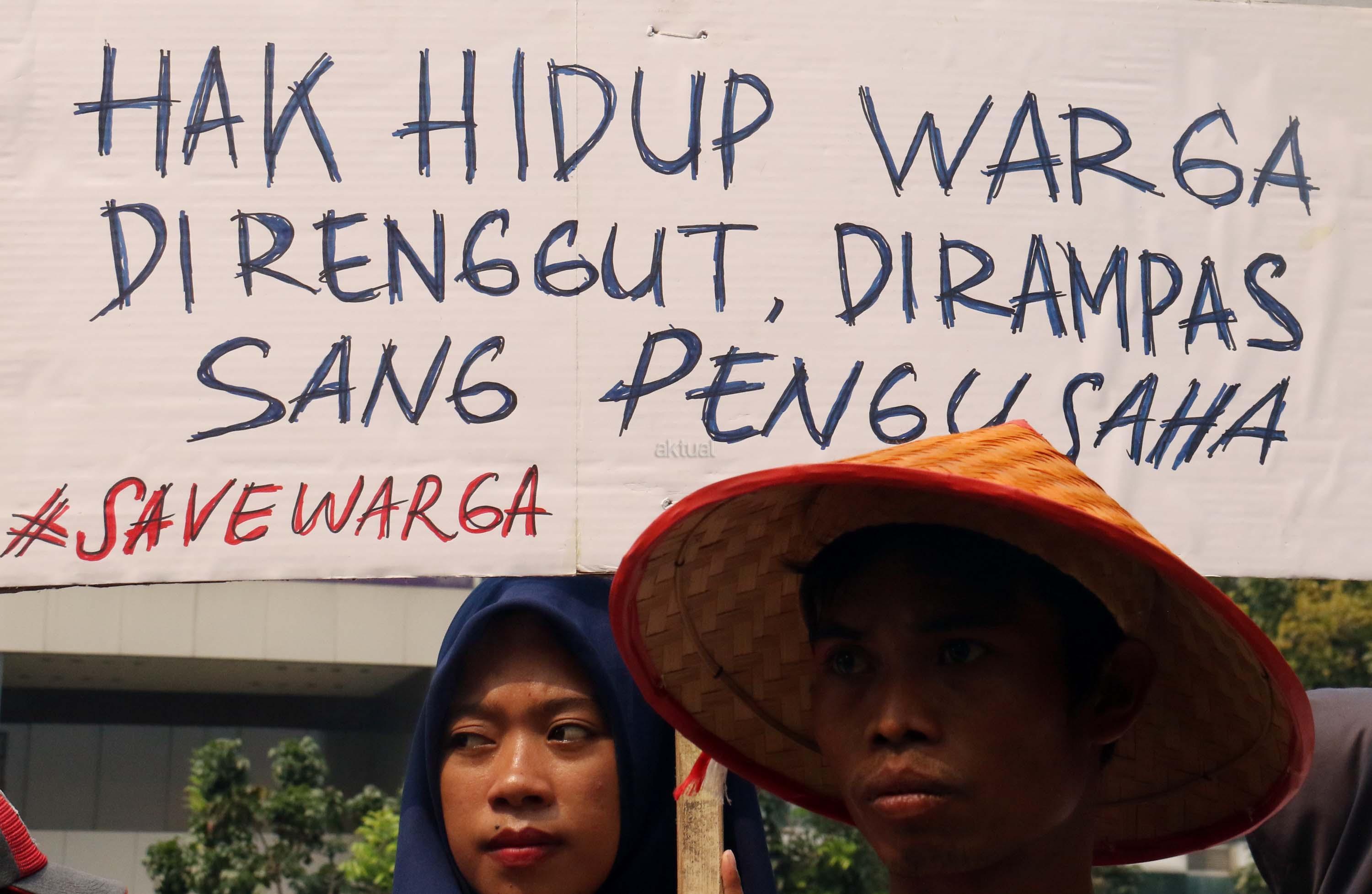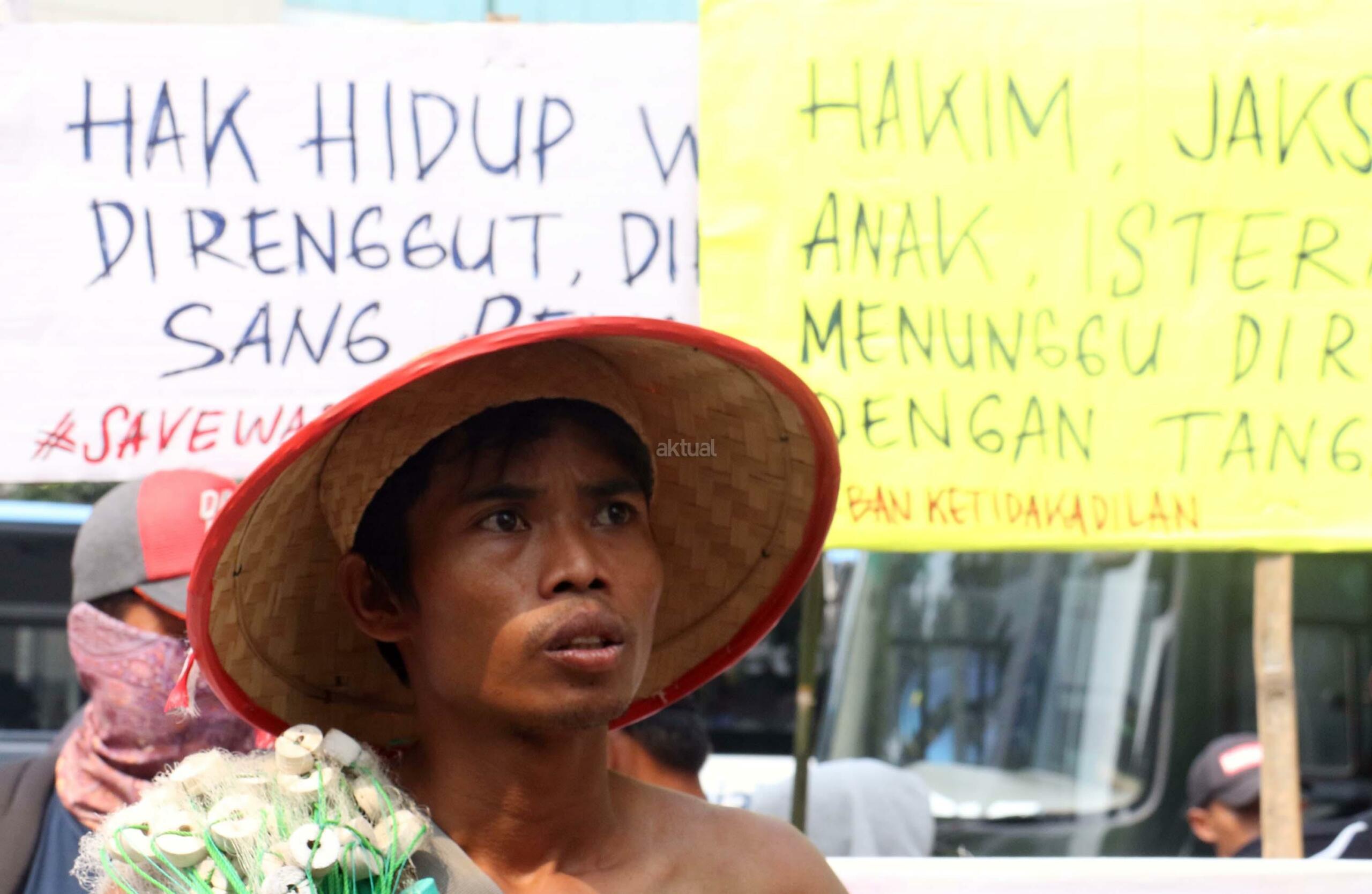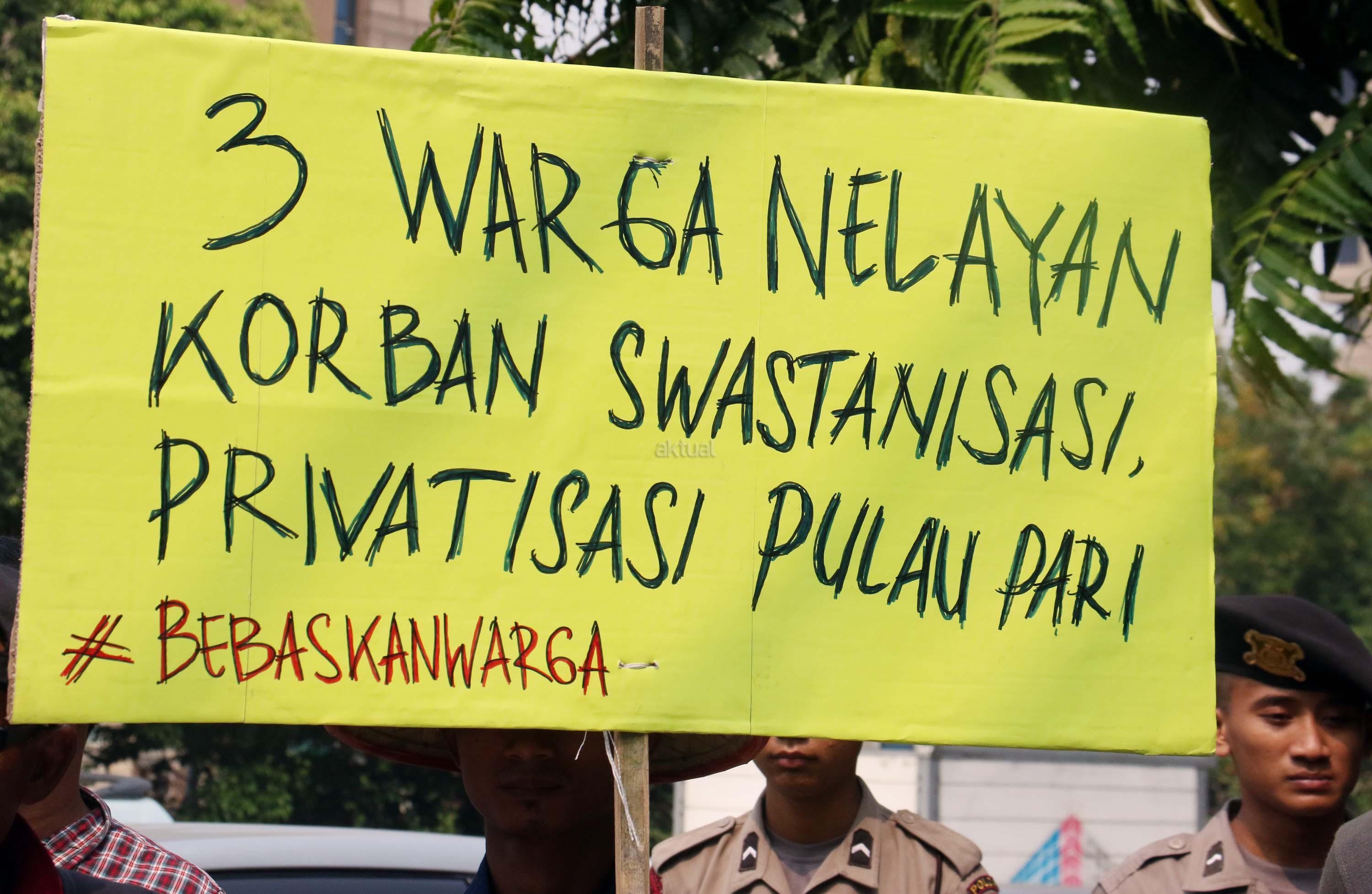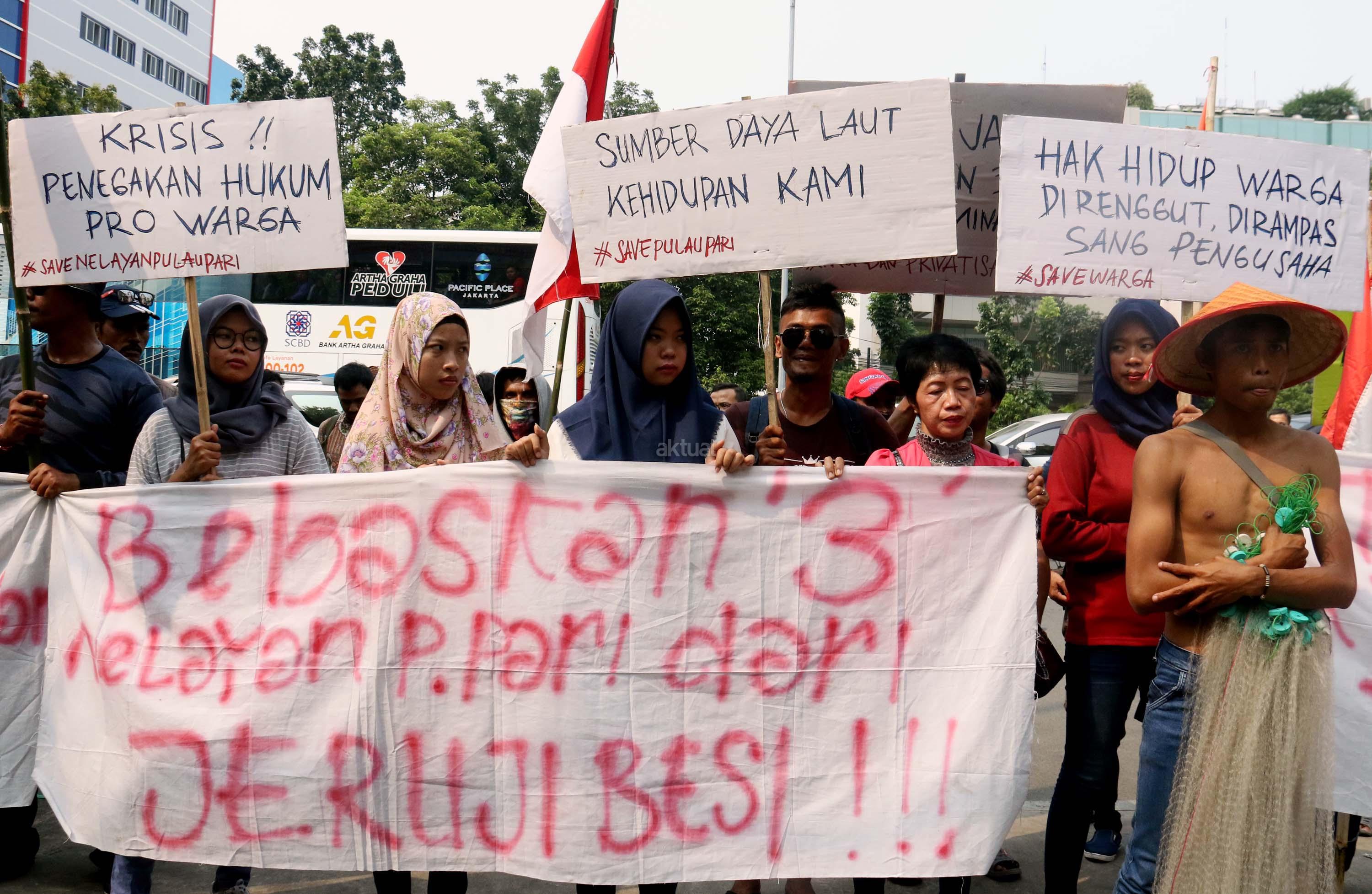 Sejumlah nelayan dari Pulau Pari yang tergabung dalam Koalisi Selamatkan Pulau Pari melakukan aksi di depan PN Jakarta Utara, terkait sidang perdana 3 orang nelayan yang mengurus pantai perawan secara swadaya ditangkap dan dituduh melakukan pungliditangkap dan dituduh melakukan pungli, Jalan. Gajah Mada, Jakarta Pusat, Senin (5/6/2017). Dalam aksinya para nelayan menolak kriminalisasi 3 Nelayan Palau Pari dan mendesak hakim untuk membebaskan para nelaya segala tuntutan. AKTUAL/Munzir