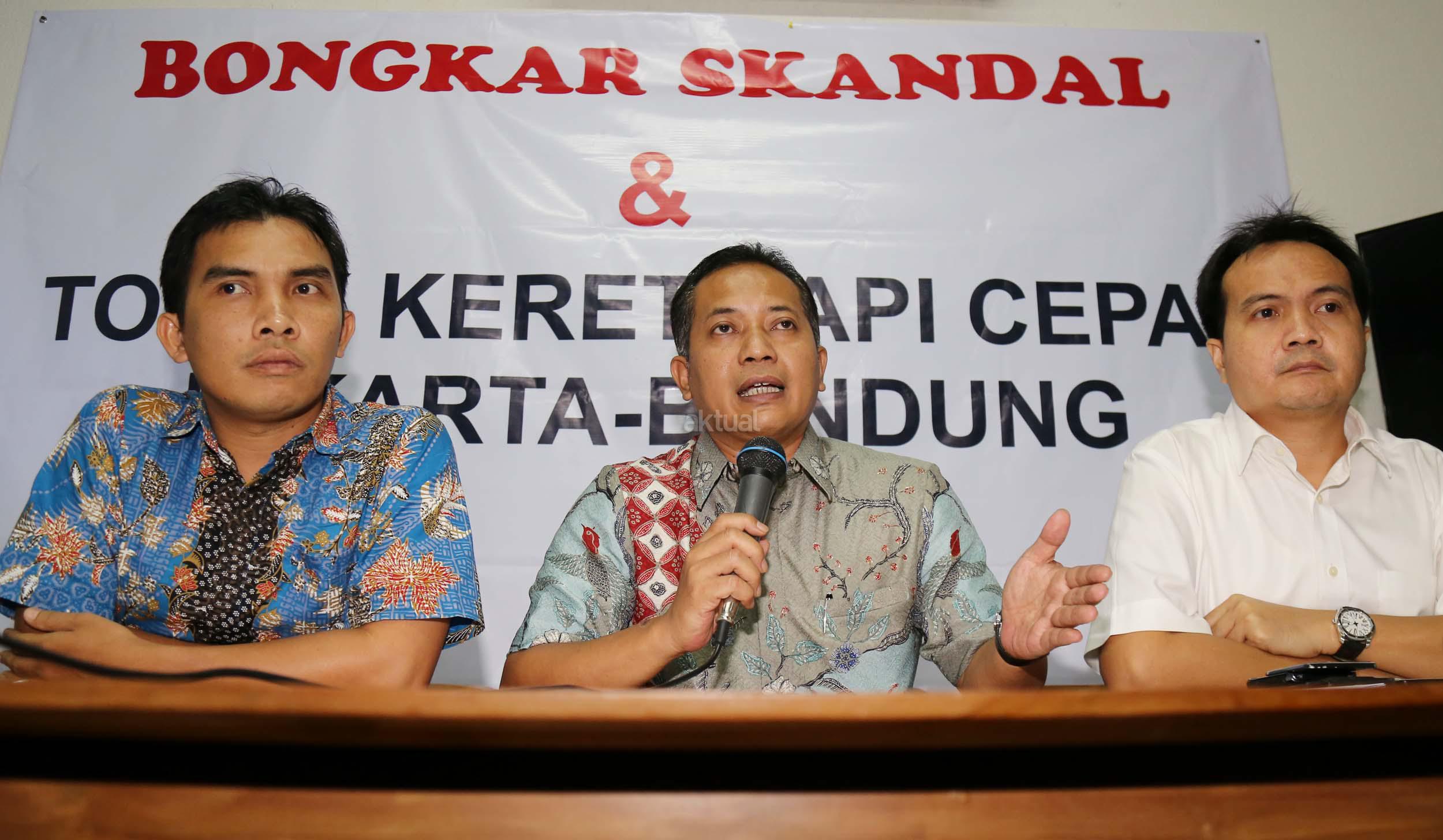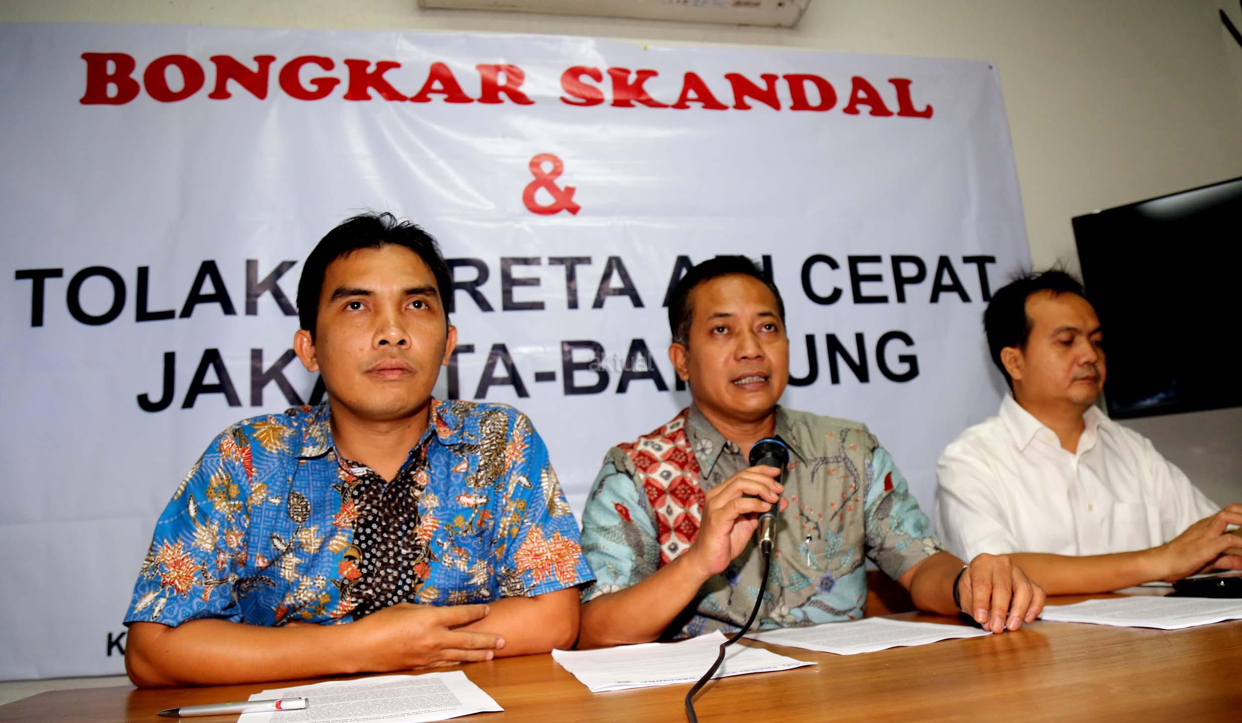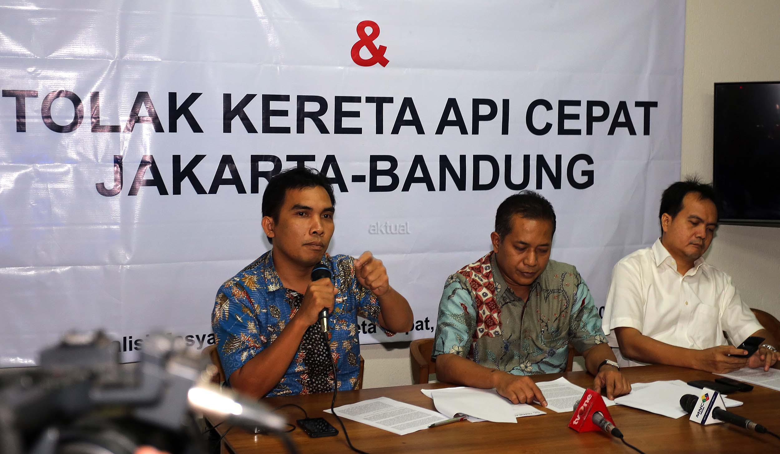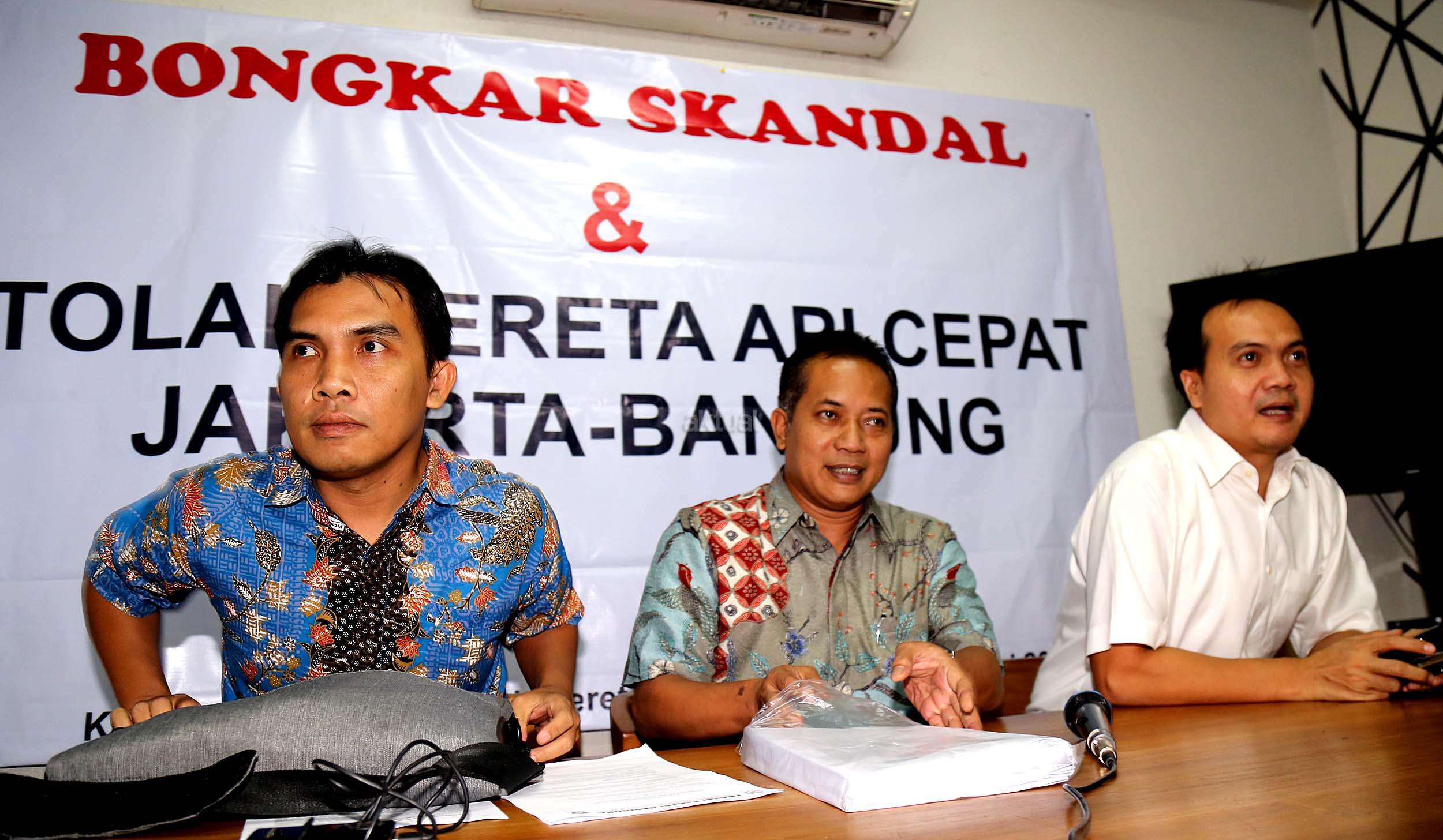 Kiri-kanan; Sekjen Konsorsium Pembaruan Agraria (KPA) Irwan Nurdin, Waketum Partai Gerindra Ferry J Juliantono, Ketua Prodem Andrianto yang tergabung dalam Koalisi Masyarakat Menolak Kereta Api Cepat Jakarta-Bandung, menyampaikan penolakan pembangunan kereta api cepat Tiongkok Jakarta-Bandung saat jumpa persnya di Jakarta, Rabu (10/2/2016). Dalam penolakan Koalisi Masyarakat Menolak Kereta Api Cepat Jakarta-Bandung mendesak dihentikannya proses pembangunan proyek ini, karena tidak sesuai dengan dan tidak ada dalam rencana tata ruang wilayah. Mereka juga meminta DPR segera memanggil pemerintah untuk menjelaskan secara rinci proyek kereta cepat ini dan membentuk panitia khusus dengan memanggil semua pihak yang terlibat.