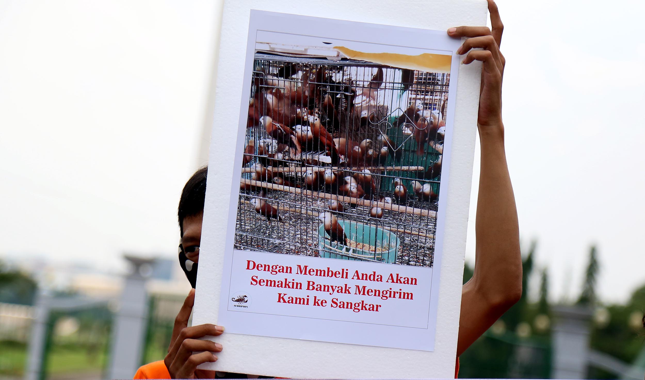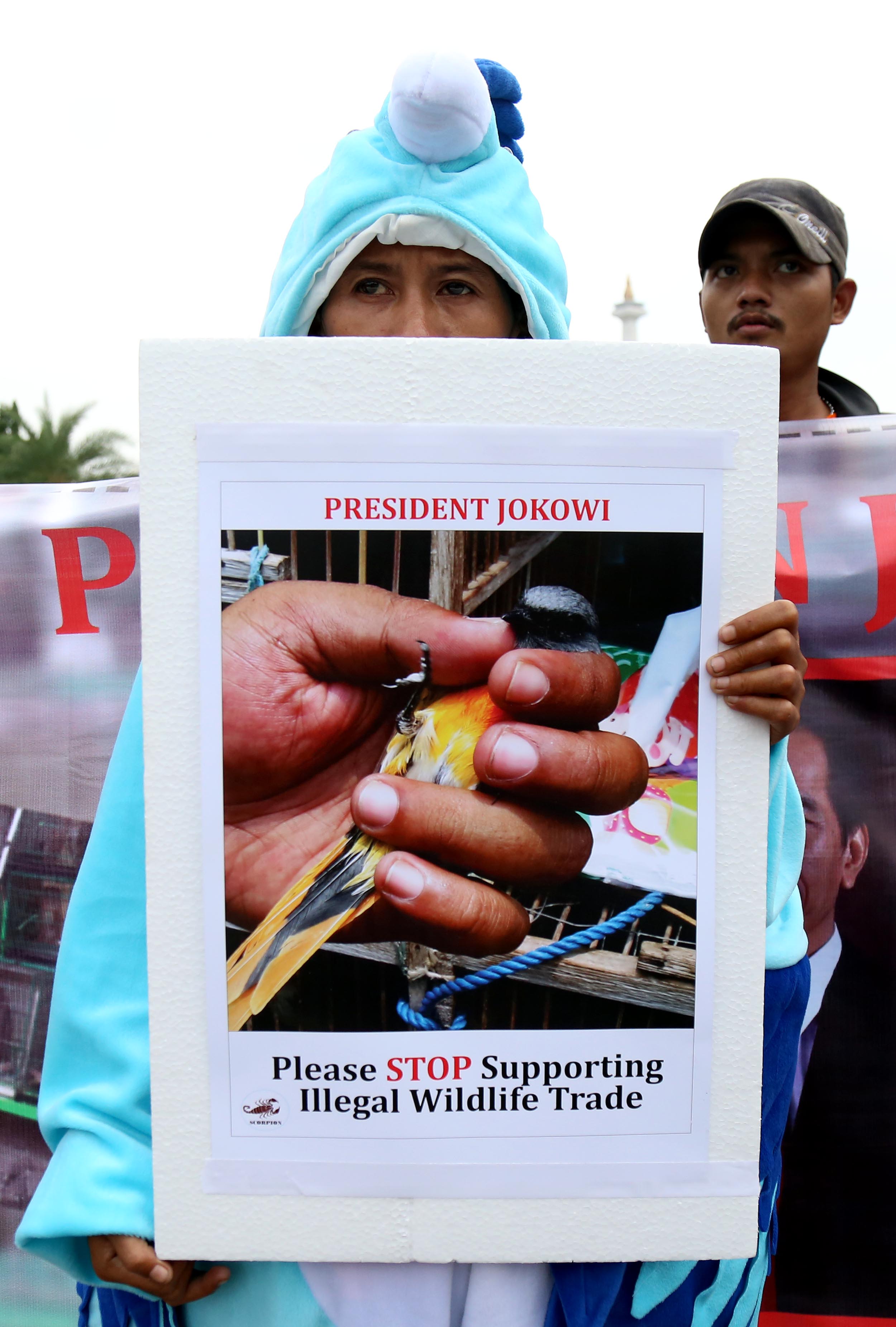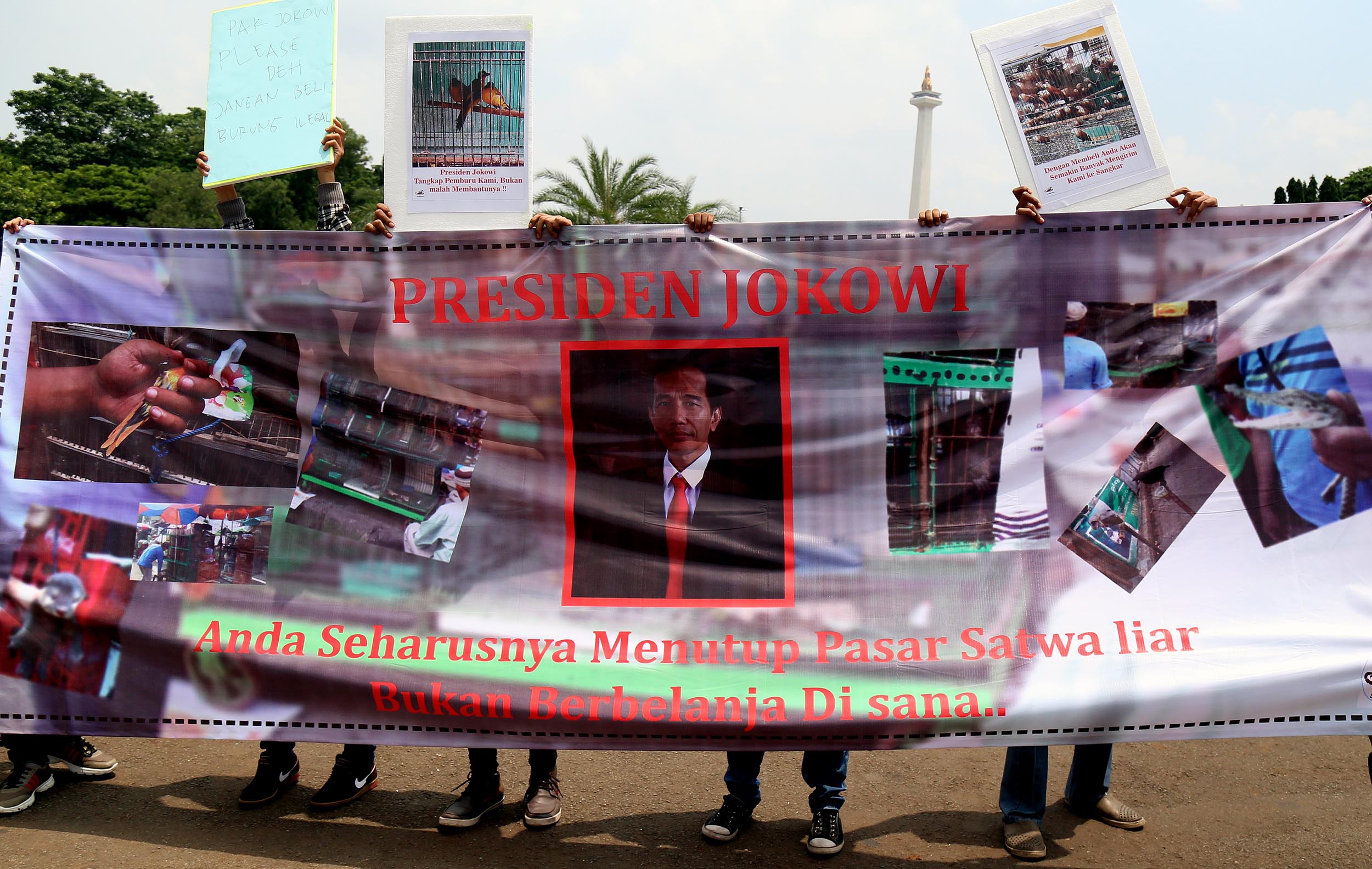Dalam aksinya Yayasan Scorpion Indonesia mendesak Presiden Jokowi untuk tidak membeli burung ilegal yang dijual dipasar gelap.